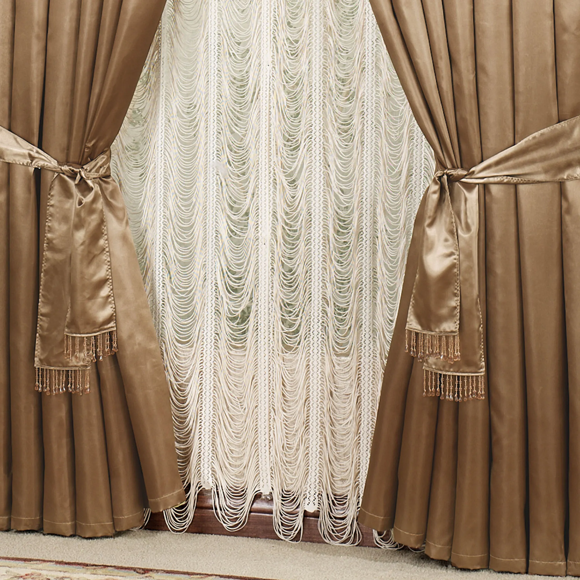 I purchased this set of of window coverings for our guest room all in Ruby with white shears that were embroidered. The color is beautiful, the make is exquisite and the window really sets of the feel of the luxury in the room when you walk in. I purchased the first set of these about 5 years ago in Rose Quartz with the waterfall valances and Sorrento Lace panels. These are in our formal living room and we still receive compliments on the look. Then, in our Master Bedroom I purchased Ruby and Pearl panels with the mixed waterfall valance and the Queens lace panels in Gold which is just wonderful. Finally, getting the okay from Hubby to redo the guest room, we chose the Ruby with no mixture and have not yet completed which top we are going to use - I have ordered 2. In ending, I just have to say, you cannot go wrong with these items. Your home will look rich and complete, elegant yet warm and easy take care, because everything is machine washable.