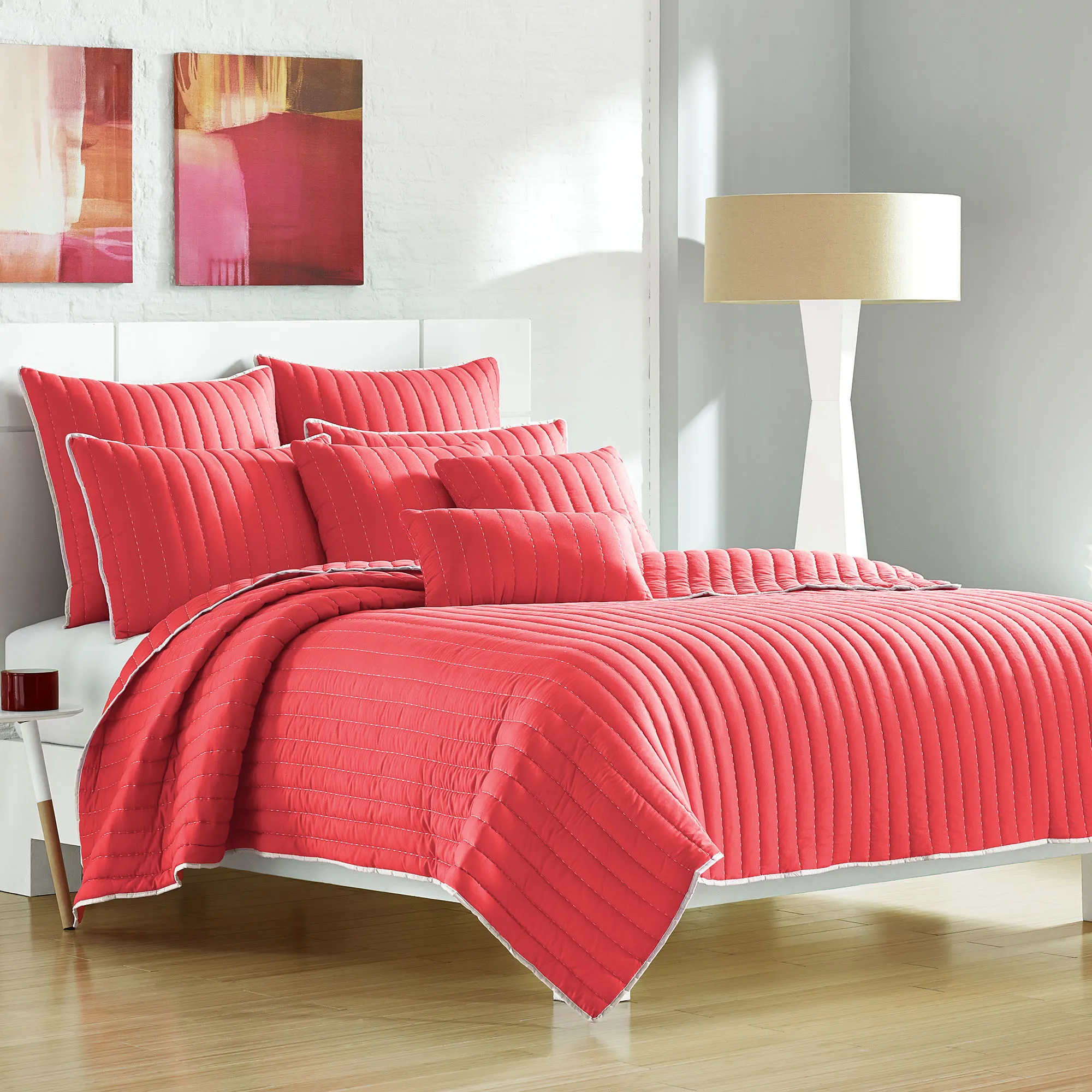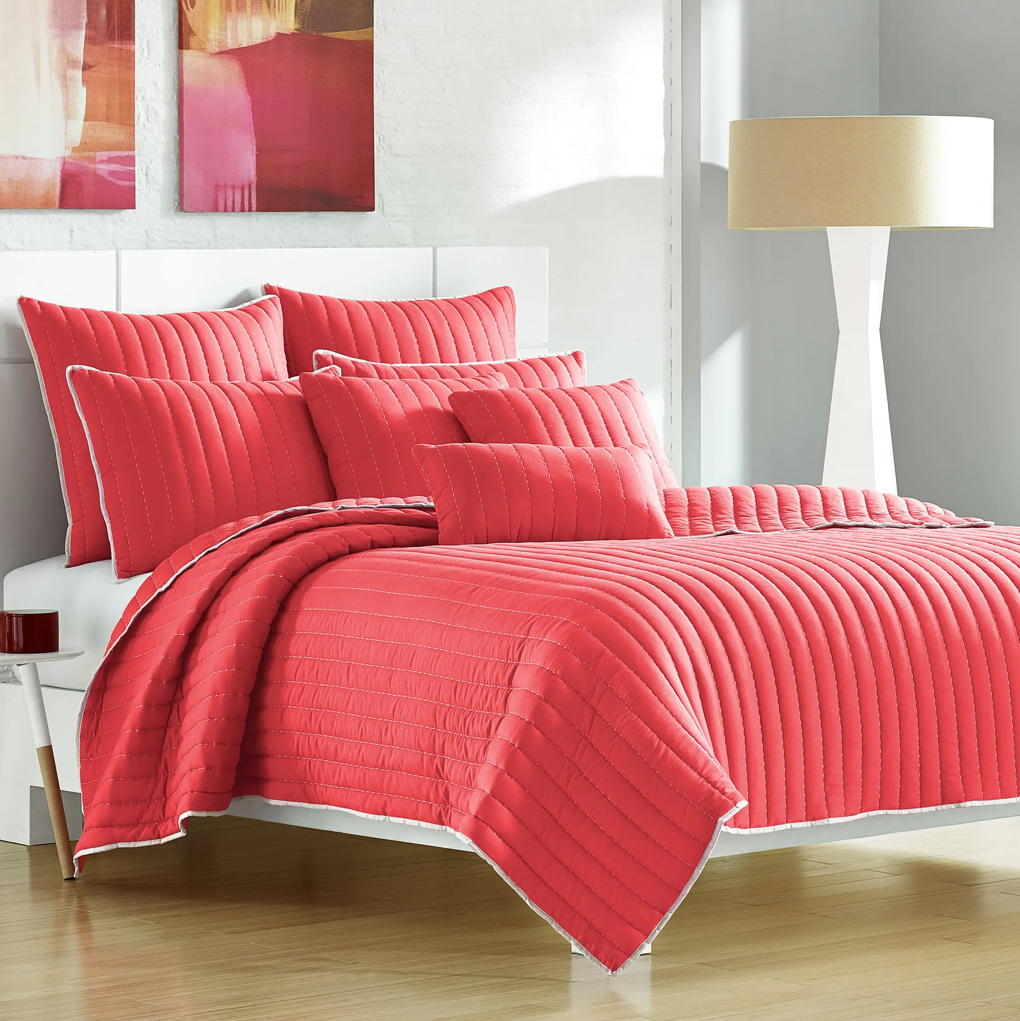 The solid color Portland Quilted Coverlet from J. Queen Bold looks sleek and modern. Polyester microfiber coverlet is channel-quilted with decorative stitching. Reverse is the same as the front. Coverlet fill is polyester. Washable. Imported.