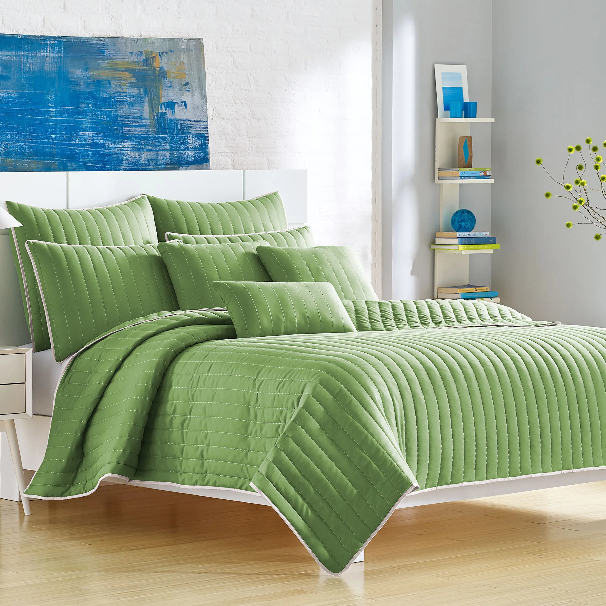 The solid color Portland Bedding looks sleek and modern. Polyester microfiber ensemble is from J. Queen Bold. Choose Jade, Peridot, Red, or Yellow.