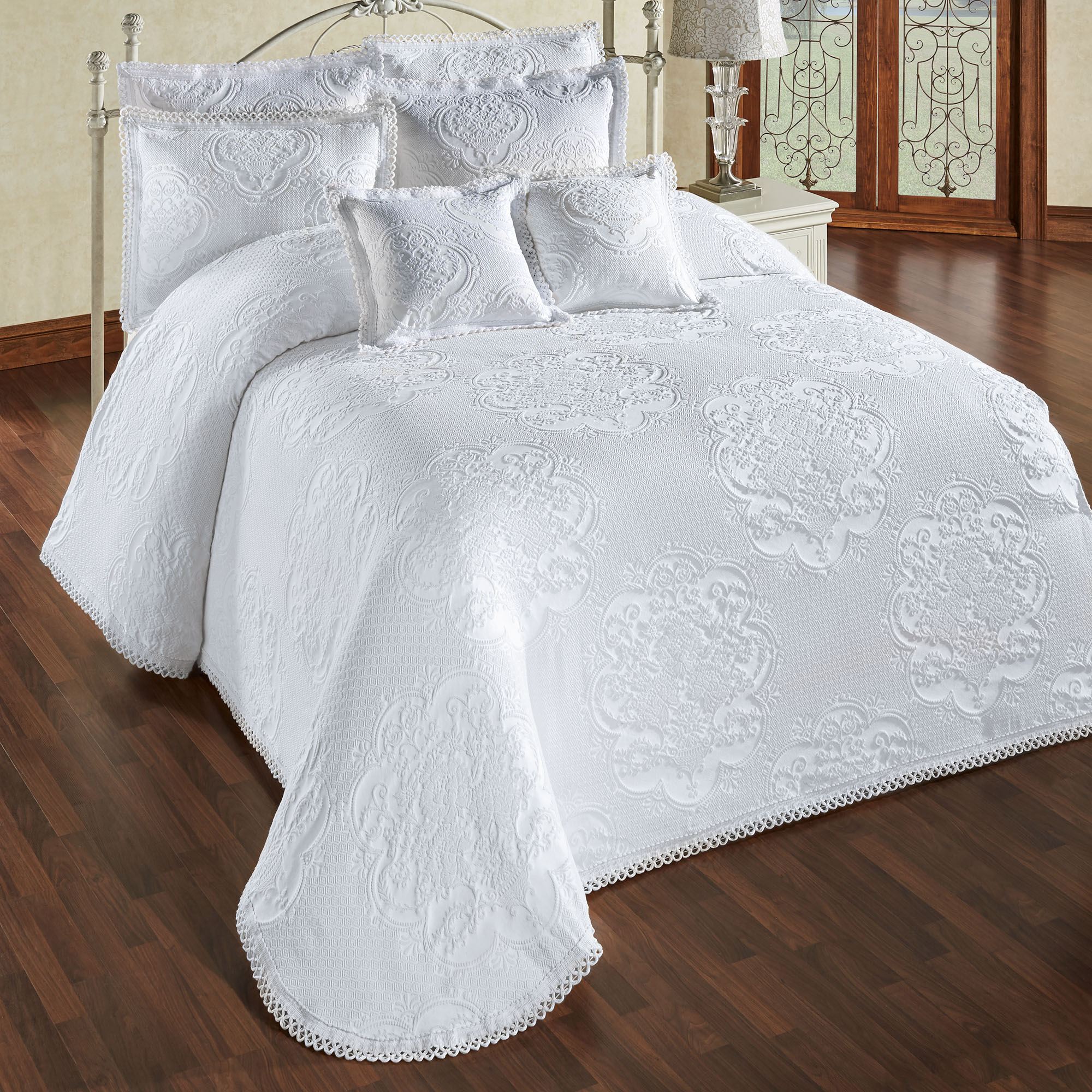 The throw-style Portofino White Woven Matelasse Grande Bedspread is intricately styled with elegant medallions, diamond designs, and decoratively trimmed edges. The oversized, yarn-dyed cotton/polyester bedspread is white with woven matelasse motifs and a 24" drop. Choose Grande Full, Grande Queen, Grande King, or Grande Cal King. Machine washable.