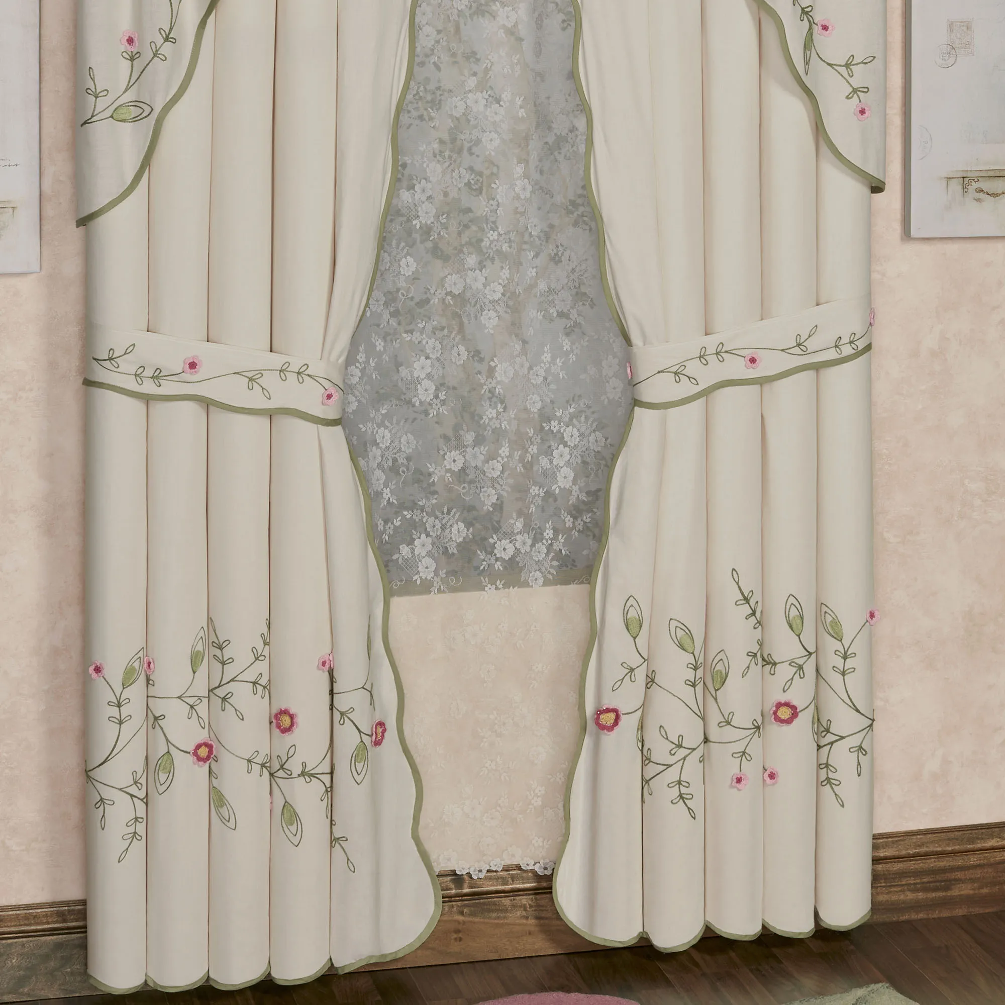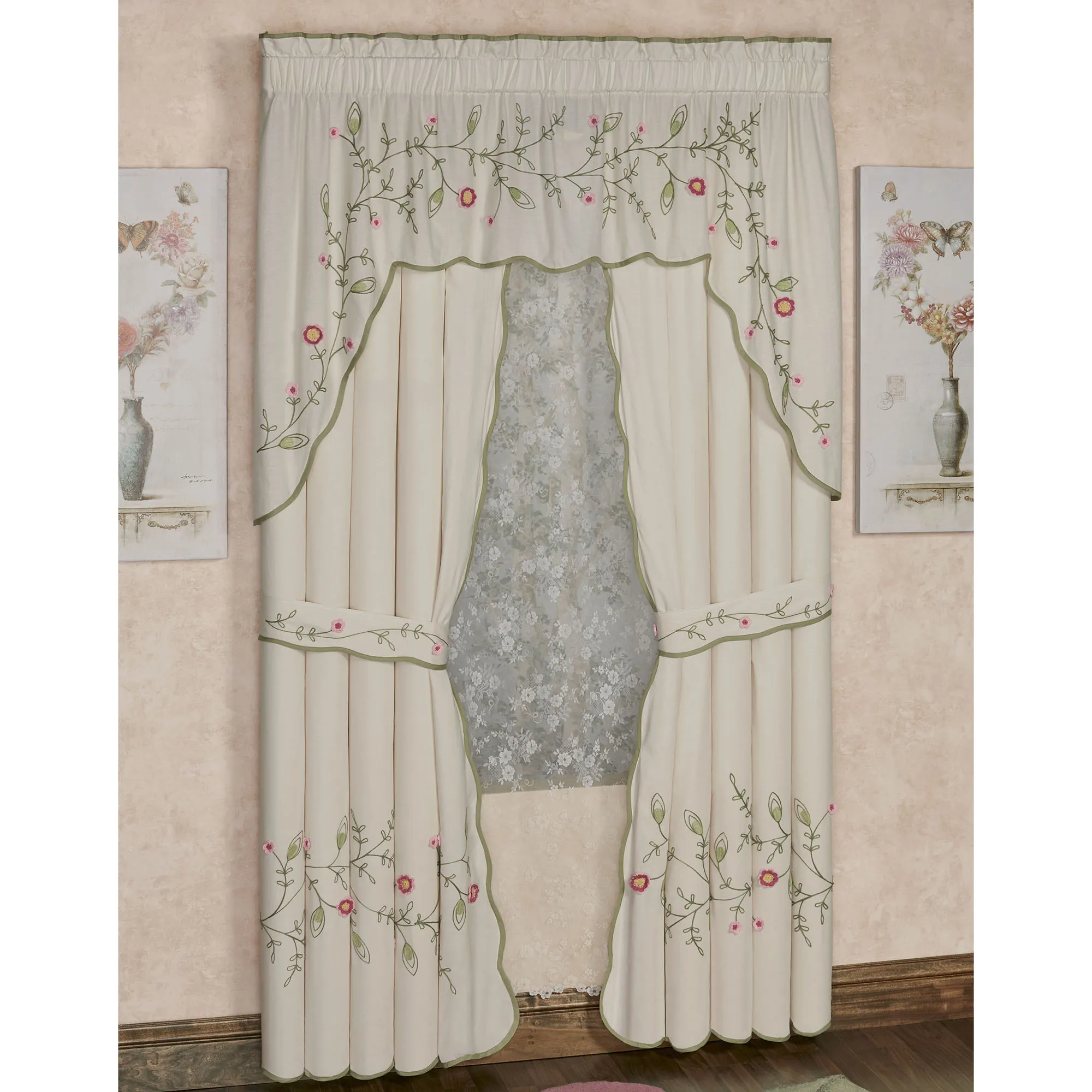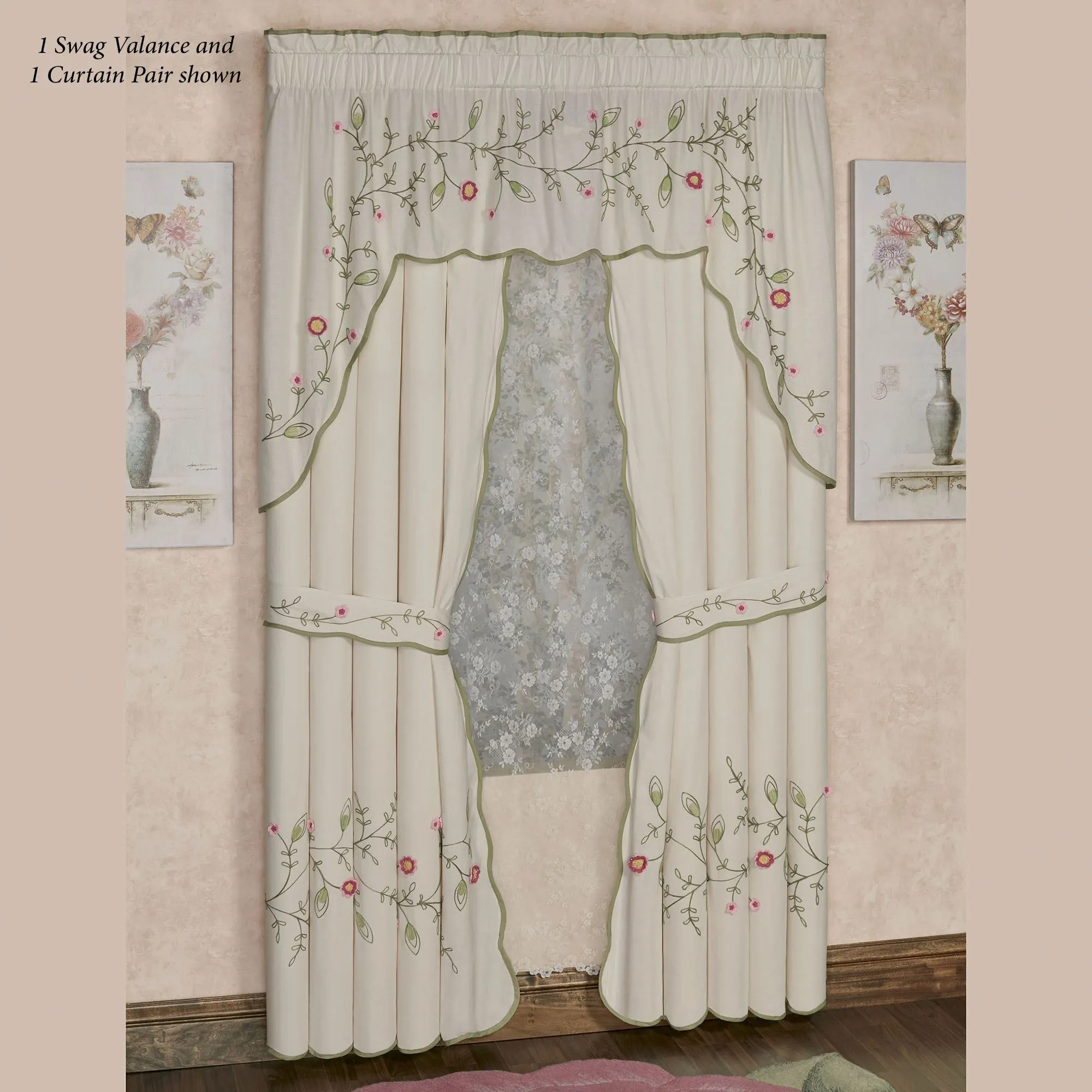 The Posy Floral Window Treatment will blossom with elegance and grace in your room. This quaint cotton window treatment features a vining floral and leaf motif in chain stitch embroidery with crochet appliques. Flowers and vines are in pink, mauve, misted yellow, basil, and willow green on a natural ground. Lined window treatment has bound edges and 3" rod pockets. Specify Curtain Pair or Contour Swag Valance. Curtains have scalloped bottom and inside edges and include tiebacks. Contour Swag Valance has scalloped bottom edges. Machine washable. Imported. The curtain pair width is the total width of two panels together.