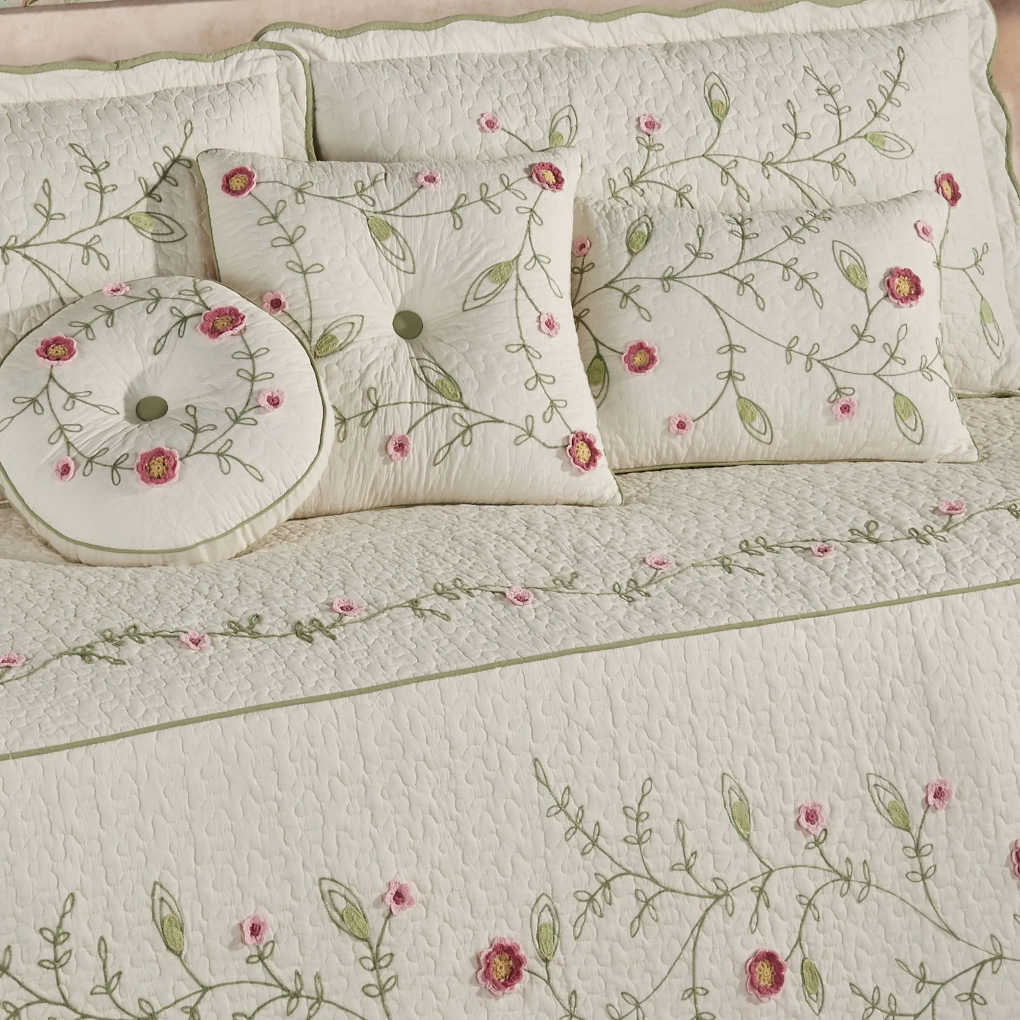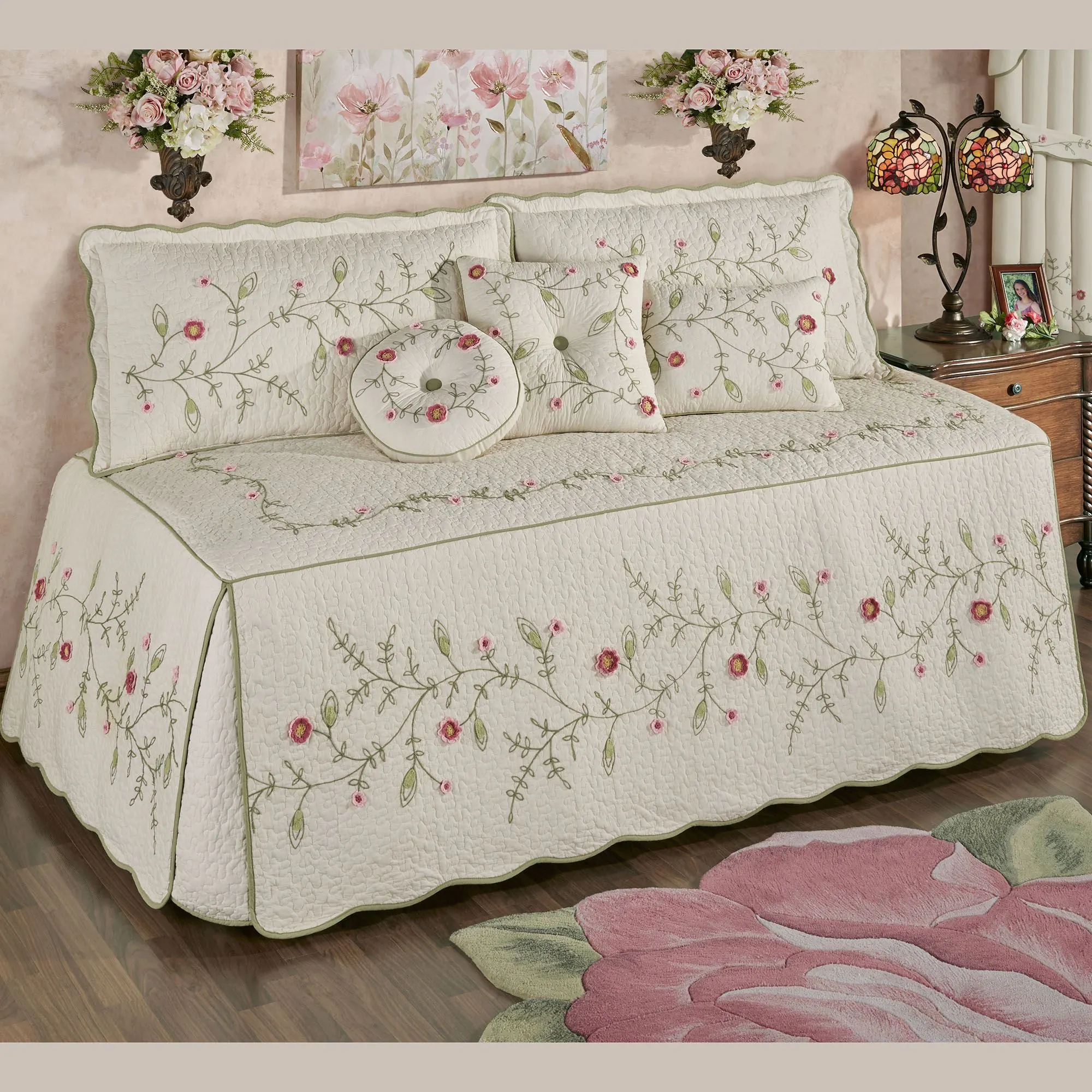 Radiant Posy blossoms flourish with elegance and grace. This quaint cotton daybed bedding ensemble features a vining floral and leaf motif in chain stitch embroidery with crochet appliques. Colors include pink, mauve, misted yellow, basil, willow green, and natural.