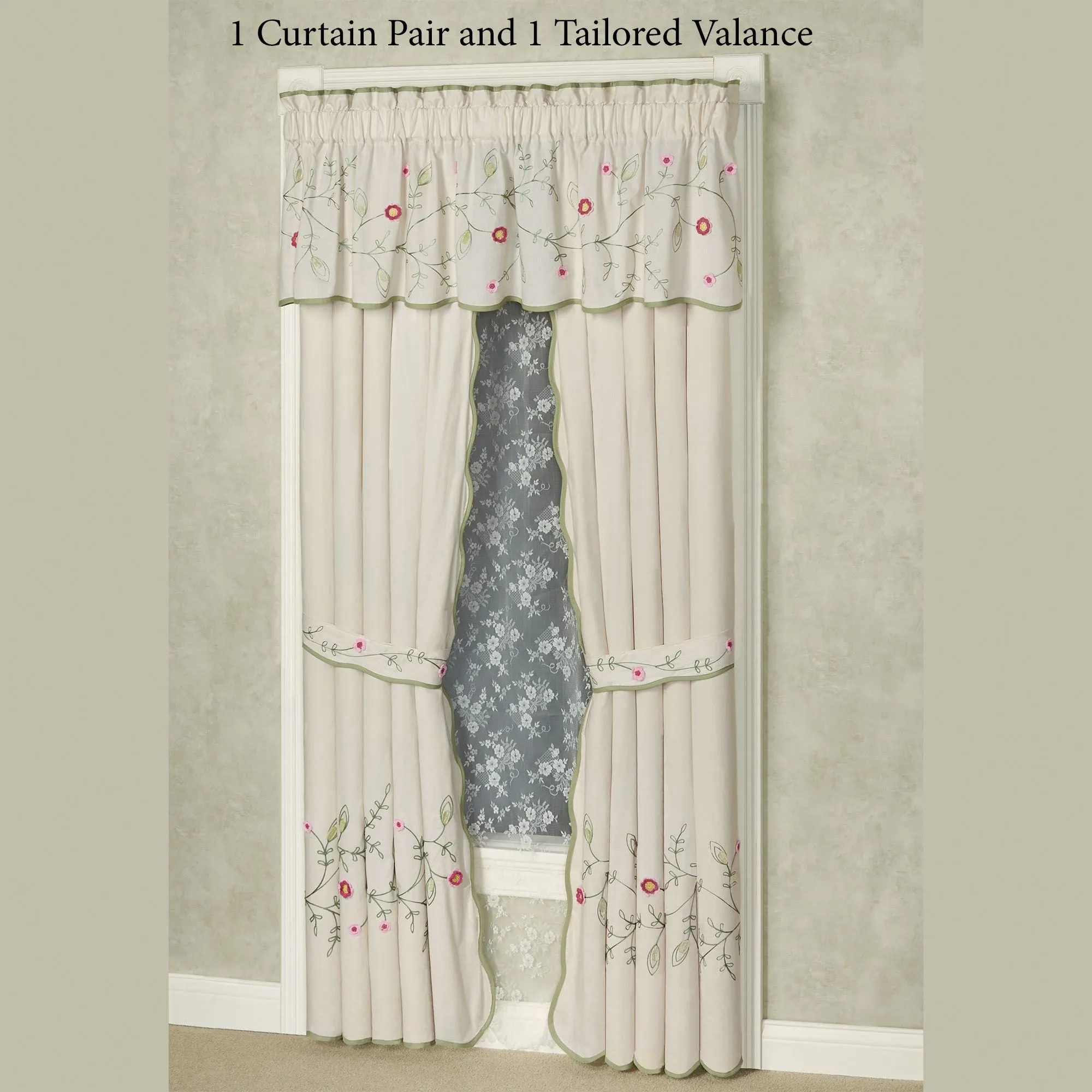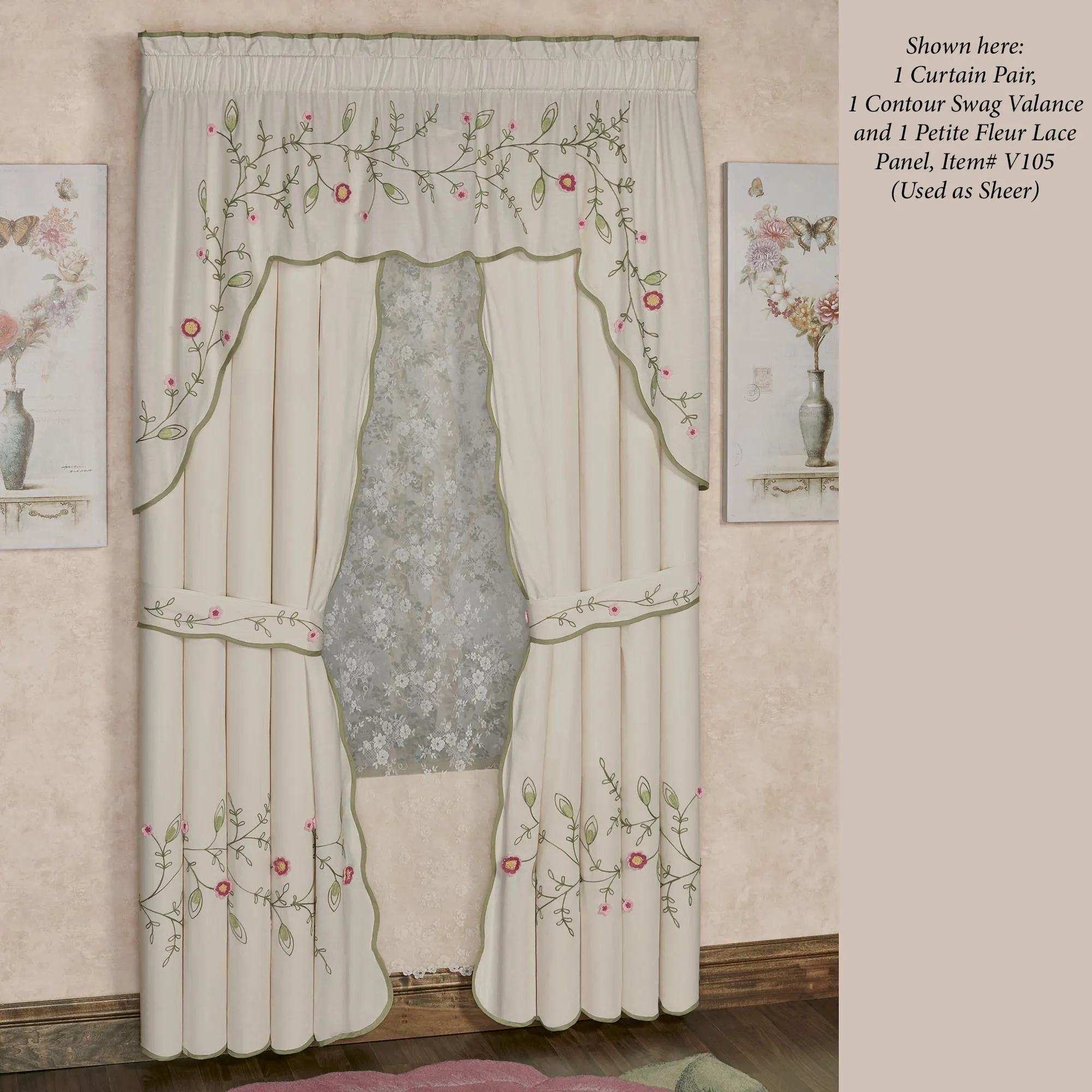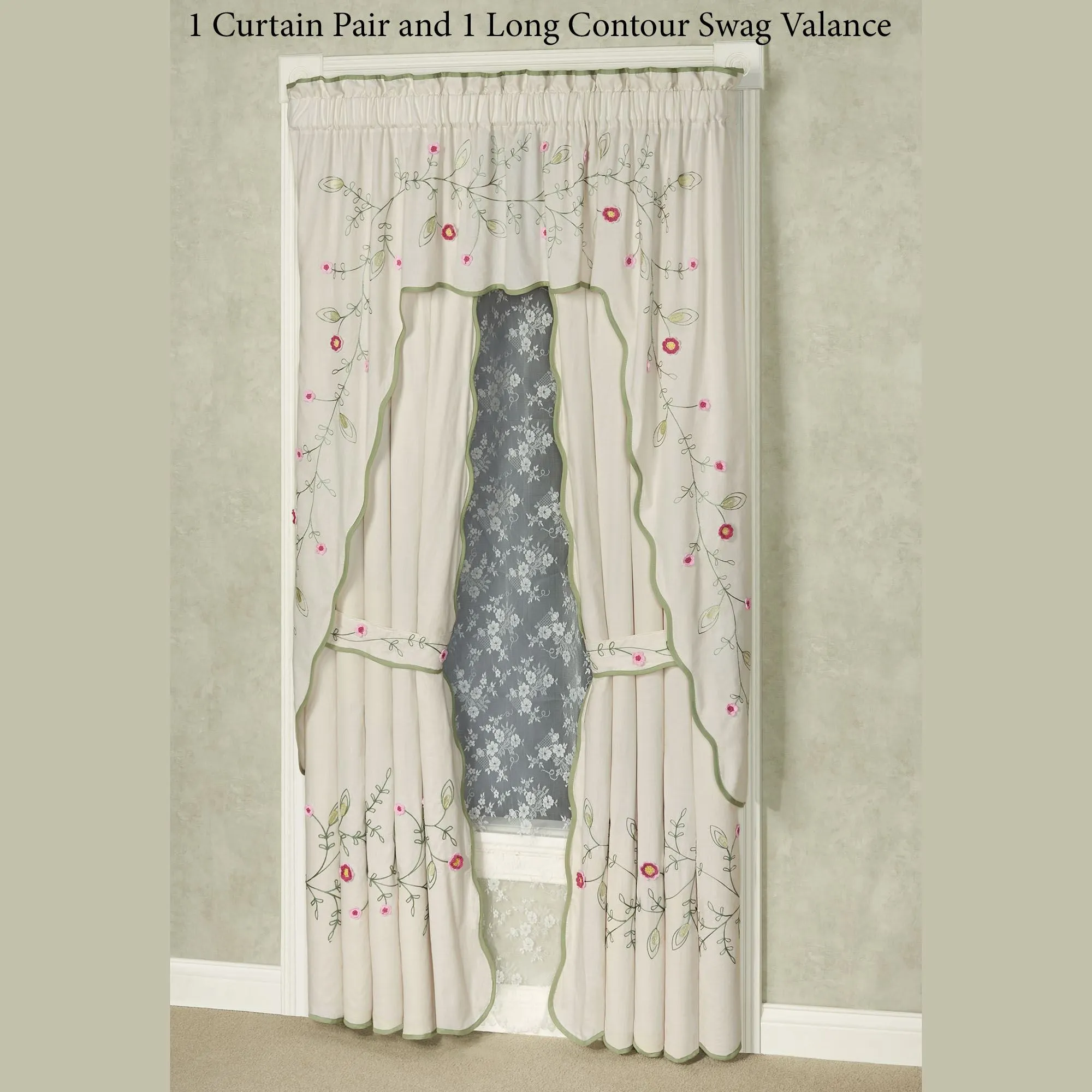 Lined Window Treatment has crochet/chain stitch embroidery, bound edges, and 3" rod pockets. Curtains have scalloped bottom and inside edges and include tiebacks. Contour Swag Valance has scalloped bottom edges. Available in two lengths. Tailored Valance has a scalloped bottom edge.