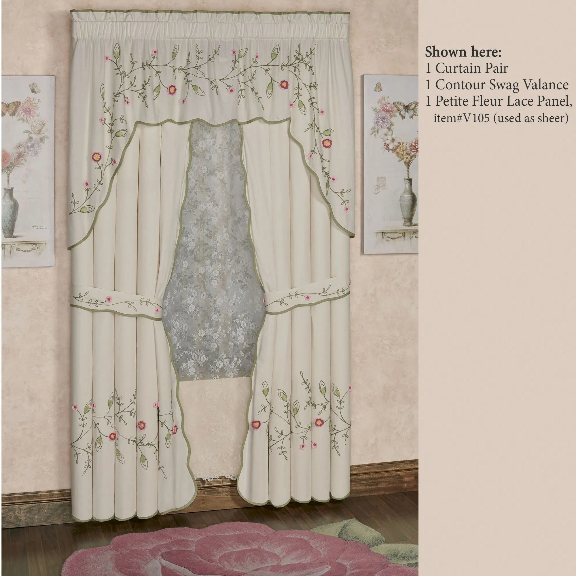 Lined Window Treatment has crochet/chain stitch embroidery, bound edges, and 3" rod pockets. Curtains have scalloped bottom and inside edges and include tiebacks. Contour Swag Valance has scalloped bottom edges. Available in two lengths. Tailored Valance has a scalloped bottom edge.