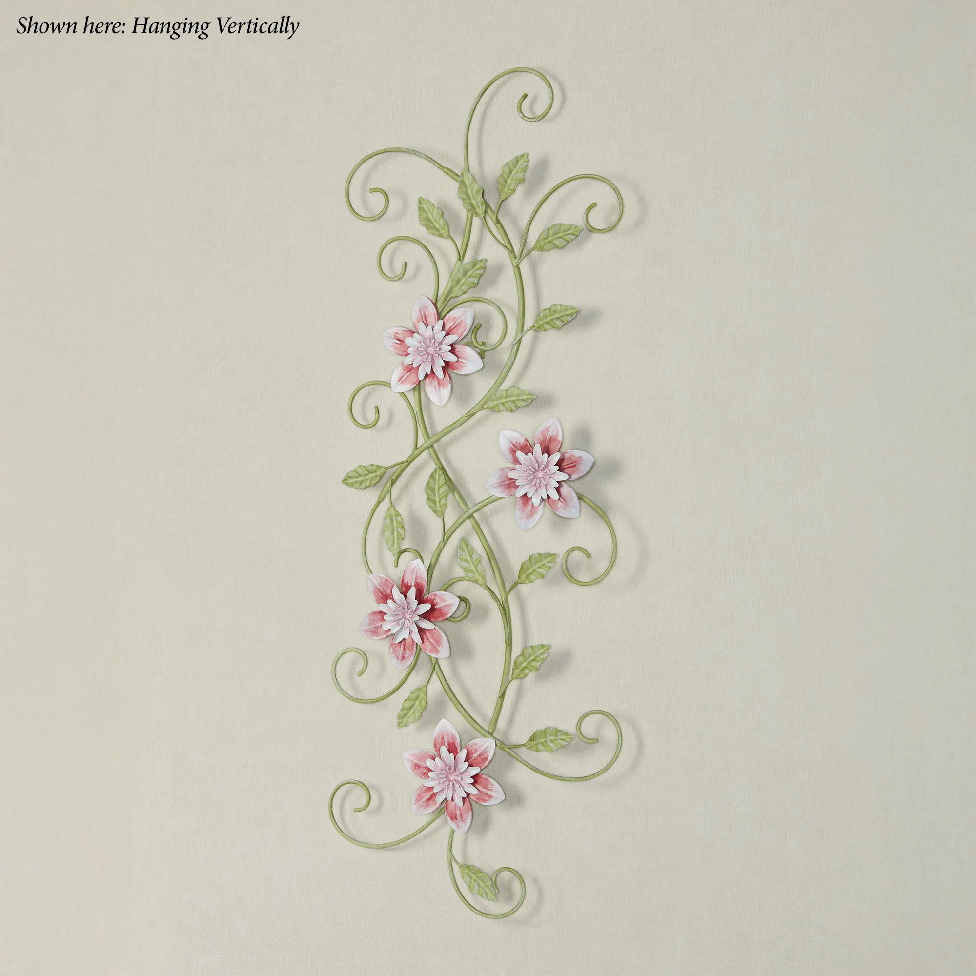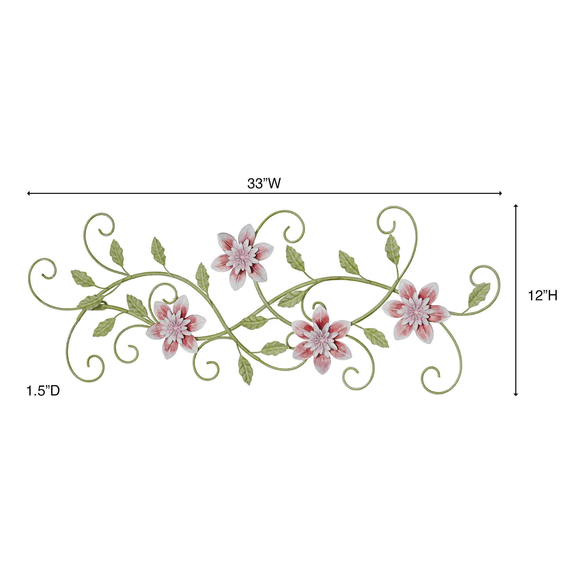 The Posy Floral Vine Wall Art blossoms with whimsy and allure. With an openwork design, the handpainted metal wall decor features scrolling vines, green leaves, and layered blooms in light and dark pink hues. Floral wall art may hang horizontally or vertically. Measures 33"Wx1.5"Dx12"H.