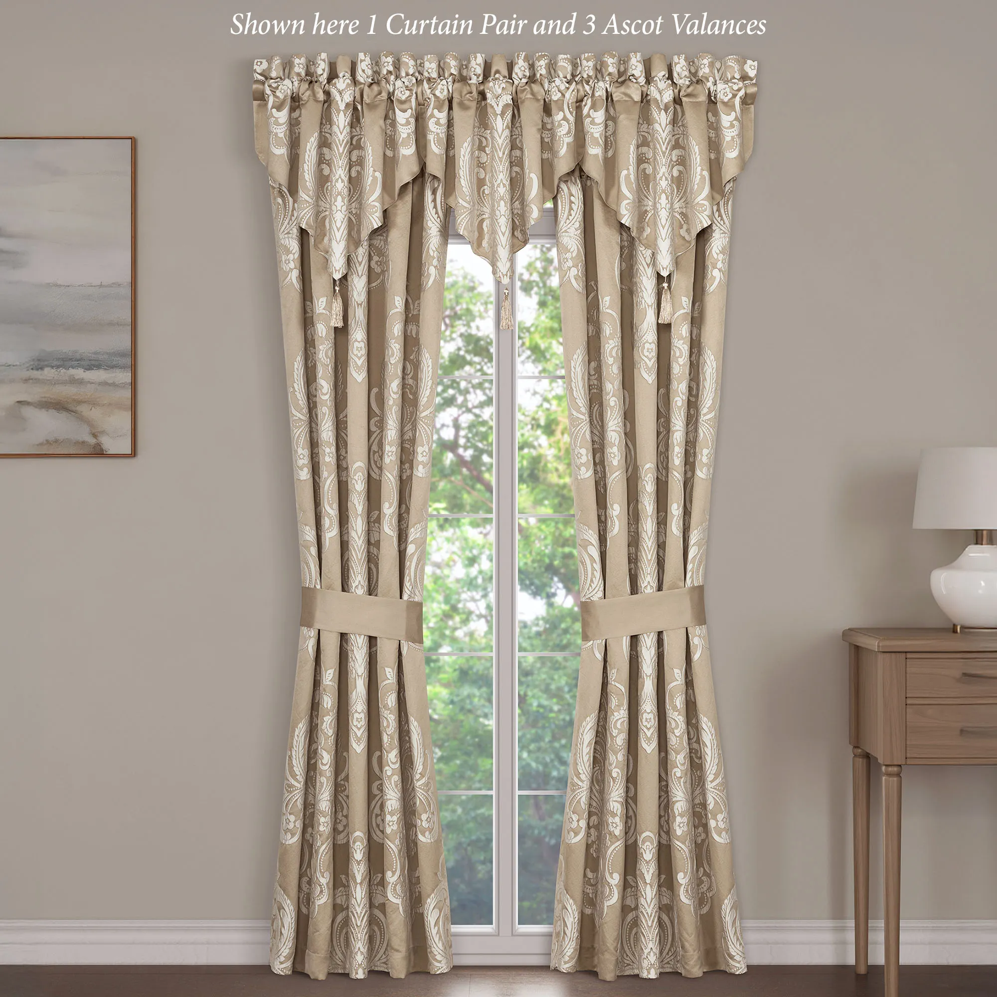 Lined Window Treatments have damask and tailored edges. Wide Curtain Pair has a 3" rod pocket and includes tiebacks. Each Ascot Valance has a tassel on the end. Rod pocket is 3.25".