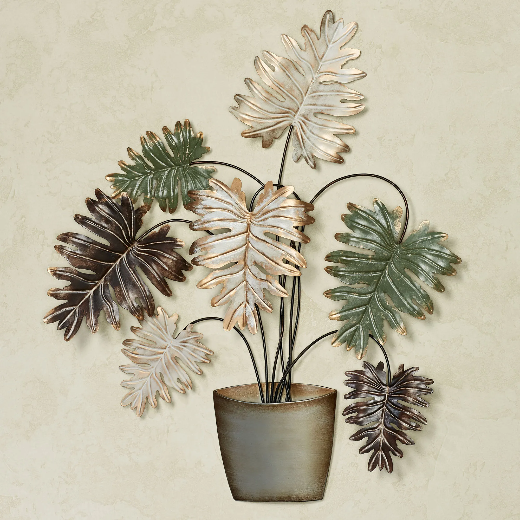 Plant the Potted Palms Wall Art in any indoor tropical display. Made of metal, this handpainted wall art sculpture features palm leaves in metallic shades of bronze, gold, and green with white brushing. The pot has an aged silver finish. Measures 24"Wx2.5"Dx29"H.