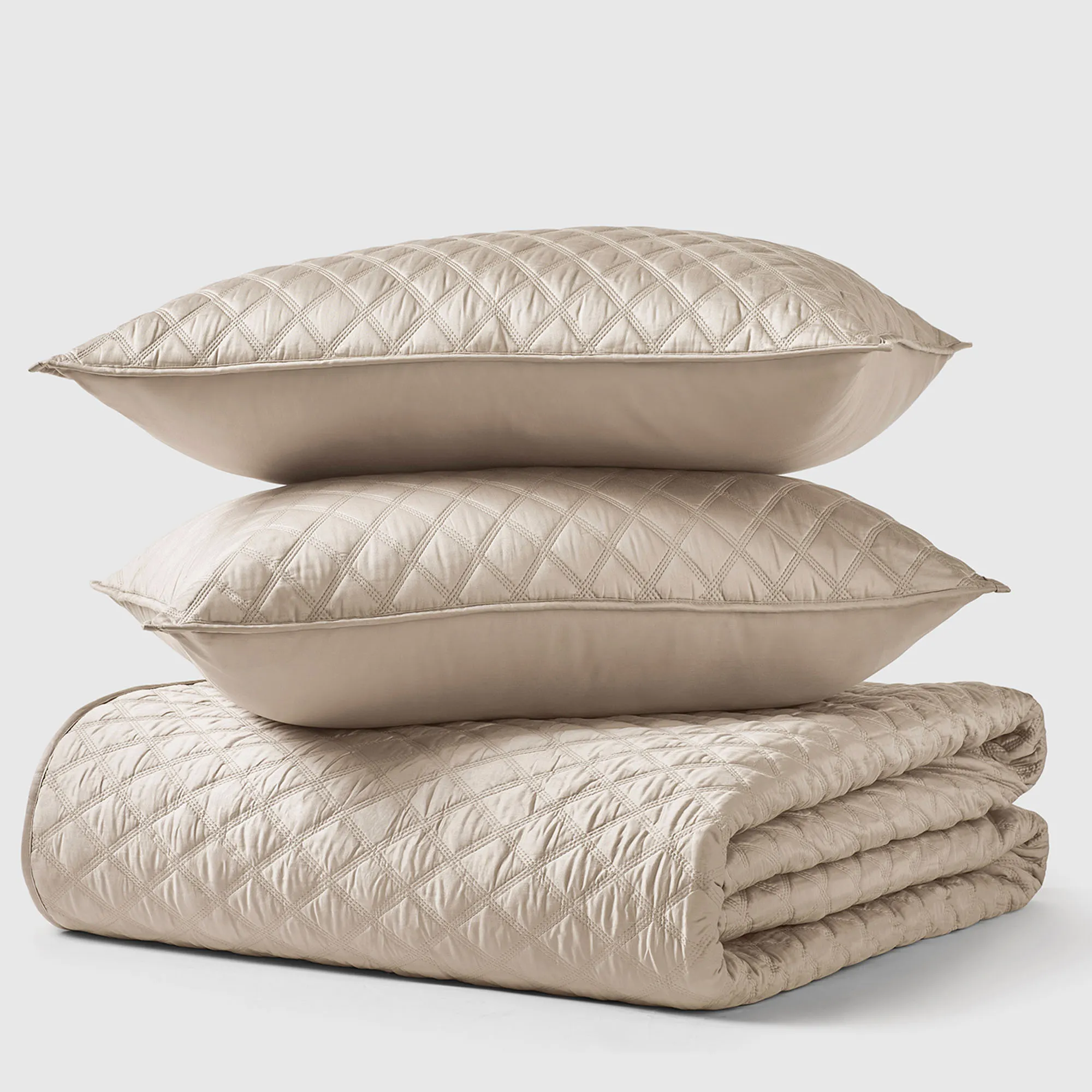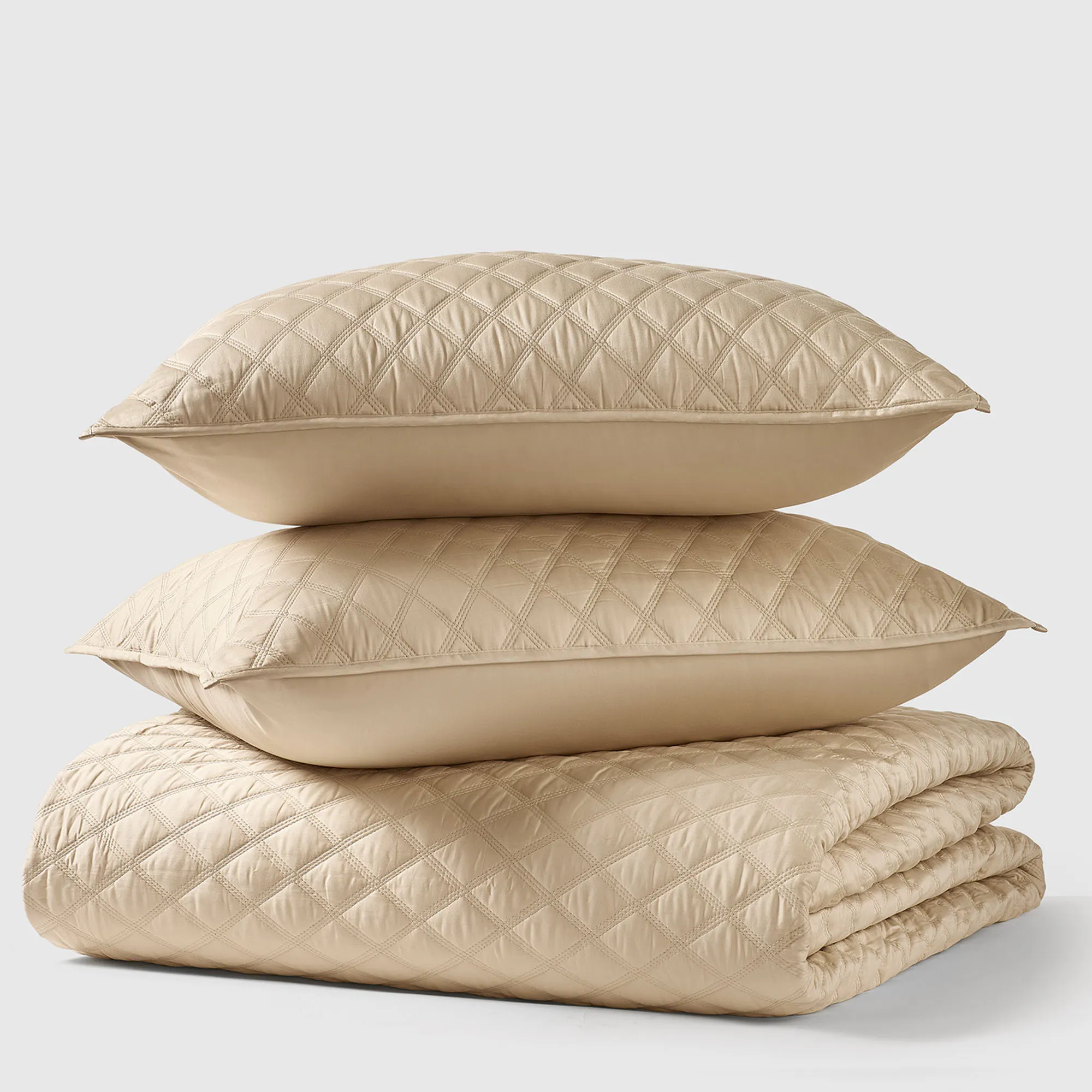 • Solid color, cotton sateen quilt is oversized