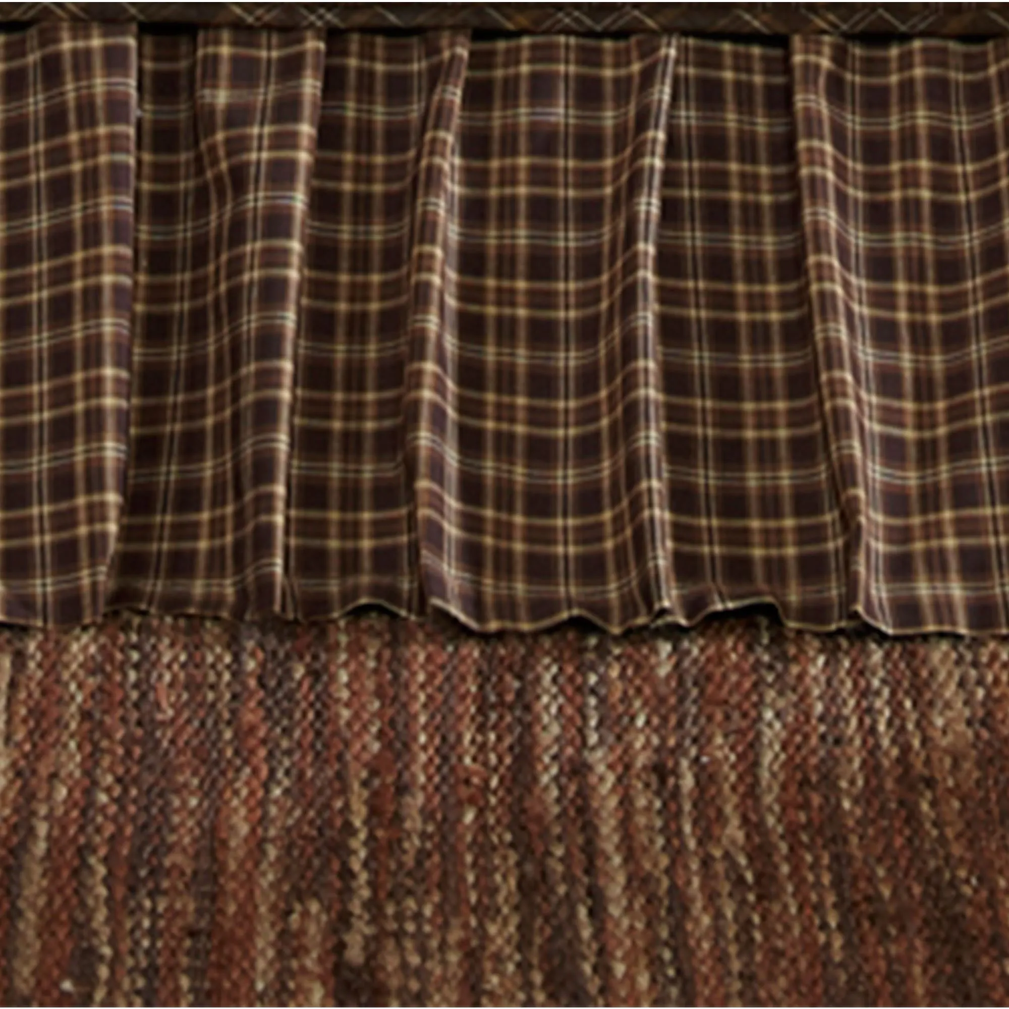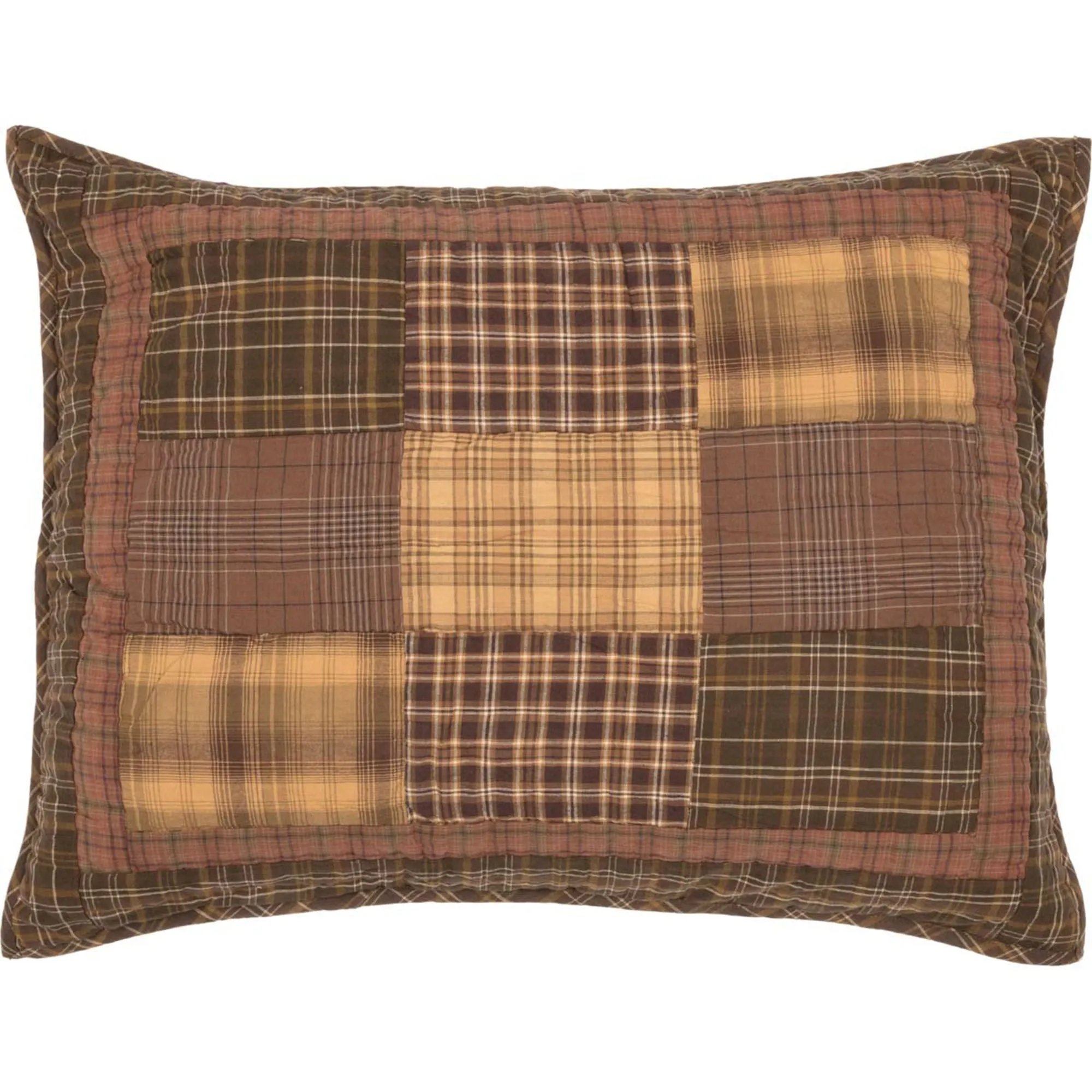Surround yourself in the warm rustic comfort of the Prescott Bedding. Hand-quilted with stitch-in-the-ditch and echo quilting, the machine-pieced, pure cotton ensemble features a classic patchwork block design filled with various plaid motifs. Deep shades of brown, cocoa, mahogany, caramel, ivory, pale olive, and light gold fill the design with timeless grace. Quilt backing, bedskirt, and window items have a coordinating chocolate, ivory, brown, and saddle brown plaid.
