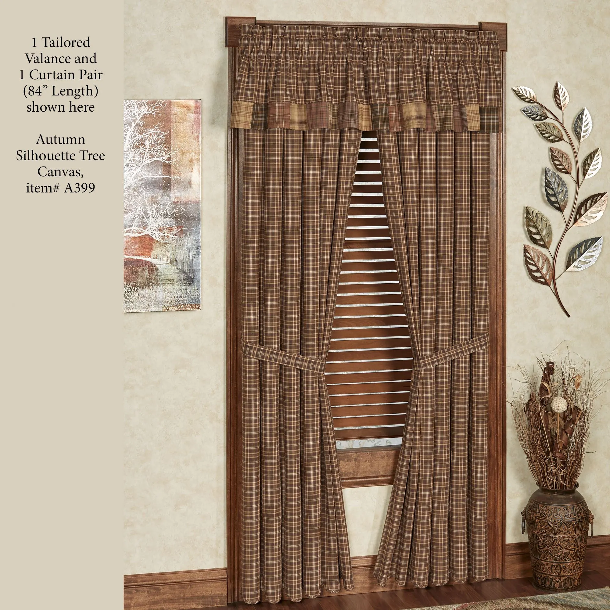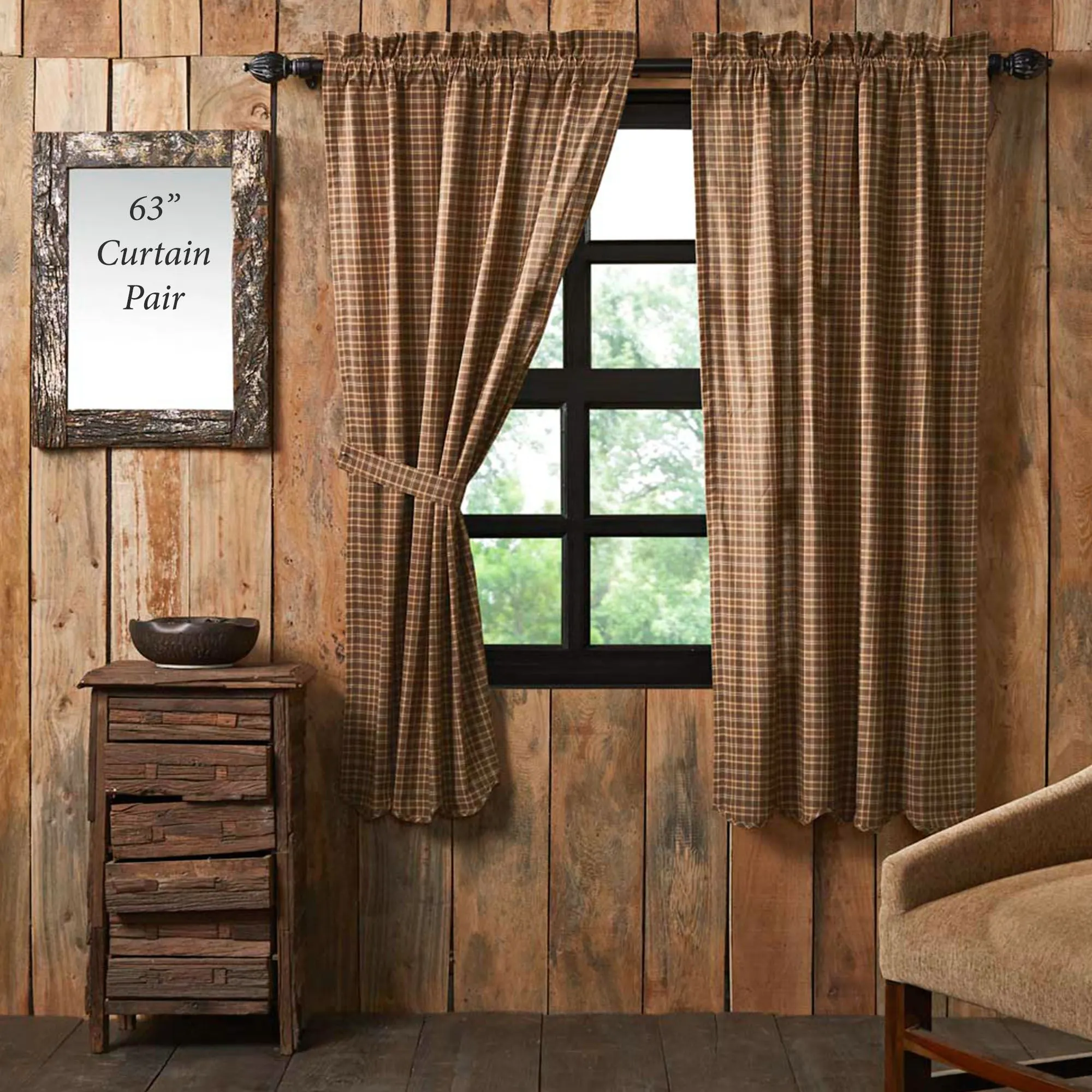 Enjoy the warm rustic appeal of the Prescott Plaid Window Treatment. Lined, pure cotton window treatment is plaid with tailored edges. Plaid is in chocolate, ivory, brown, and saddle brown. Specify Curtain Pair or Valance. Tailored Curtain Pair has a scalloped bottom and a 3.5" rod pocket. Tiebacks are included. Valance has a pieced patchwork edge and a 3" rod pocket. Patchwork trim is brown, cocoa, mahogany, caramel, ivory, pale olive, and light gold. Machine washable. Imported. The curtain pair width is the total width of two panels together.
