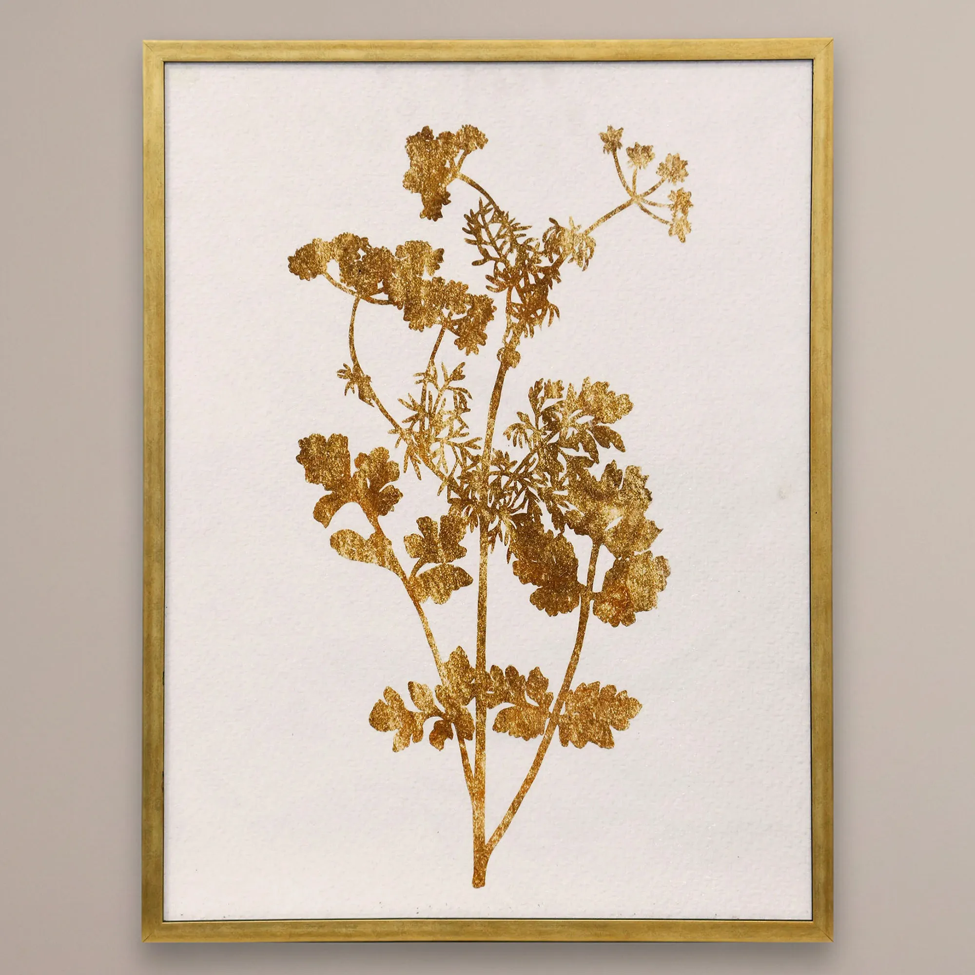 Display the Pressed Gold Foliage Framed Wall Art for a minimalist look. This textured paper print has gold leaf imprints on an off-white background with gel embellishments. The polystyrene frame is gold. Foliage I has small leaf imprints and many branches. Foliage II has floral clusters. Sold individually, each is 19"Wx1.5"Dx25"H.