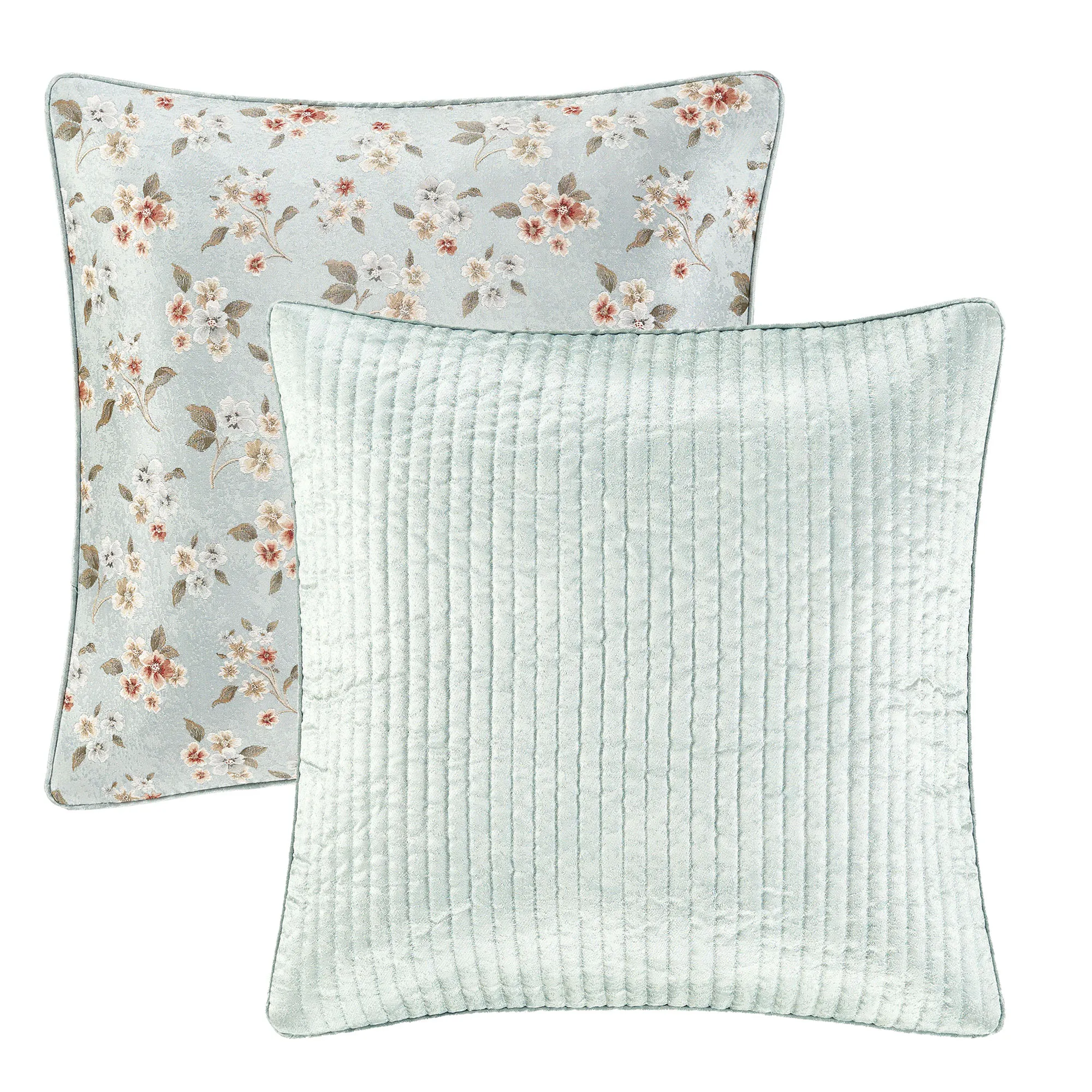 European Sham is spa blue with quilted stripes and piped edges; reverses to coordinating scattered florals on spa blue; zipper closure.