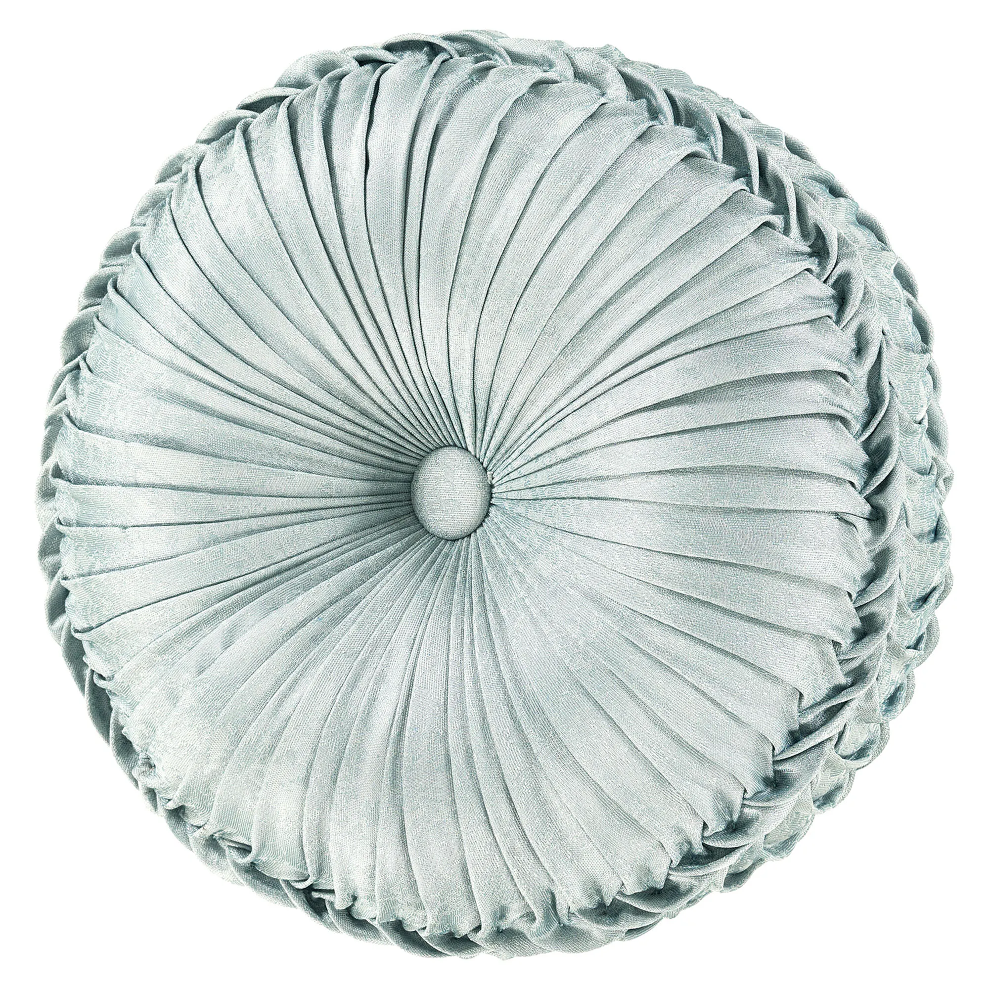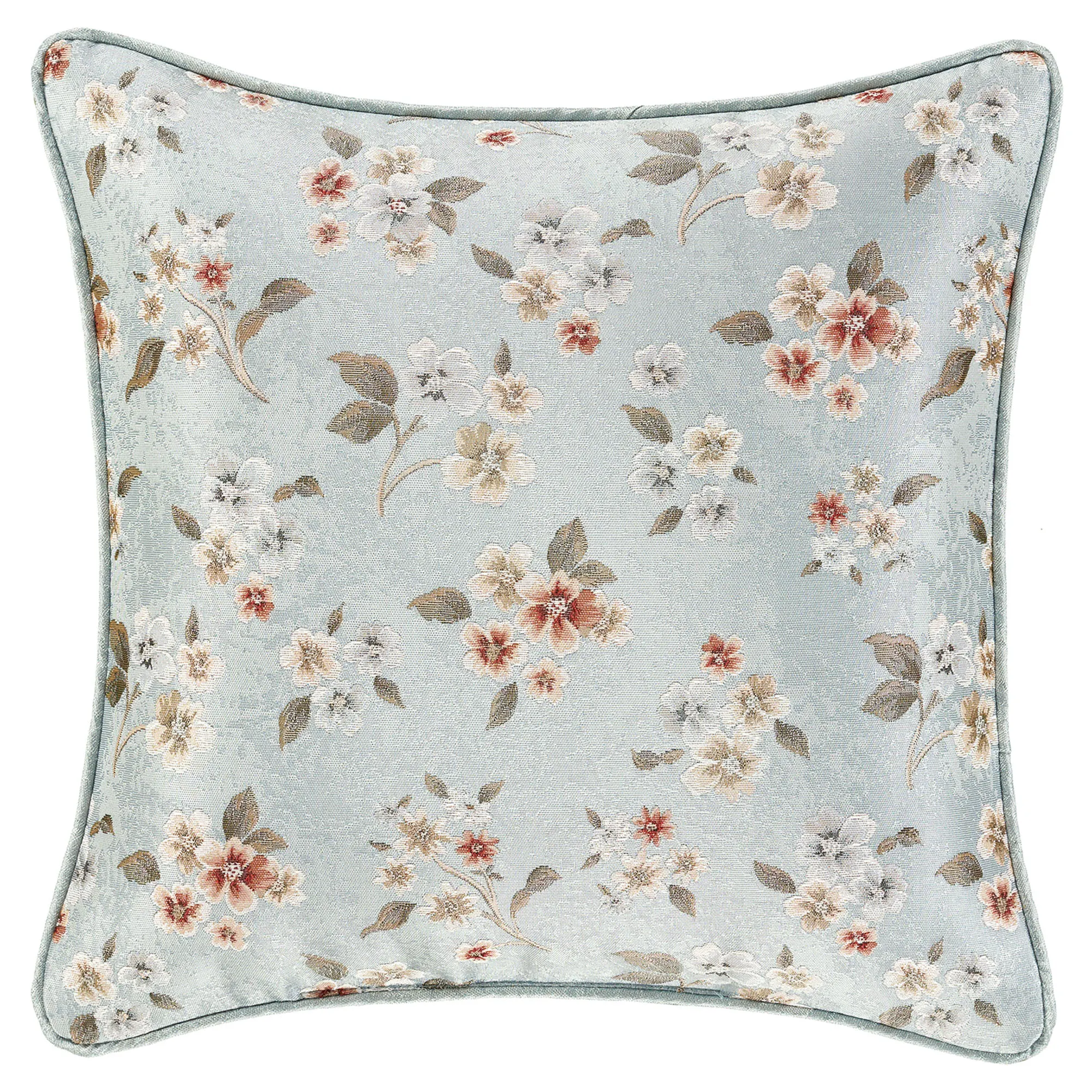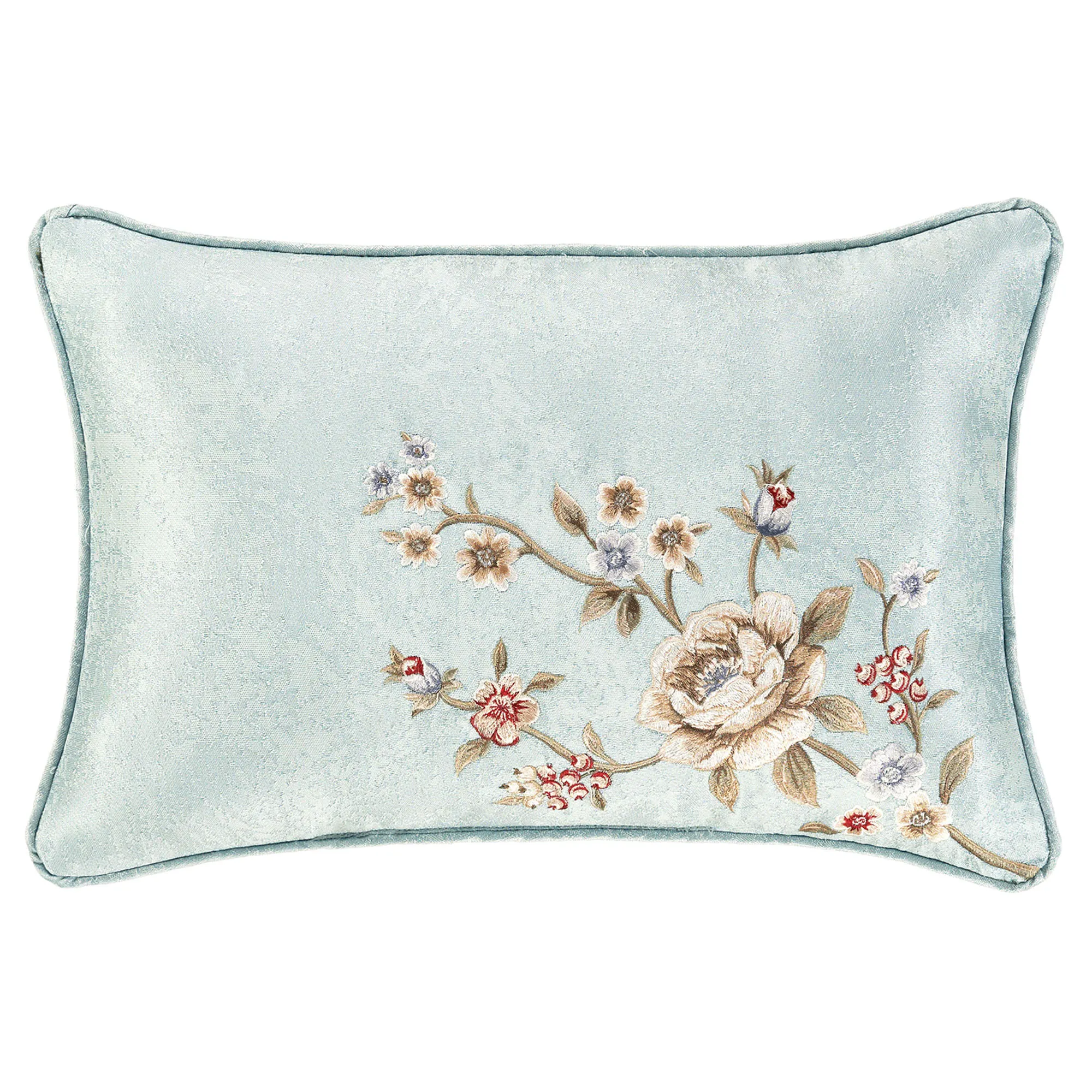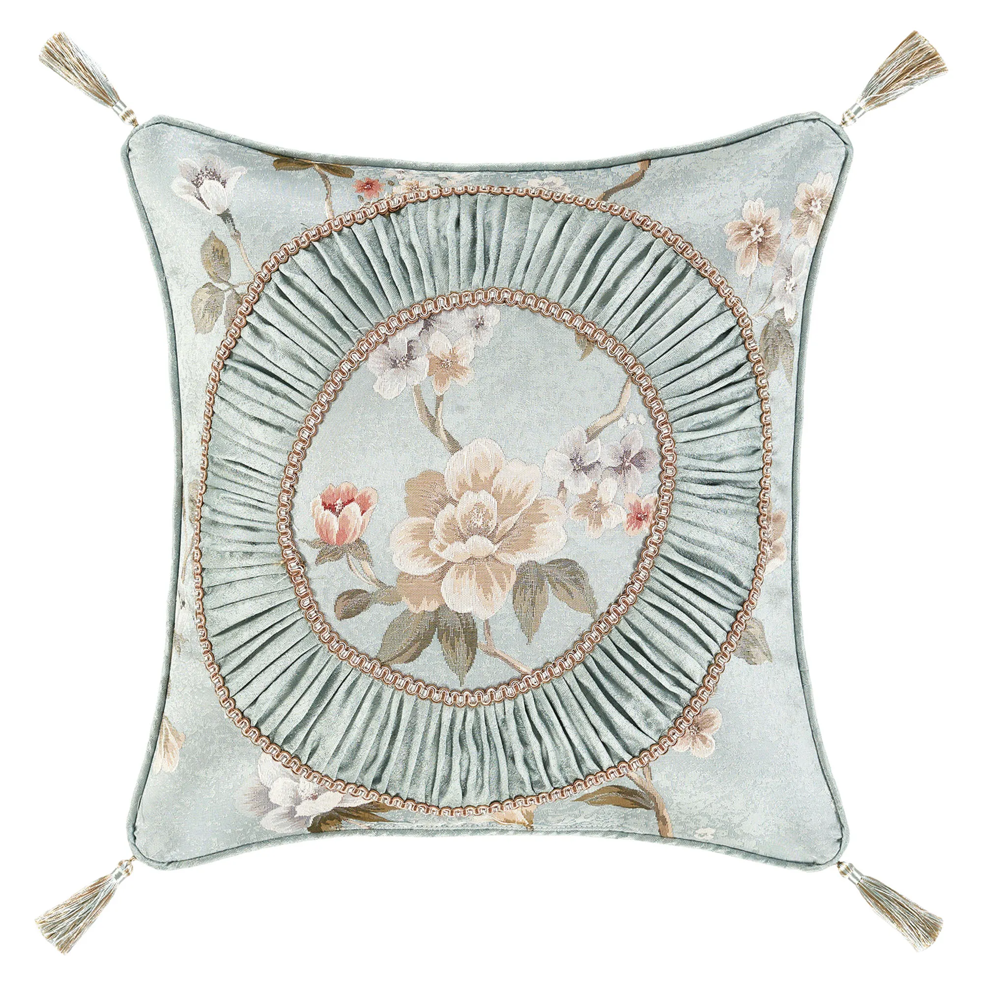Pillows, except the Round, have piped edges. Spot clean. The 18" Square has scattered florals. The 20" Square has scattered florals, a pleated spa blue circular accent detailed with gimp trim, and tasseled corners. The Jumbo Rectangle features scattered florals and a 2.5" side gusset. The Embroidered Rectangle is woven spa blue with embroidered coordinating corner florals. The reversible, handmade Round is pleated woven spa blue with a center button tuft and a 3" side gusset.