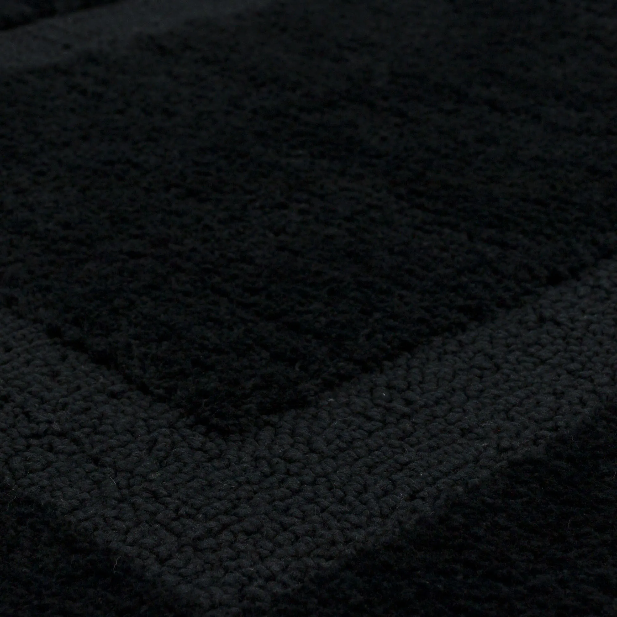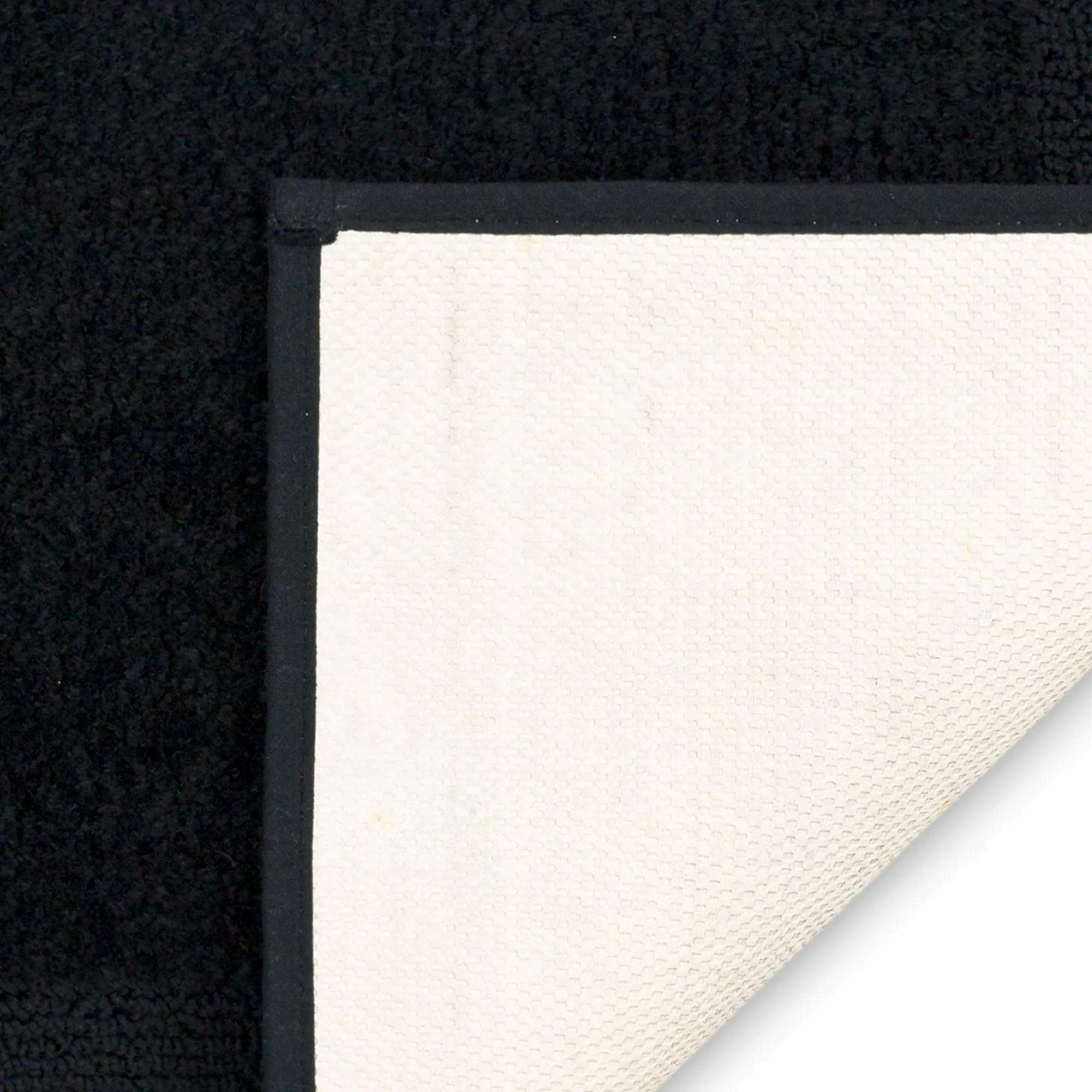 Refresh any space with the exquisite look of the Prestige Black Bath Rug. This sumptuously soft, polyester micro denier rug, .63" thick, has a knitted construction, a high-low pile, and bound ends. The bath rug is a solid color with a frame design. Durable rug is perfect in everyday areas and offers advanced soil, stain, fade, and skid protection. Back is nonskid latex. One-year manufacturing defects warranty. Machine washable. Imported.