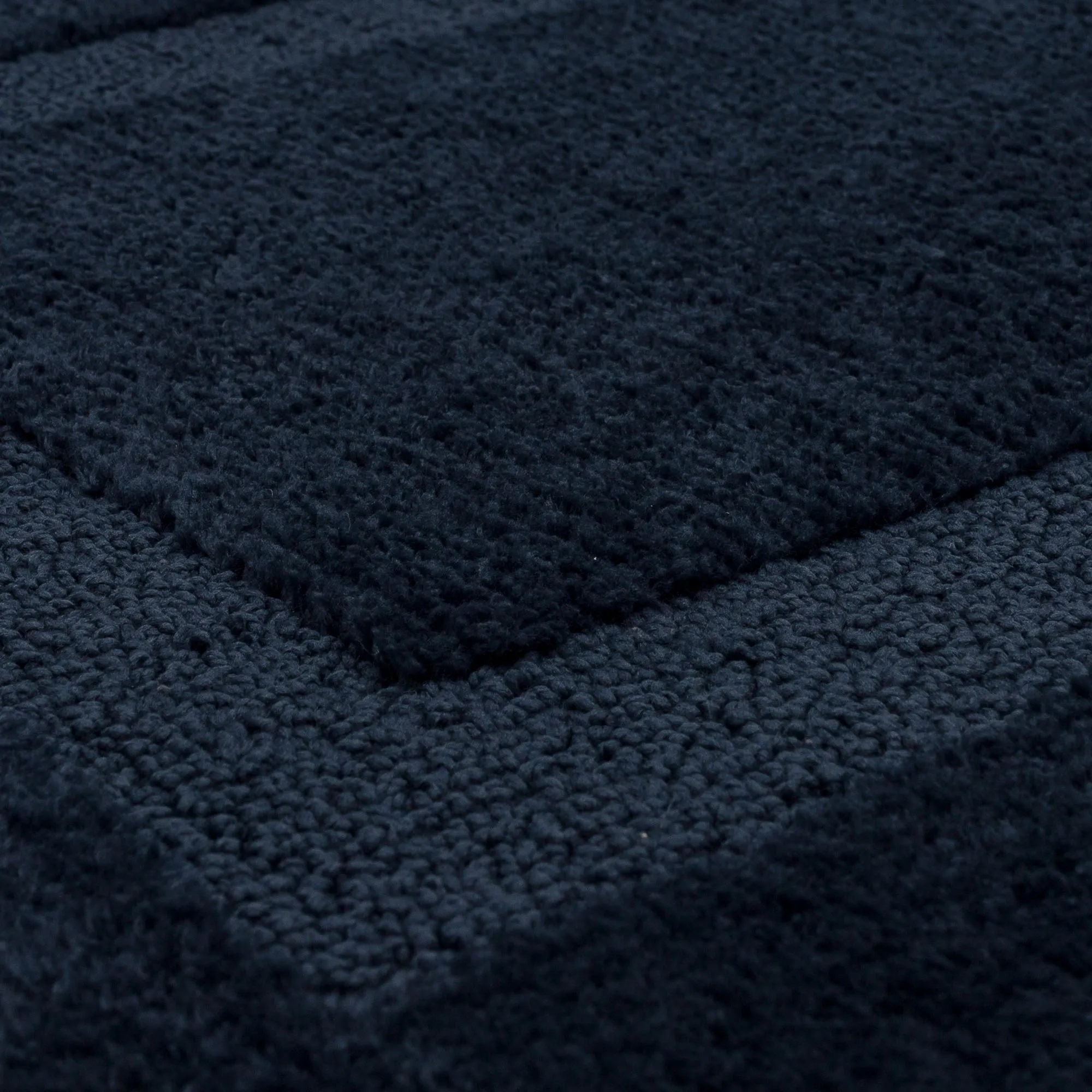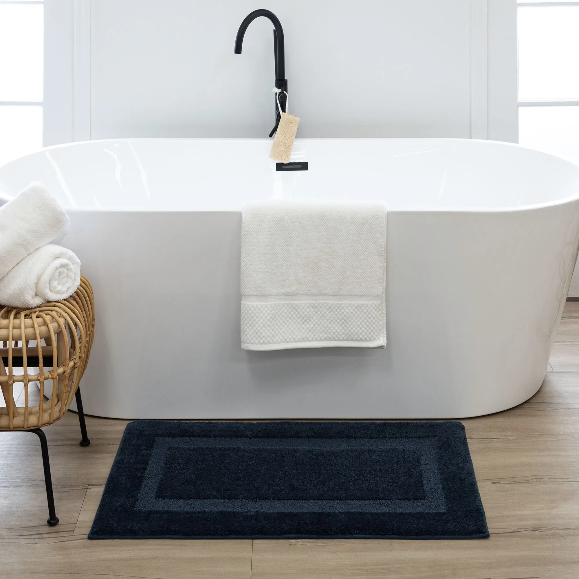 Refresh any space with the exquisite look of the Prestige Indigo Bath Rug. This sumptuously soft, polyester micro denier rug, .63" thick, has a knitted construction, a high-low pile, and bound ends. The bath rug is a solid color with a frame design. Durable rug is perfect in everyday areas and offers advanced soil, stain, fade, and skid protection. Back is nonskid latex. One-year manufacturing defects warranty. Machine washable. Imported.