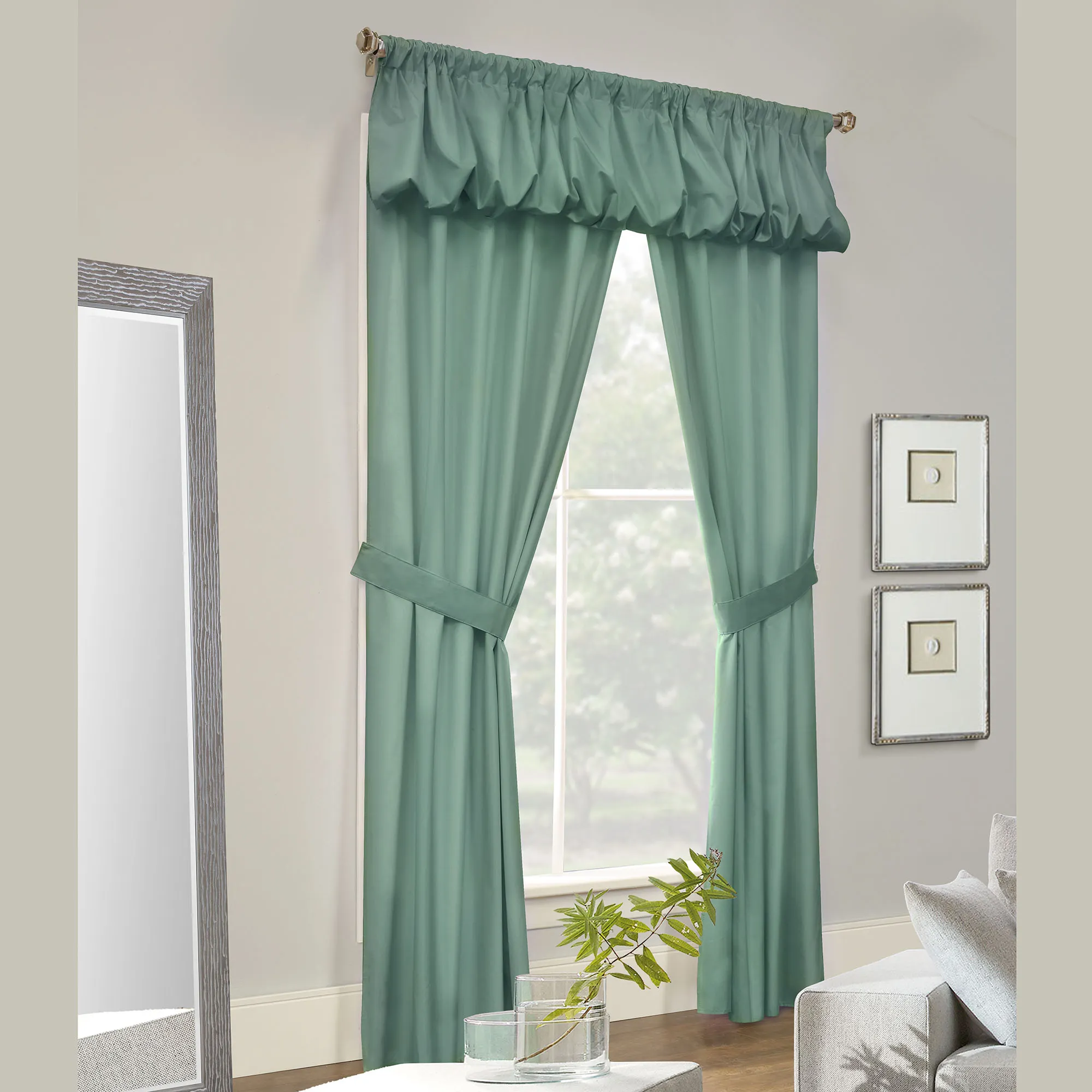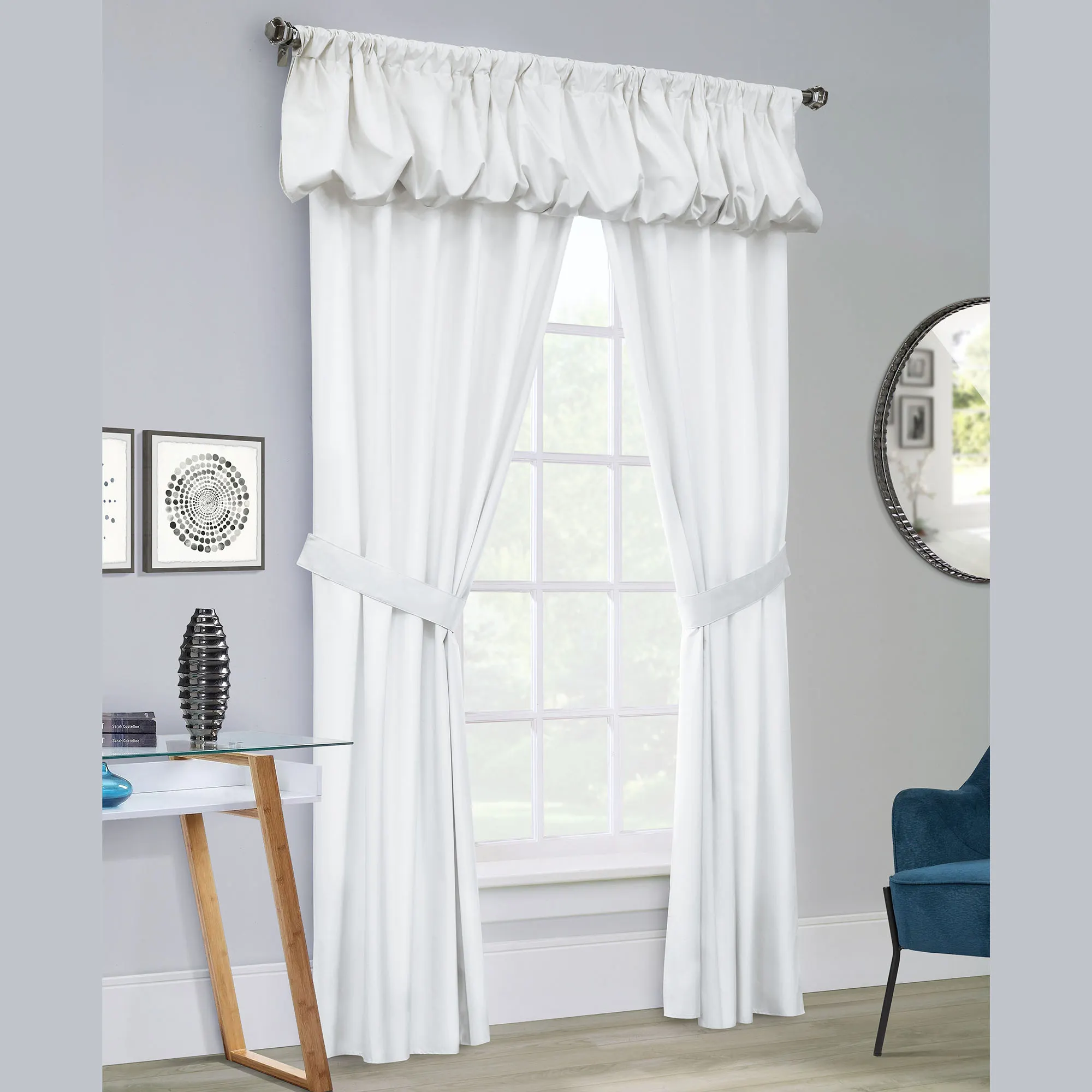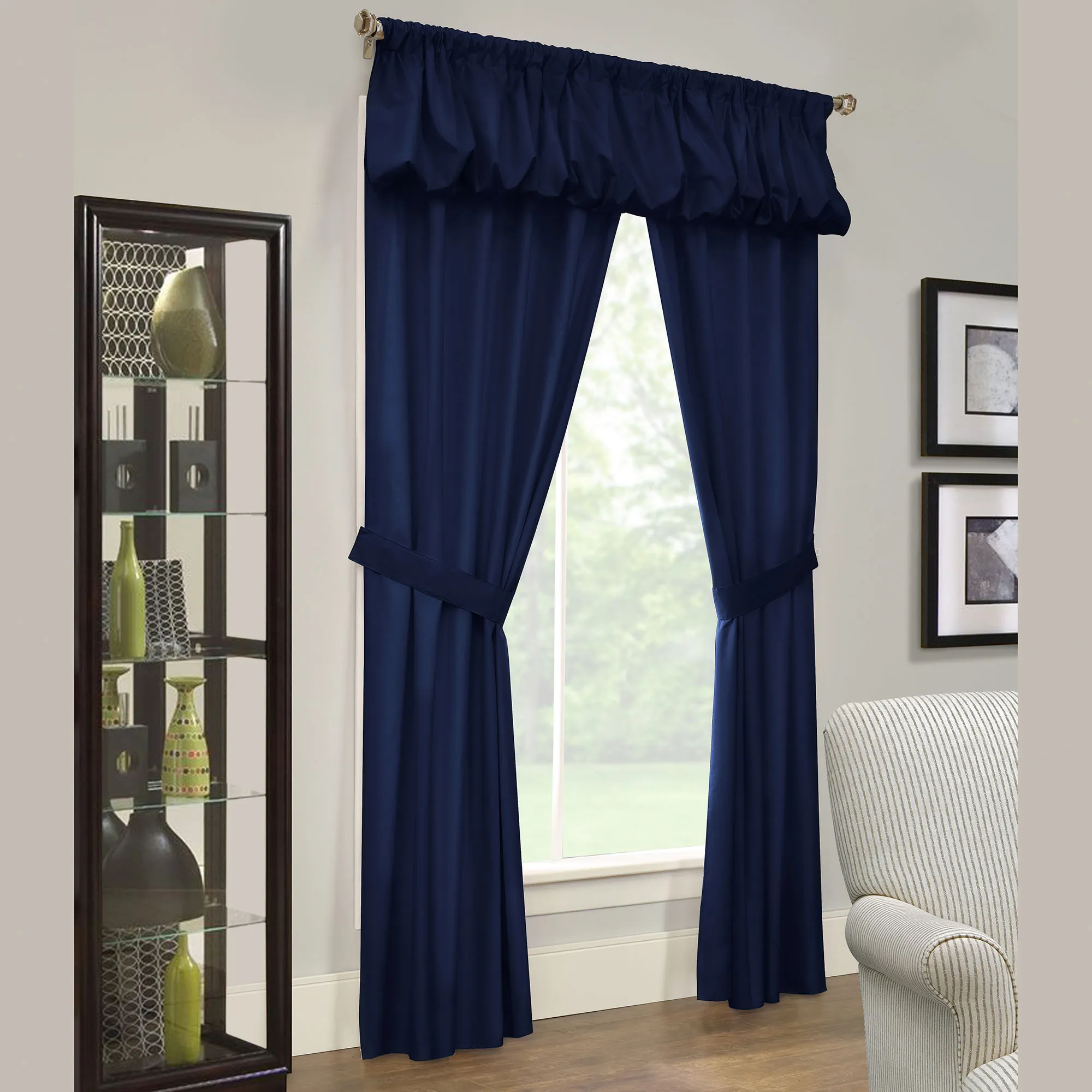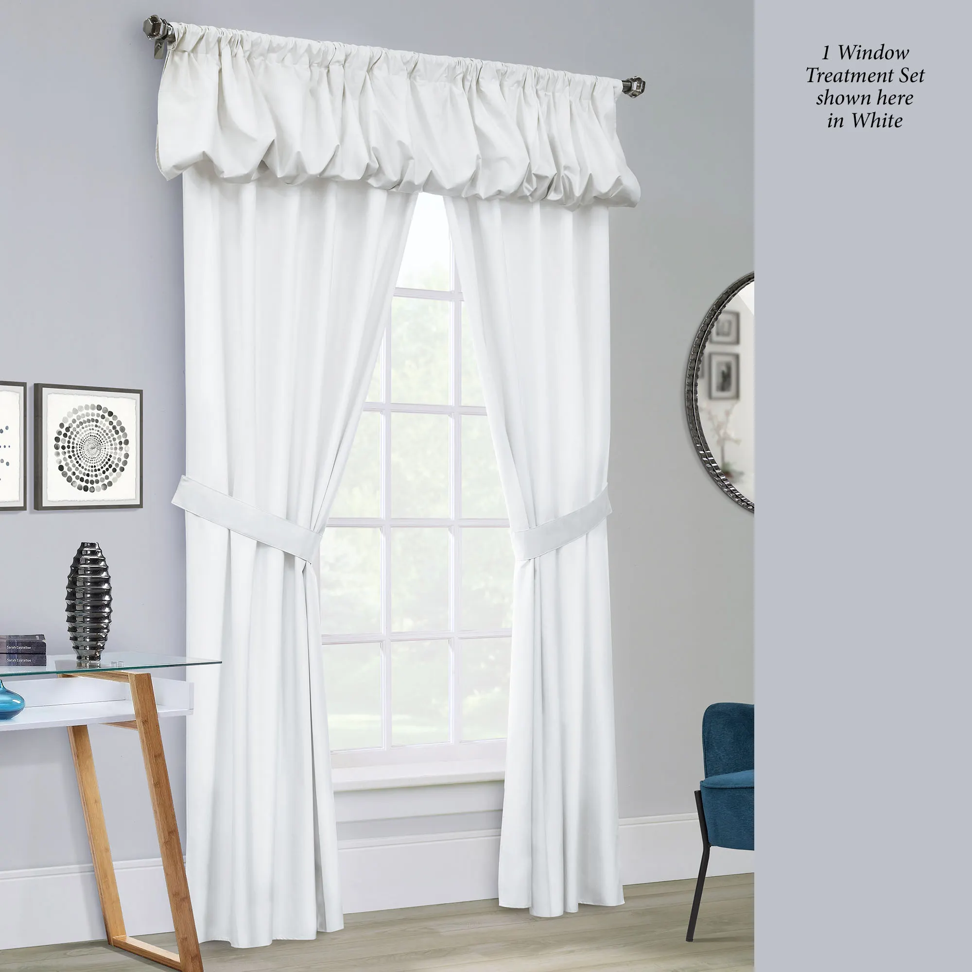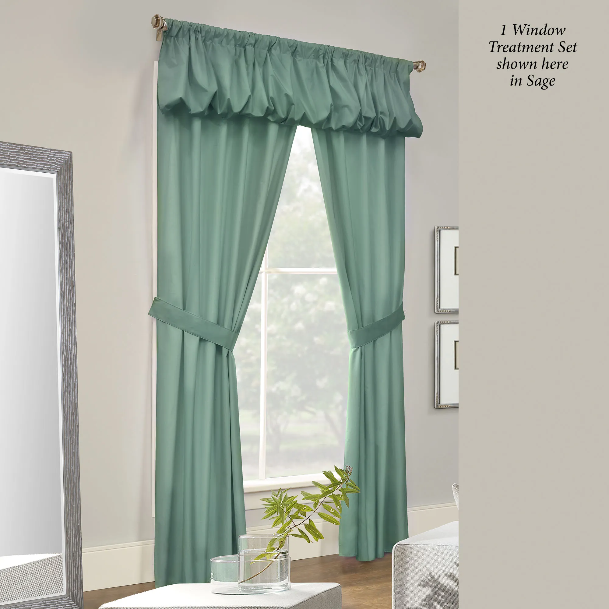 Beautifully display the traditional style of the Preston Thermalogic(TM) Window Treatment Set. Made of polyester, this energy-efficient, solid-color window treatment is a room-darkening one-piece set that can be hung all on one rod. The one-piece set includes two 40"W panels with an attached valance and included tiebacks. Rod pocket is 3". Backing is rayon. Measures 80"W. Machine washable. Imported.
