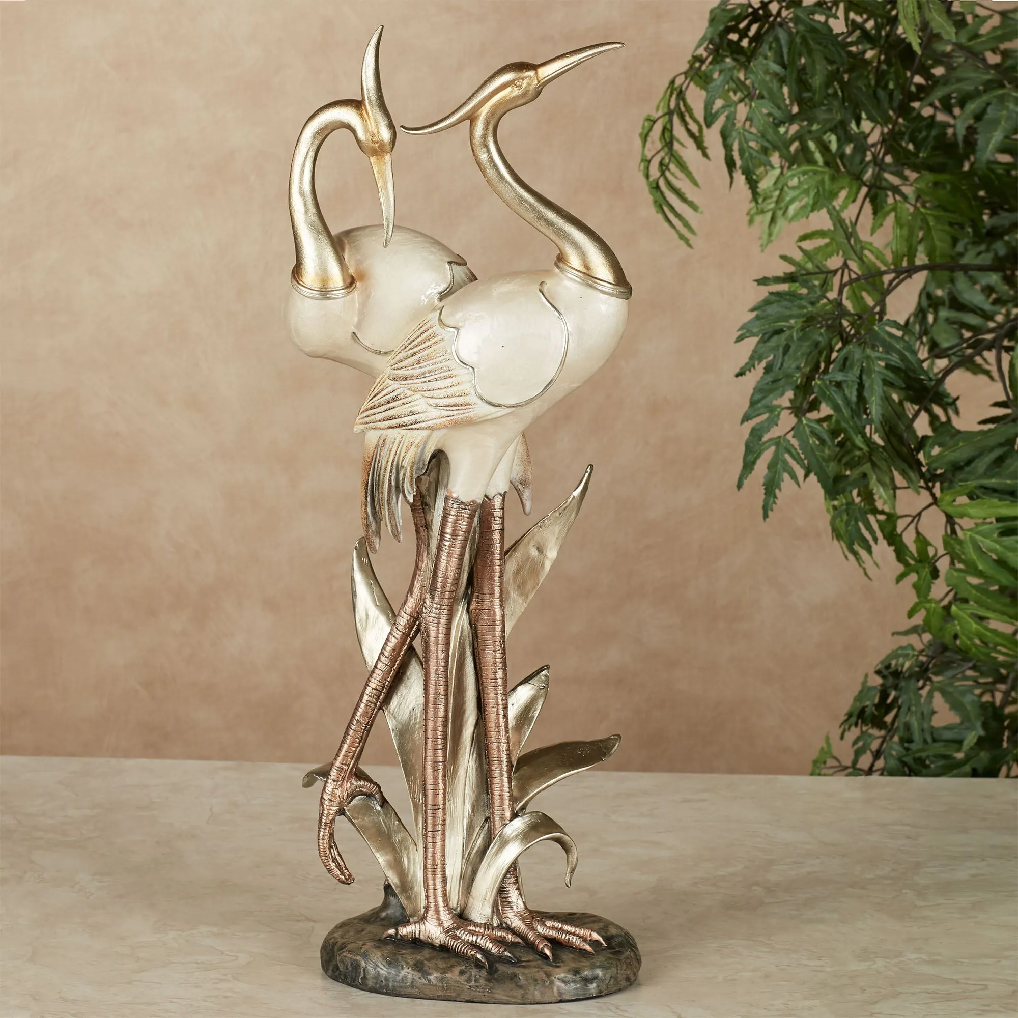 Tall and majestic, the beautiful shorebirds depicted in this table sculpture stand in a Pretty Pose. Made of resin, these cranes have an ivory finish that replicates the look of capiz shell, light copper legs, a shimmery light gold head, and feathers that are tipped with gold glitter. Birds rest on a dark tan and chocolate rocky base and are near the light champagne fronds. Crane sculpture measures 8"Wx5"Dx21"H.