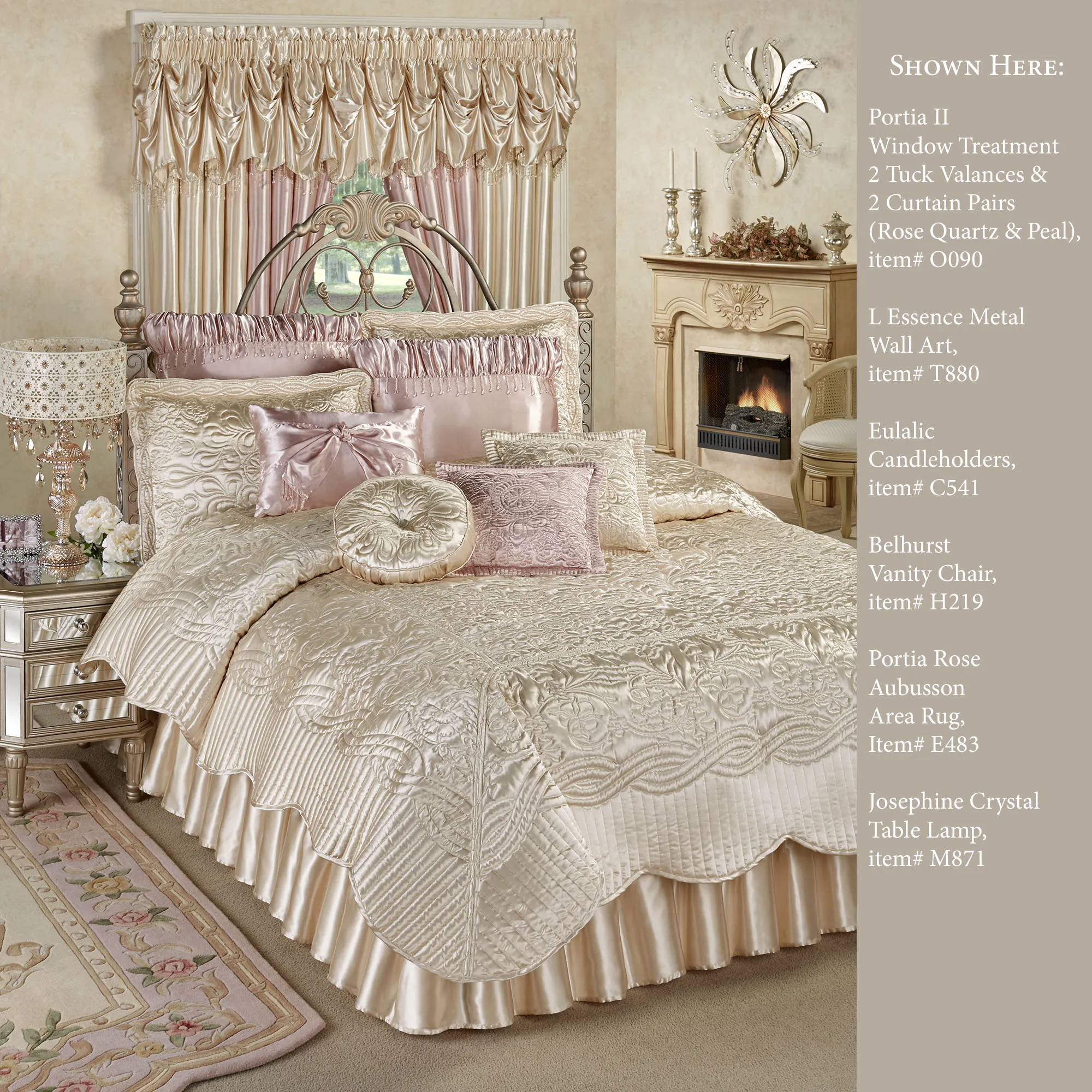 Portia Window Treatment has 2.5" rod pockets. Tailored, lined Wide Curtains include sash tiebacks with beaded fringe. Curtains are available in two lengths. Tuck Valance has beaded trim. Each Waterfall Valance has beaded trim along the bottom edge. We recommend one for each 12"-15" of window. The lined Empire Valance has beaded trim.