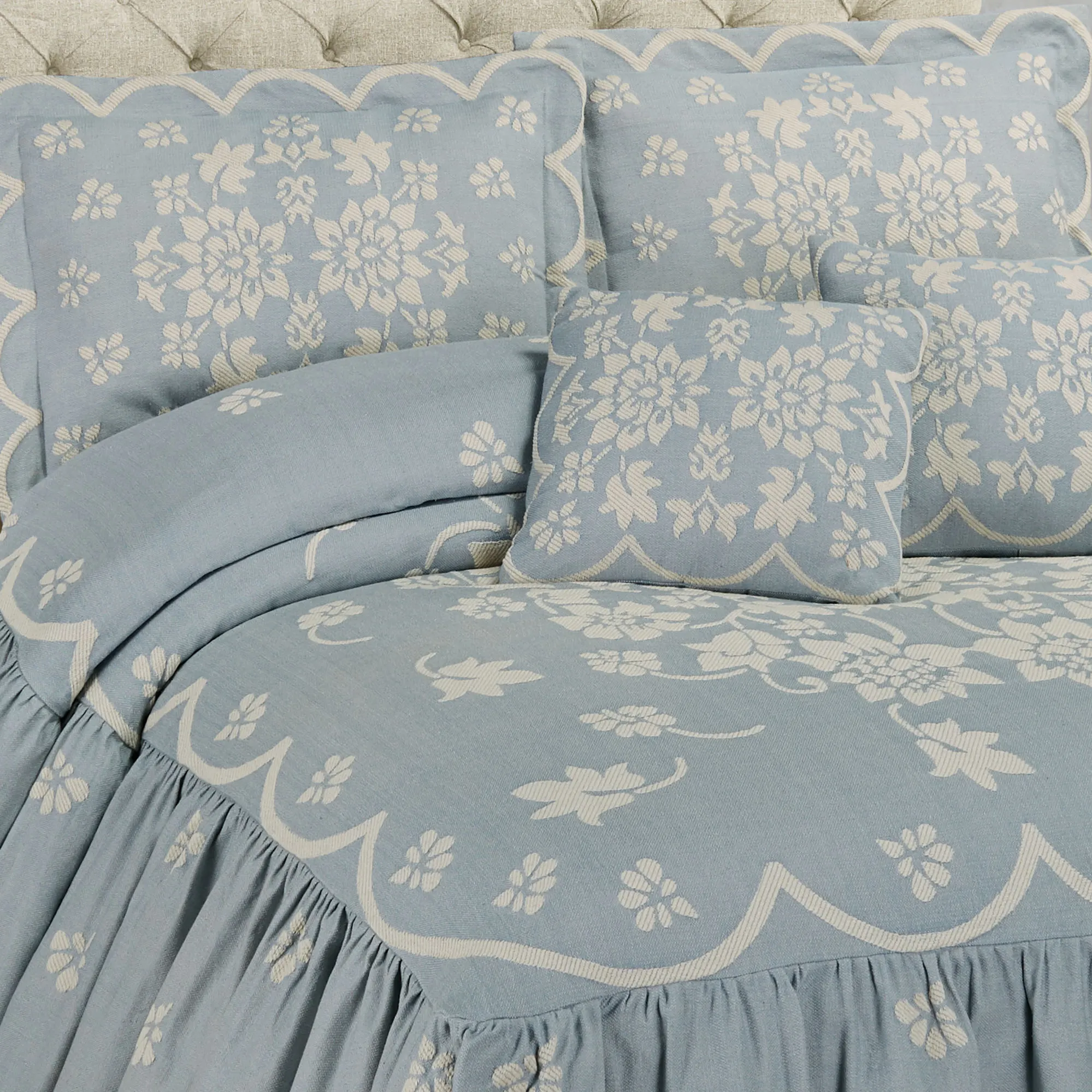 Drift away to a sweet dreamland! The Primrose Sterling Blue Bedspread Set includes an oversized, lightweight bedspread and two shams. The bedspread and shams feature eggshell jacquard-woven florals and soft scalloped frames on sterling blue cotton/polyester. Grande bedspread has a flounce-style, gathered 24" drop and tailored edges. Shams have flanged edges. Machine washable. Imported.