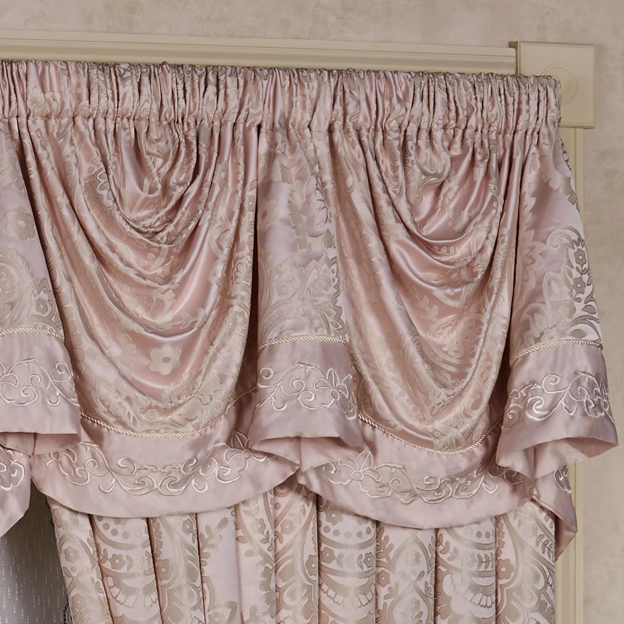 Window Treatment has a 2.5" rod pocket. Curtains are tailored and include tiebacks. Lined Empire Valance has an embroidered edge. Waterfall Valance has a tasseled bottom edge. Choose Jacquard or Solid. We recommend one waterfall valance for every 12"-15" of window width.