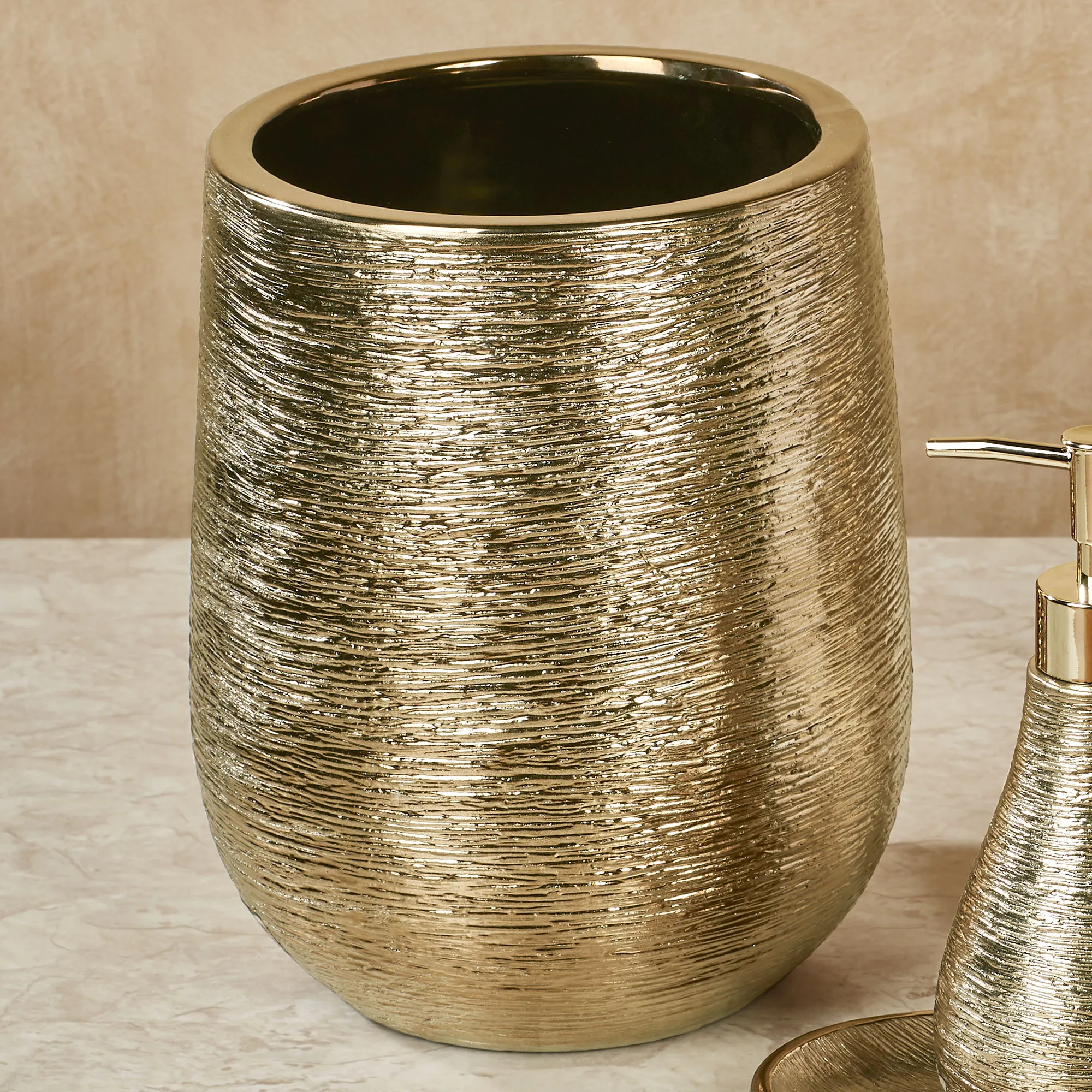 From J. Queen New York, the Princess Bath Accessories shine with beauty and poise. Finished in gold, each stoneware bath accent features a shimmering electroplated metallic finish and delightful texture. Specify Lotion/Soap Dispenser, Tissue Cover, Wastebasket, or Tray.