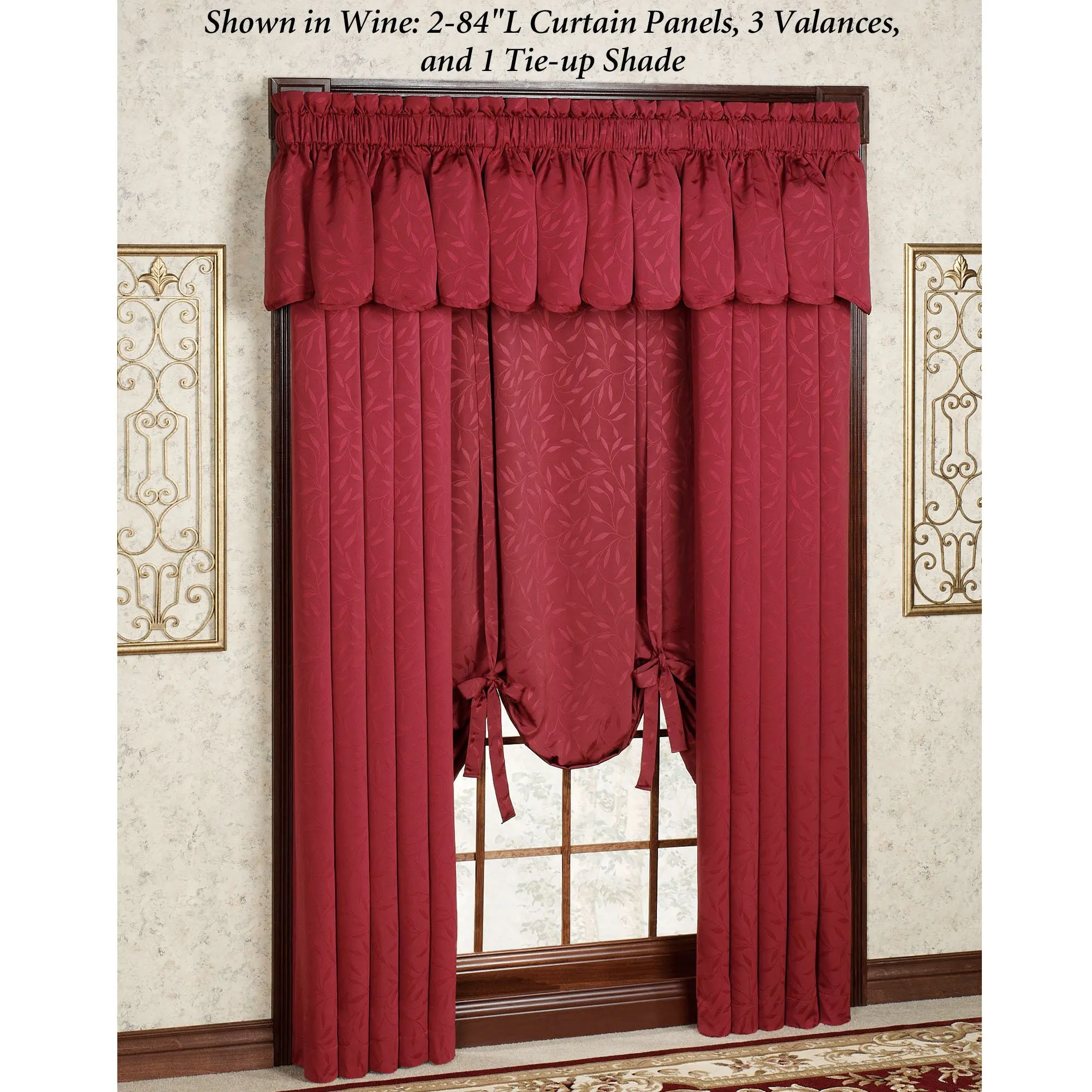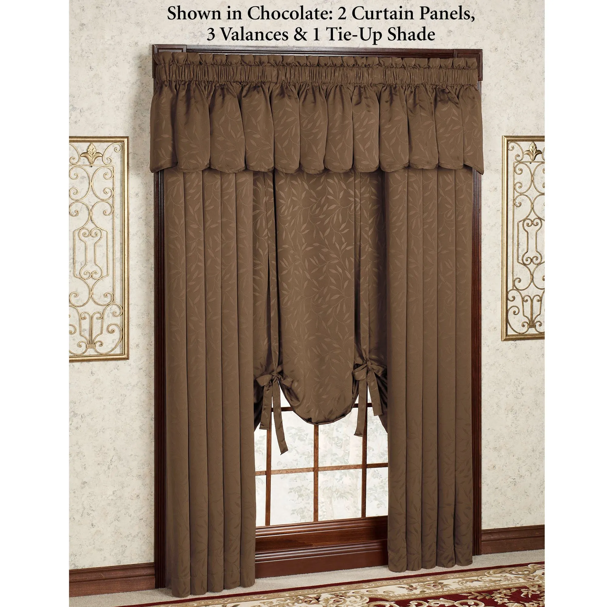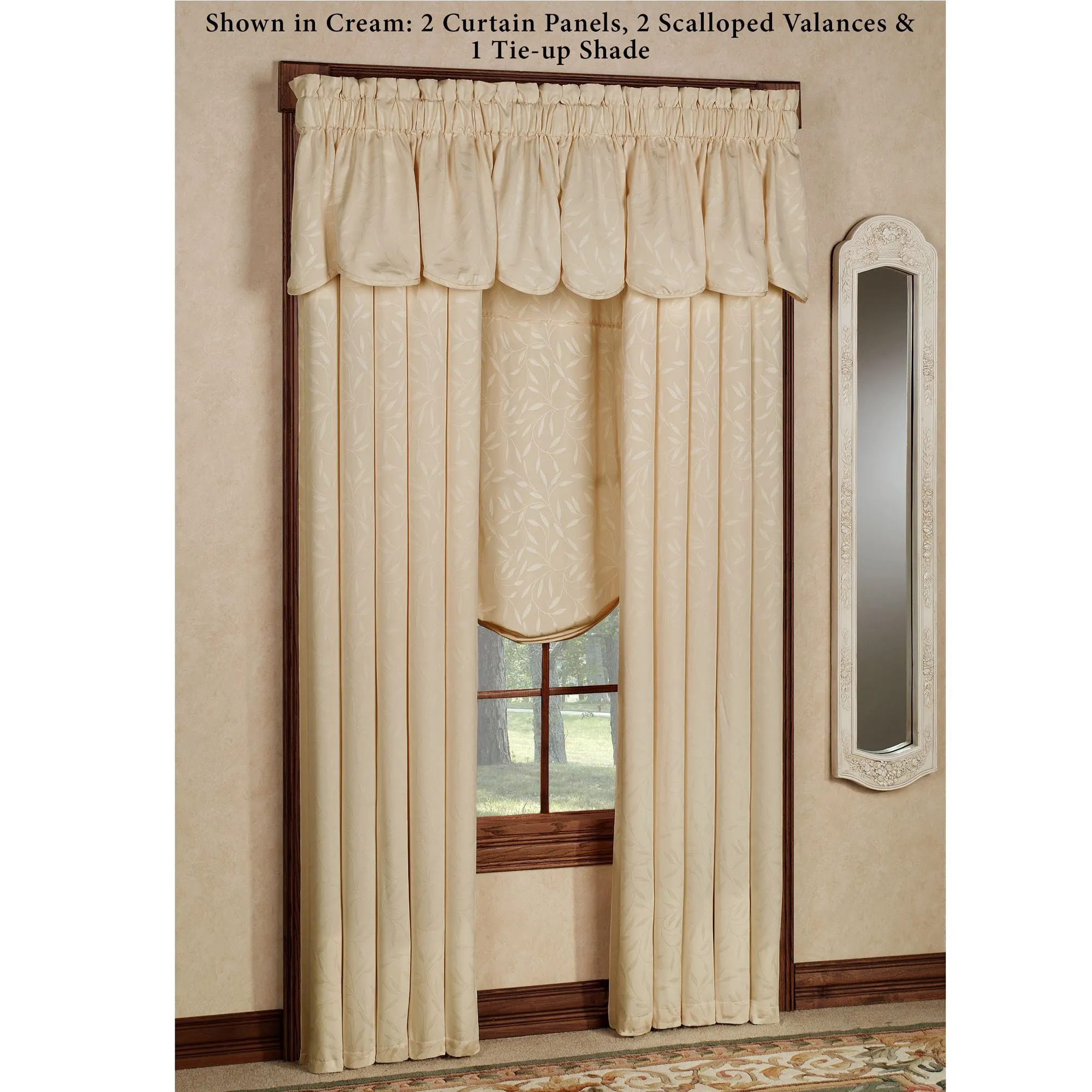 The Princeton Window Treatment is made of heavyweight tone-on-tone, jacquard-woven 100% polyester in an allover leaf motif using dull and shiny yarns. Tailored Curtain Panel has a 3" rod pocket. Scalloped Valance has scalloped bottom edges and a 3" rod pocket. Tie-Up Shade has a 1.5" rod pocket. Washable. Imported.