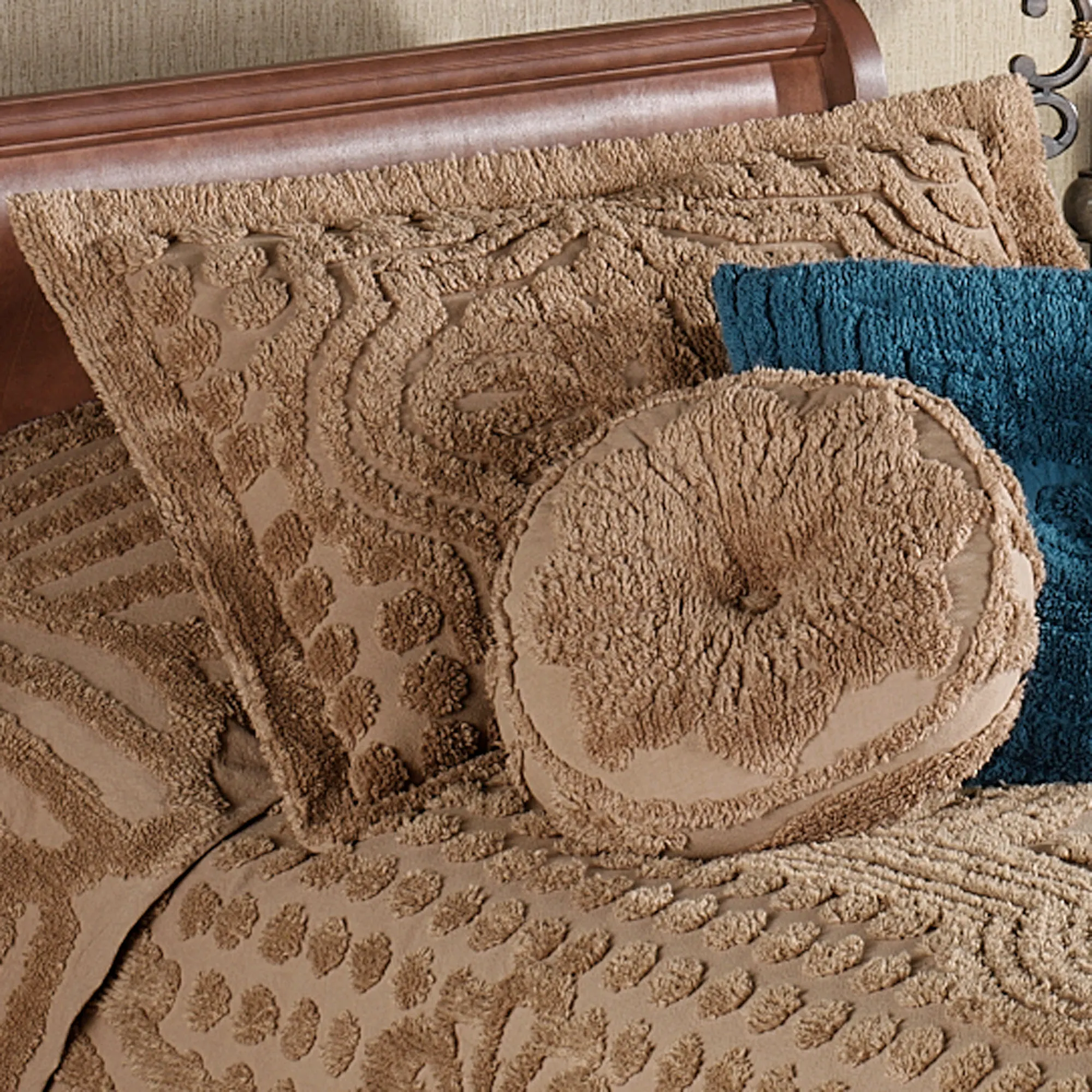 Put your decorating tastes on parade with the Promenade Accessories. These cozy, solid color, cotton chenille accessories are pre-washed and feature various charming motifs. Flanged Sham has a medallion design and dots; French back closure. Tufted Square Pillow, 18", has a star design that spreads throughout. Tufted Round Pillow, 14", has a central star design and a 2" side gusset. Fan Pillow, 22"x14", has a fan design and a 2" gusset. Machine wash the sham separately. Spot clean the pillows; pillows have polyester fill. Imported.