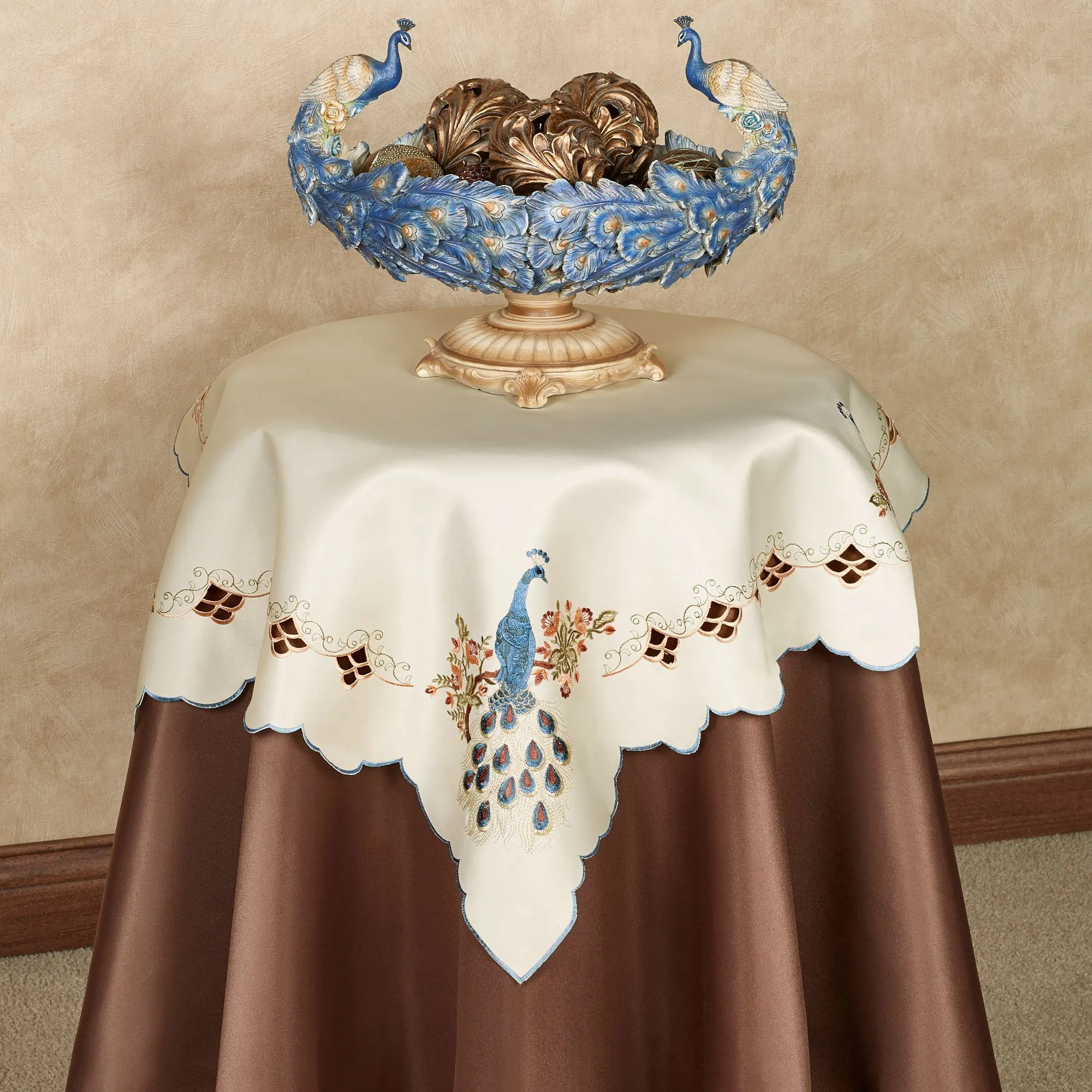 These Proud Peacocks beautifully sit on a flowering branch. Perfect in any setting, this elegant, polyester table topper has an openwork design that is cut by hand, embroidered design and edges, and a solid cream center. Peacock table topper is approx. 36" sq. Washable. Imported.