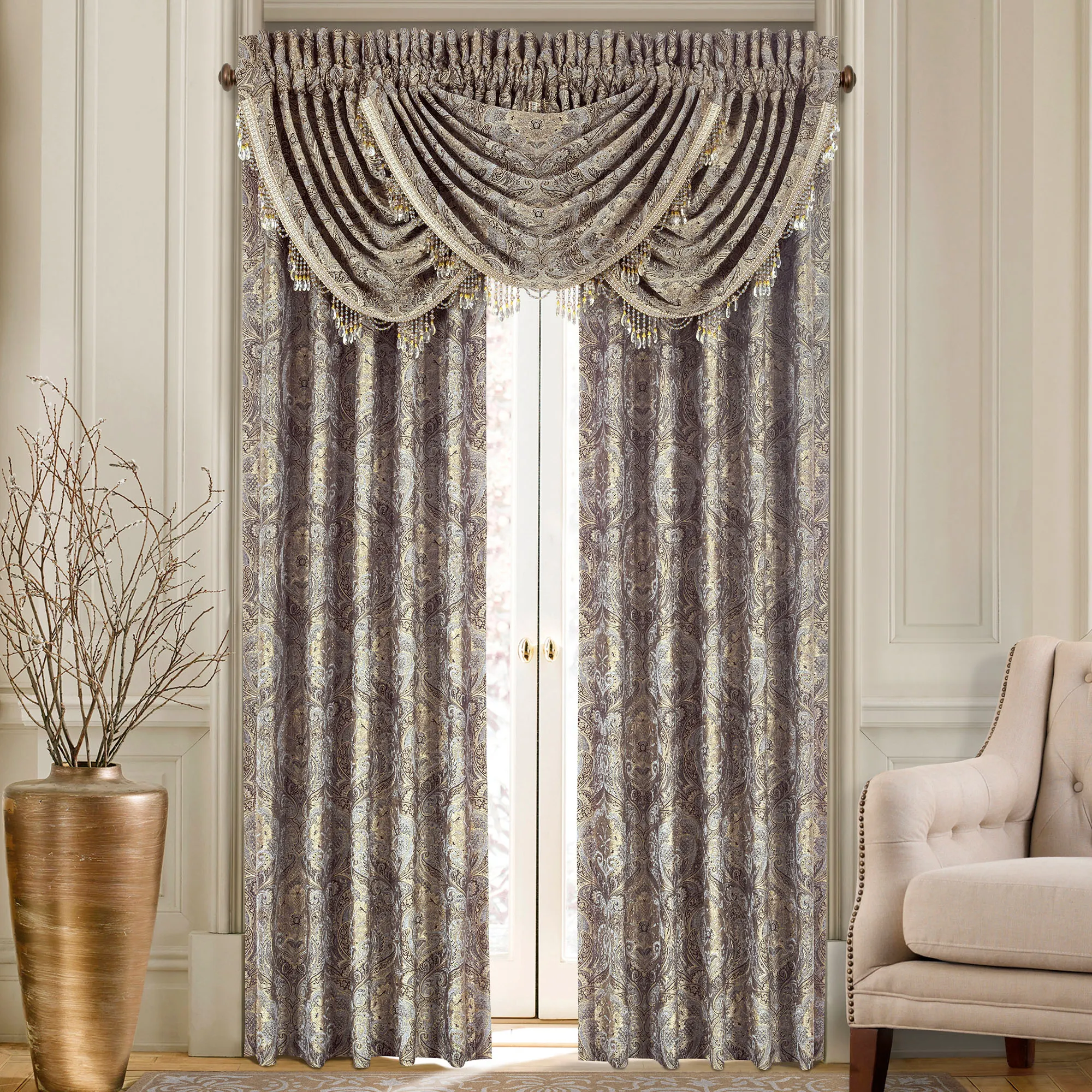 Elegance is beautifully displayed on the Provence Scroll Medallion Window Treatment by J. Queen New York. Woven-jacquard polyester window treatment features a scrolling motif in taupe, beige, and champagne gold accented with sterling blue chenille. Specify Wide Curtain Pair or Waterfall Valance. Tailored, lined Wide Curtains have a 3" rod pocket. Tiebacks are included. Each Waterfall Valance has gimp trim with decorative beads. Rod pocket is 3.25". We recommend one valance for every 12"-15" of window width. Dry clean. Imported. The curtain pair width is the total width of two panels together.
