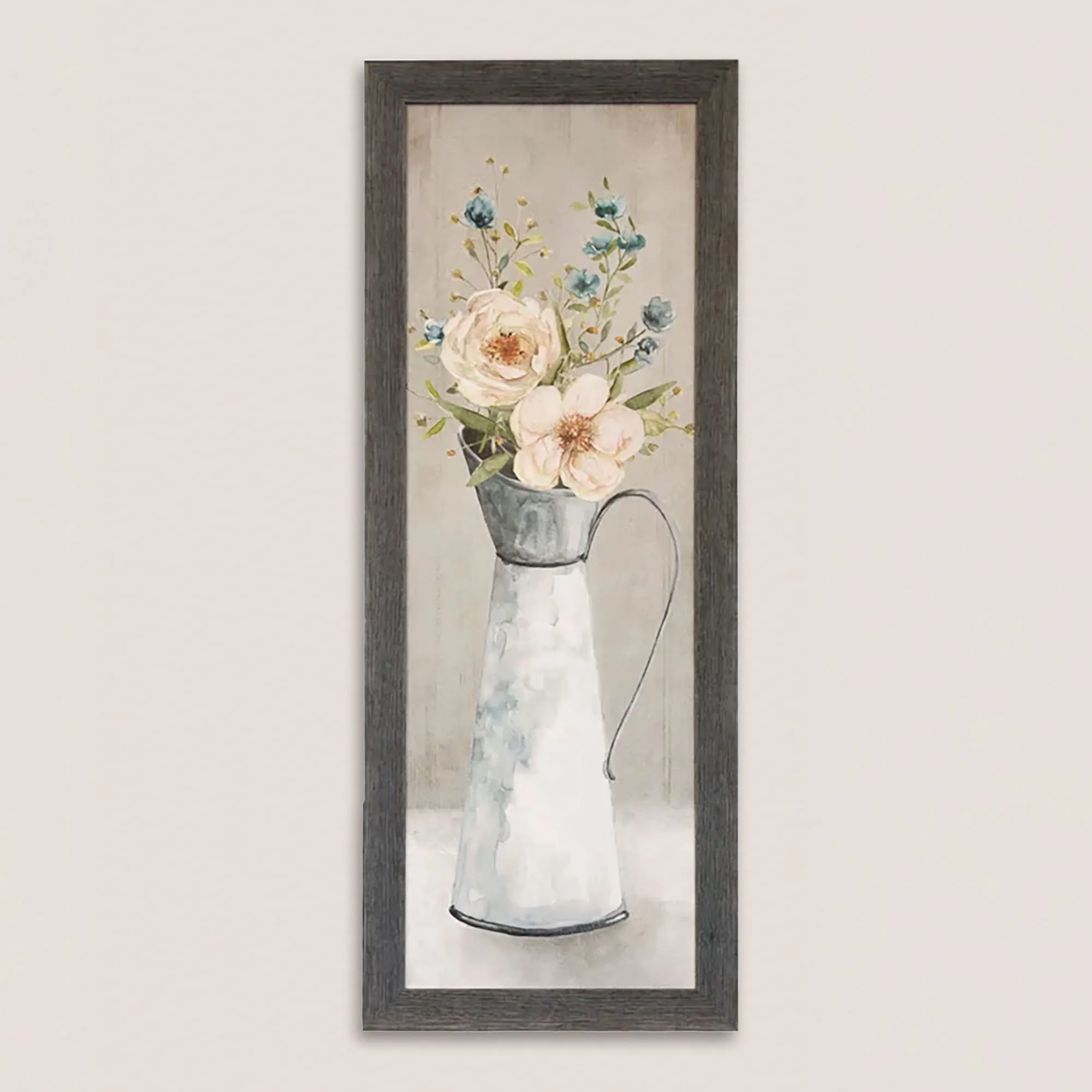 A Provincial Bouquet looks beautiful when picked fresh from the countryside. Made in the USA, each paper print wall art features a lovely bouquet of large ivory flowers, small blue blossoms, and greenery in a tall container. A light beige and off-white background and a charcoal faux wood polystyrene frame complete each framed wall art. B1 pictures the florals in a large blue-toned clear glass vase design. B2 depicts the flowers in a tall rustic pitcher that resembles gray galvanized metal. Each framed floral wall art is 14"Wx38"H.