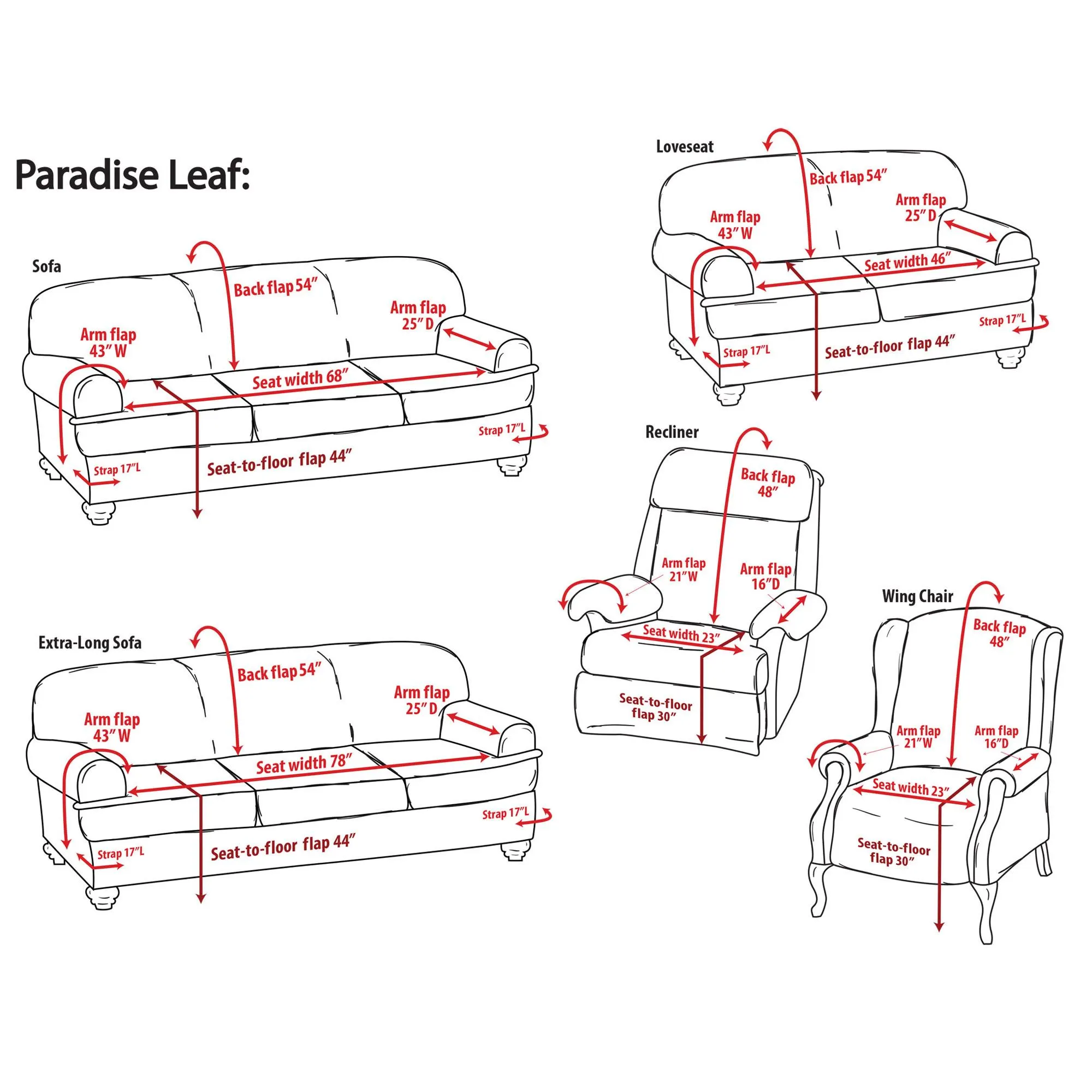 Sofa Cover is 110"Wx75"D and fits a seat up to 68"W. Arm flaps are 21"Wx24"D; seat-to-floor flap is 36"L; back flap is 39"L.