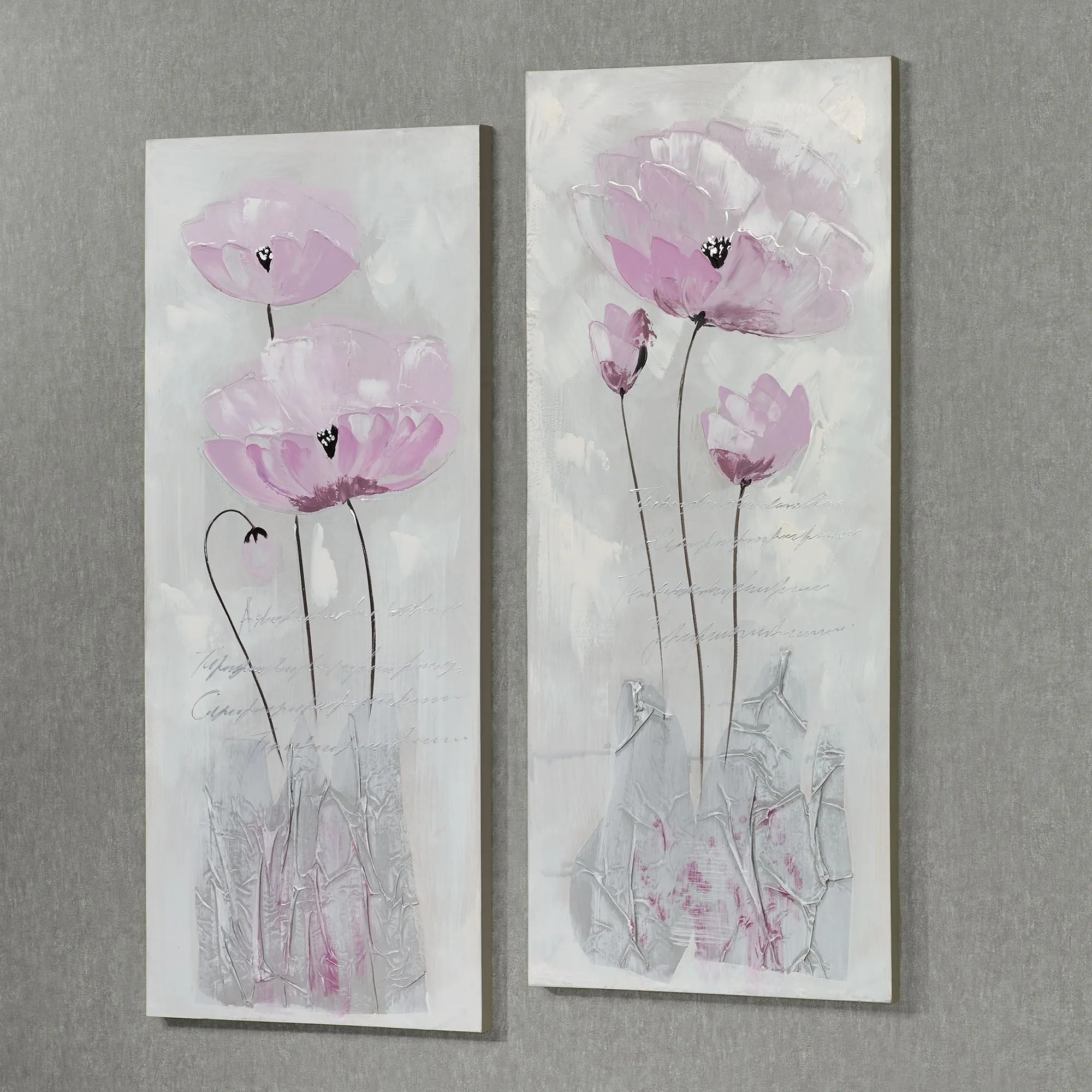 A Purple Haze blossoms from the florals within this canvas wall art set to blanket your space in a sweet, serene grace. Gallery-wrapped over wood frames, the canvas wall art features handpainted oil designs of large purple poppies on long black stems. Flowing bronze script, highlighted in silver, completes each. Each floral canvas is 20"Wx1.5"Dx47"H.