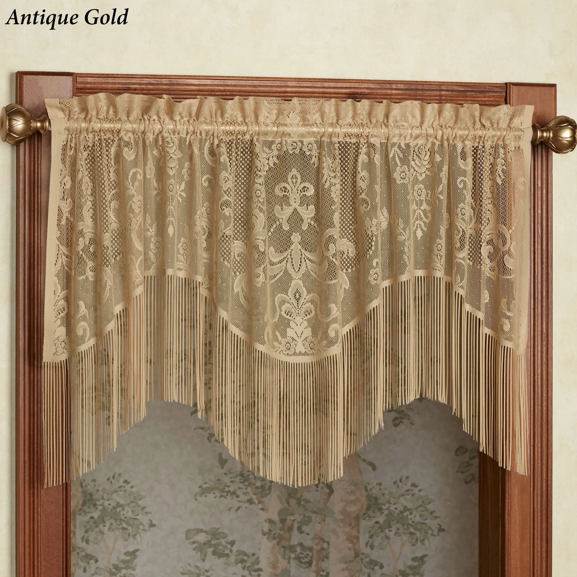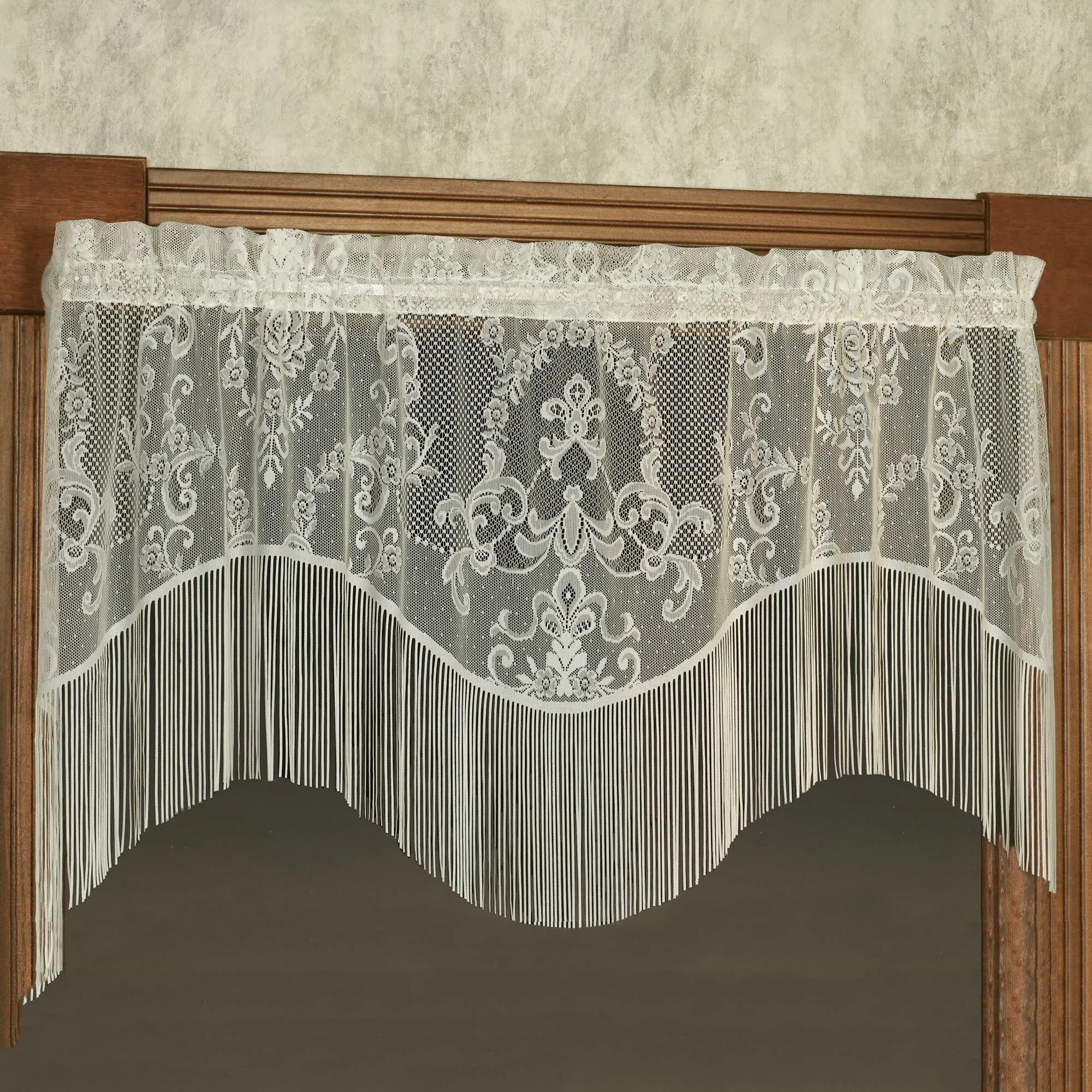I haven't been able to find a valance with fringe, until these Queen Lace ones. These are so beautiful and delicate! I ordered ivory and they are so elegant! I highly recommend. Also I ordered on a Monday and the following Friday they arrived! The only thing I dislike is the high cost of shipping. :( $14.95 is a bit high in my opinion.