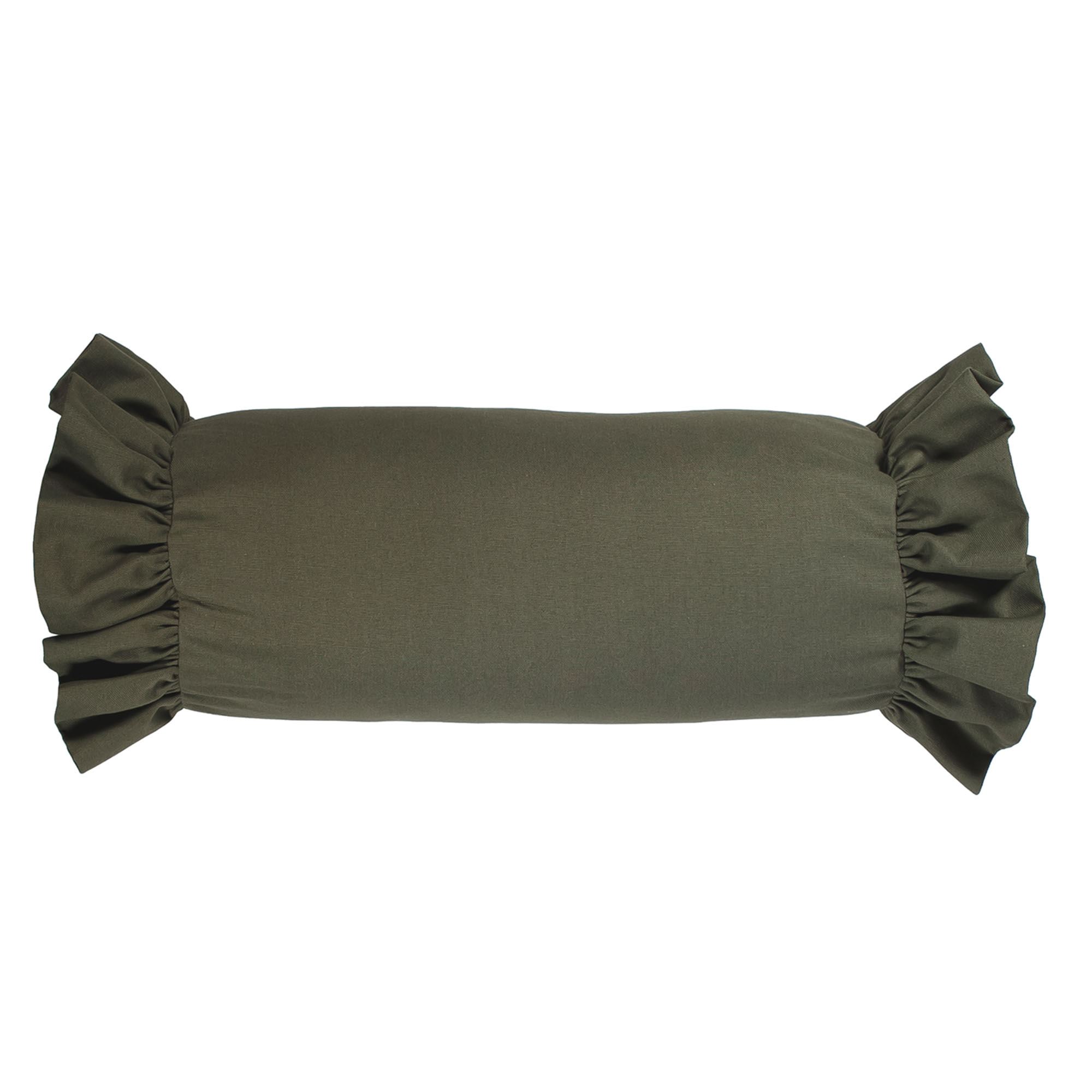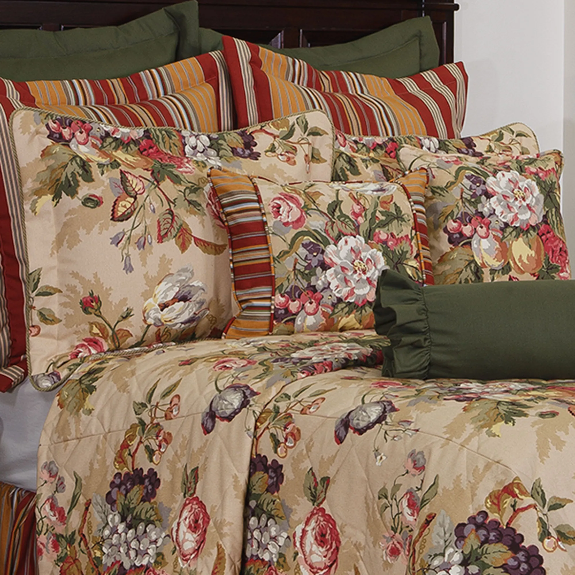 Pillows: The reversible Square has a floral and fruit print and piped ends. The pieced Rectangle has a floral and fruit print, stripes, and piping. The Neckroll is solid green with a ruffled flange.