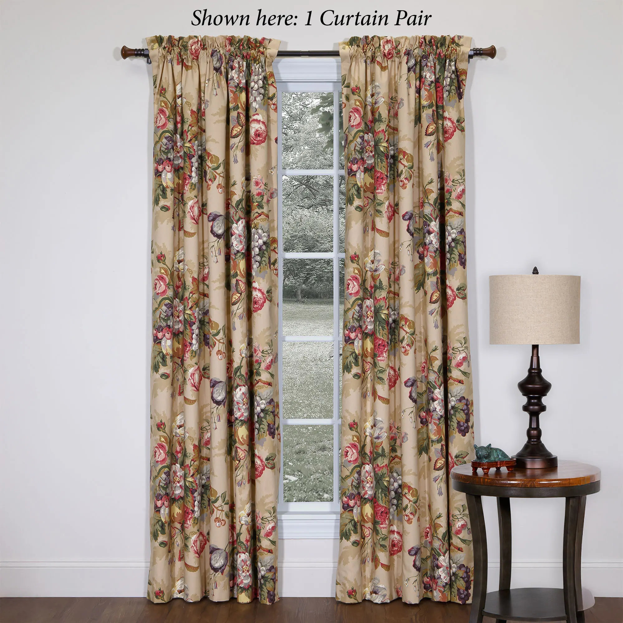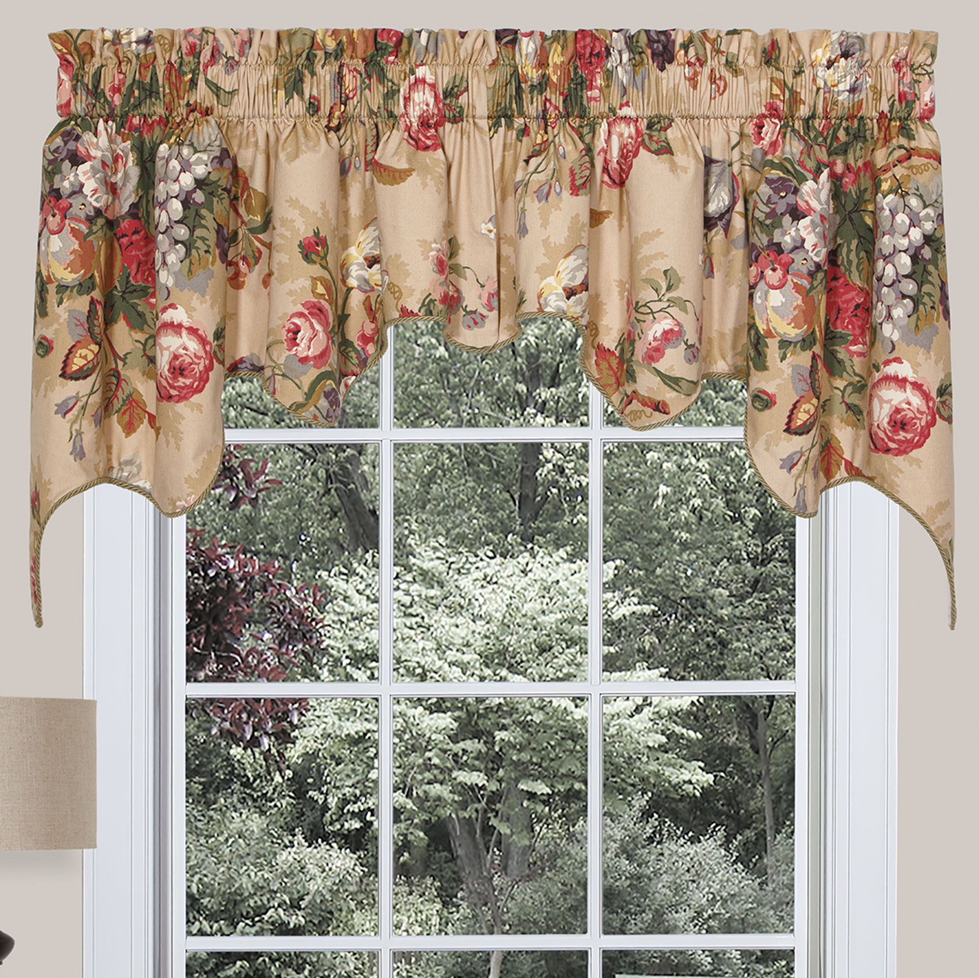 Lined Window Treatments have a floral and fruit print and 3" rod pockets. The Curtain Pair is tailored. The Empress Swag Valance Pair has twist cording. The Scalloped Valance has twist cording. The pieced Tailored Valance has a solid green bottom.