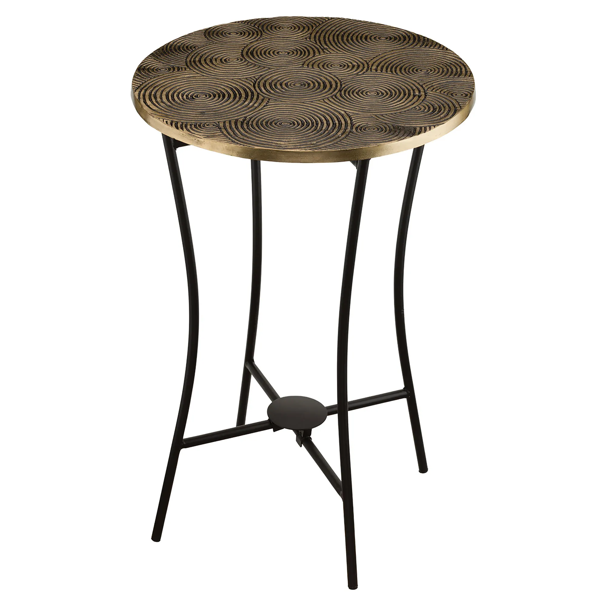 Elevate your home or garden decor with the Radcliff Outdoor Accent Table, beautifully crafted for lasting style and strength. Built with a half-inch thick rustproof aluminum top and supported by four sturdy black tubular metal legs, this versatile piece doubles as a chic side table or an elegant plant stand. The embossed gold swirl top dazzles with overlapping circles. For indoor or outdoor year-round use. Measures 16"dia.x24"H.