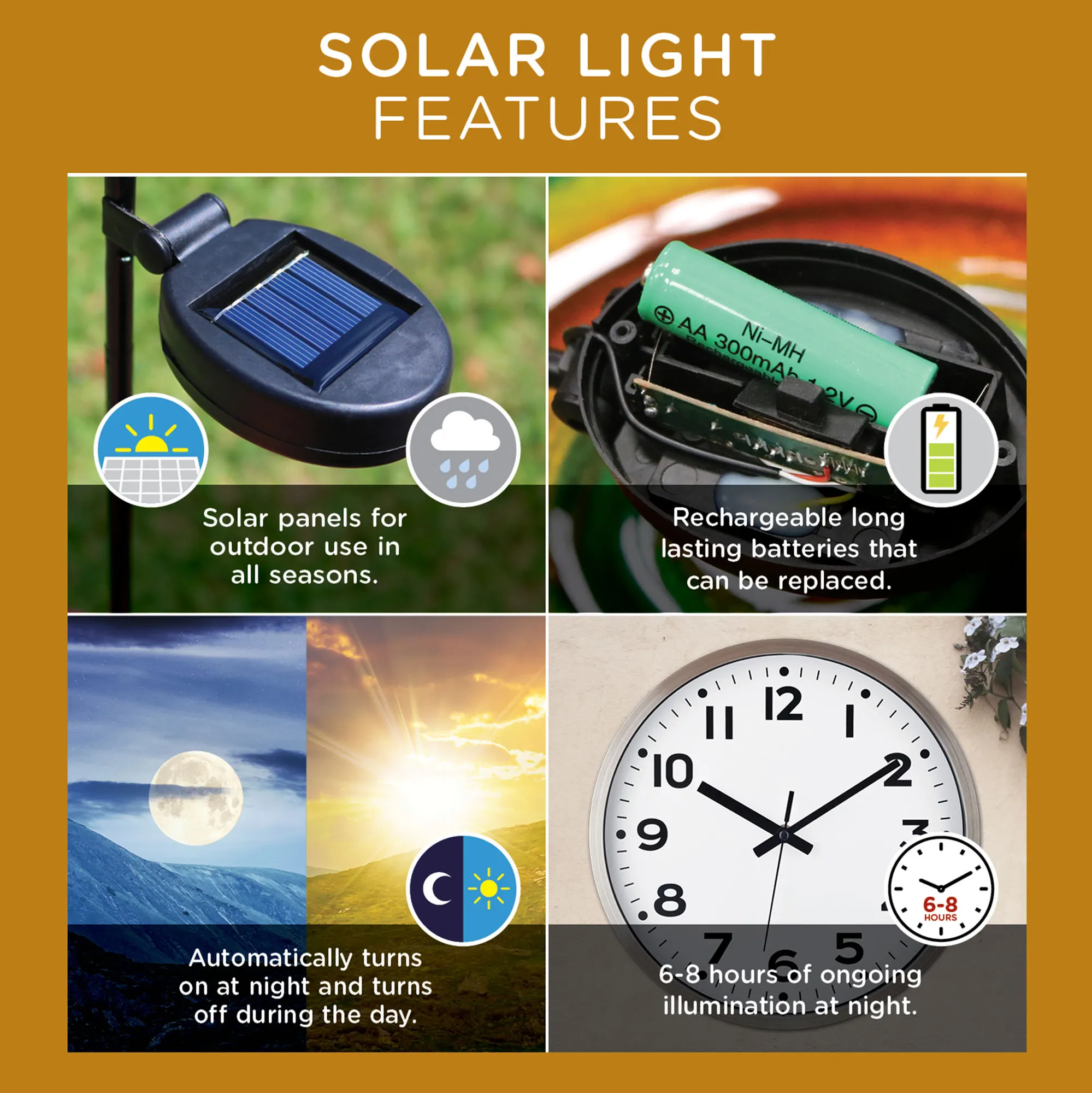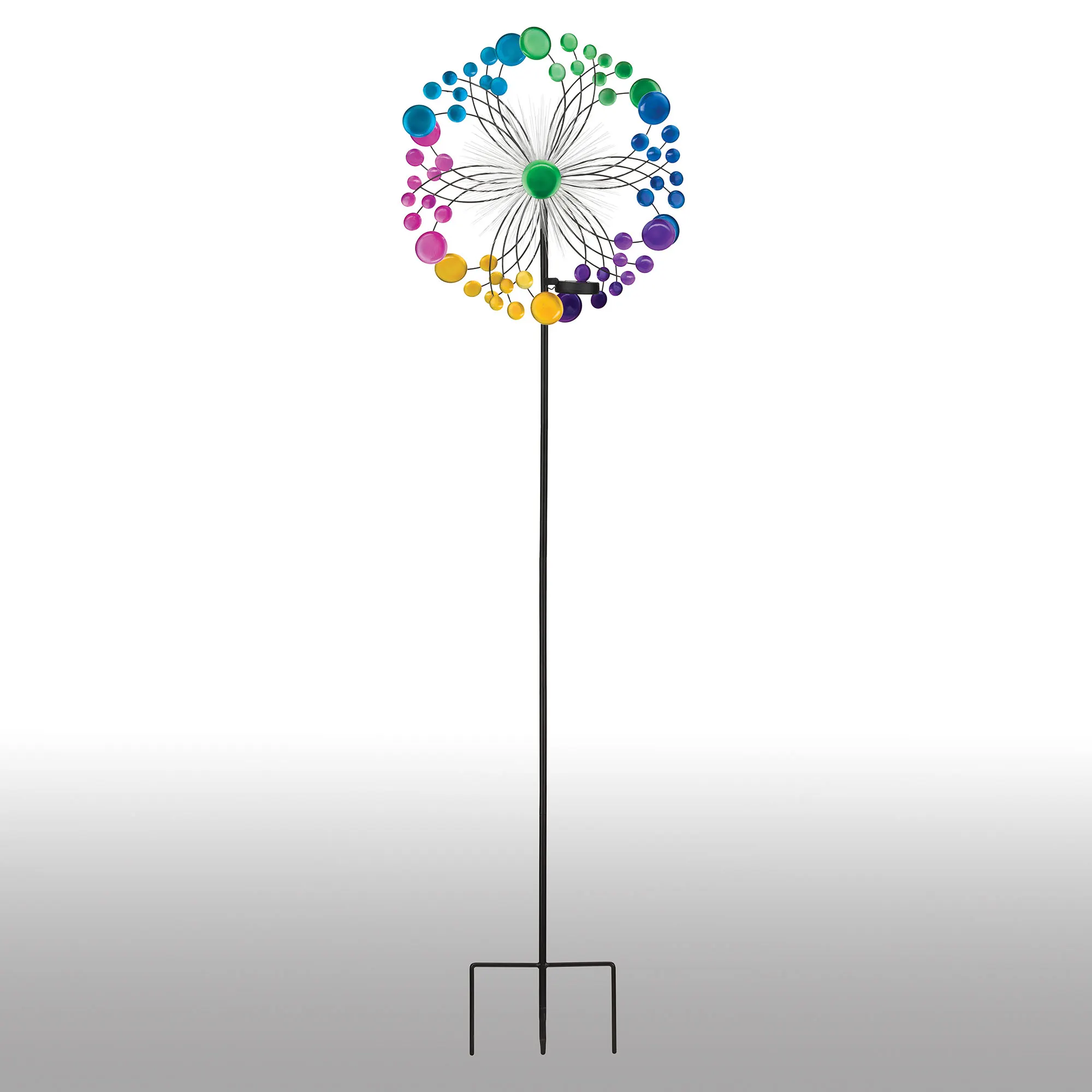 Bold colors and charming fiber optics emit a Radiant Glow from this wind spinner. In weather- and fade-resistant finishes, the metal design features two spinning blades that rotate in opposite directions, both accented with blue, green, purple, pink, and yellow dots. Behind the center green dot, fanning solar-powered fiber optics emit light for 6-8 continuous hours through the night. One replaceable, rechargeable battery is included for the waterproof solar panels. The three-pronged ground stake provides a stable foundation. Perfect outdoors year round, the wind spinner measures 19"Wx7"Dx68"H.