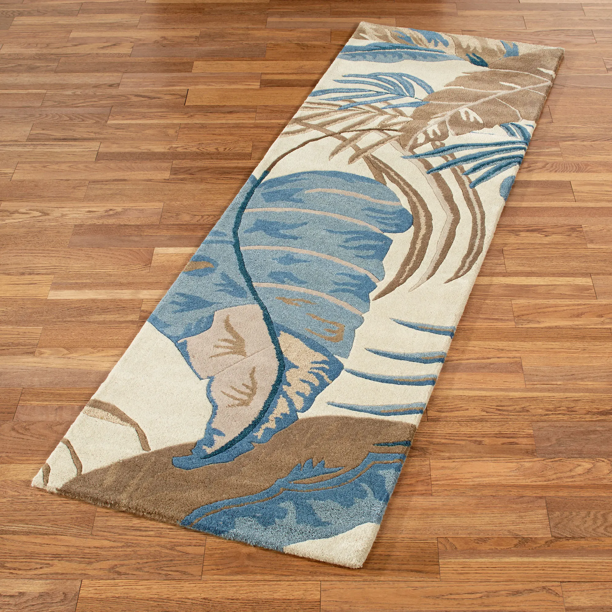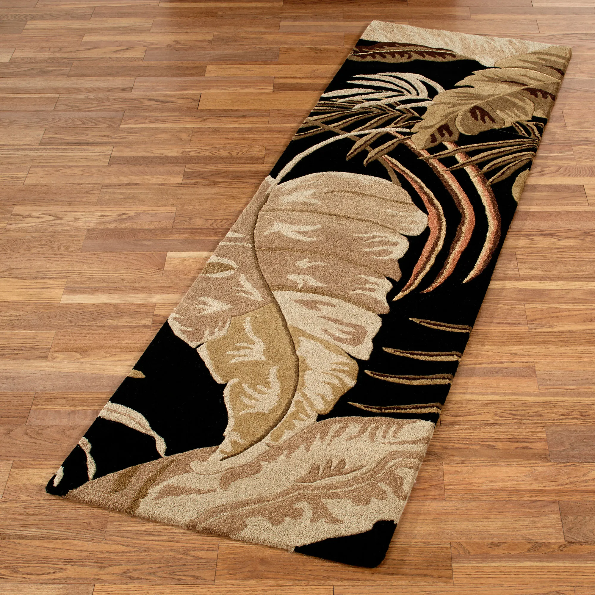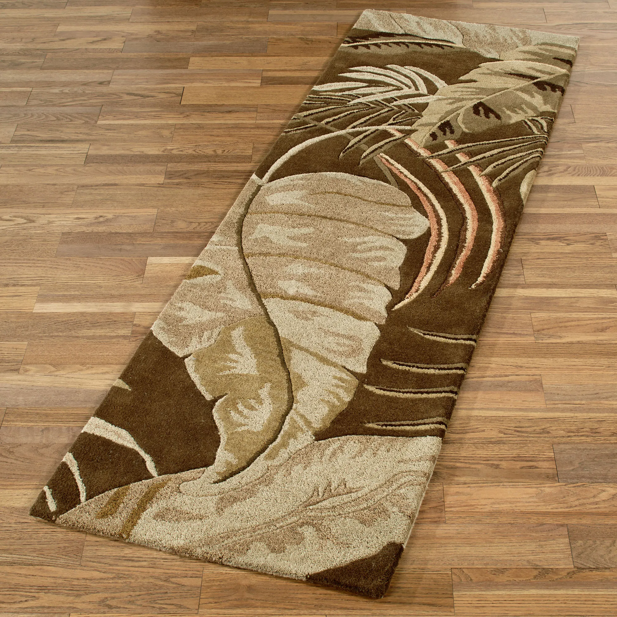 You can almost hear the sounds of the Rainforest with this tropical rug runner. The multi-textured, .5" thick wool rug, with hard twist accents, has oversized tropical leaves and fronds on a solid color background. Hand-tufted and handcarved in India. We recommend professional cleaning by a rug cleaner.
