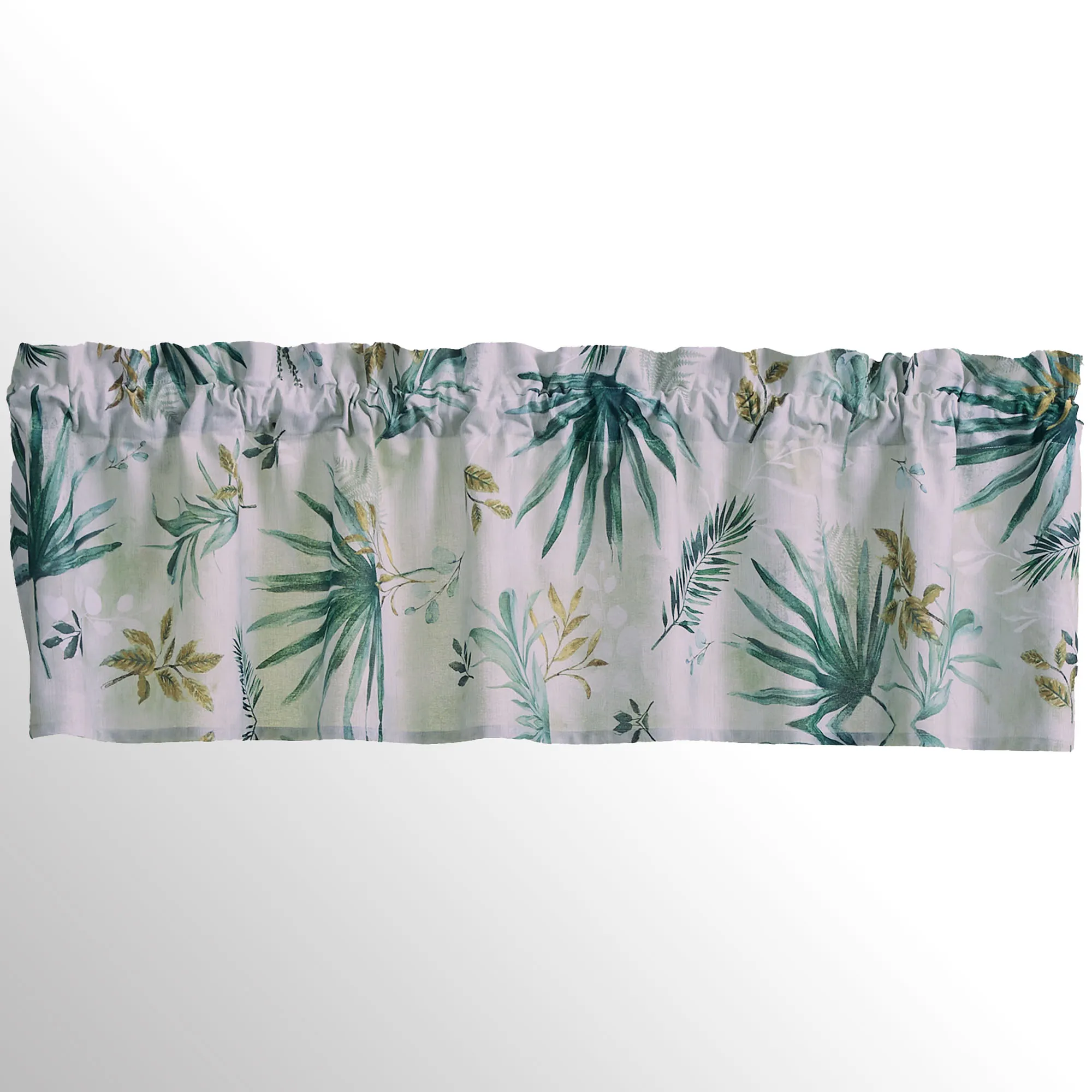 Journey to the Rainforest with a charming window valance designed by Patricia Heaton. Printed in vibrant natural greens, exotic palm fronds and leaves cascade across the white and sage cotton window design. Rod pocket is 2". Tailored valance measures 60"Wx14"L. Machine washable. Imported.