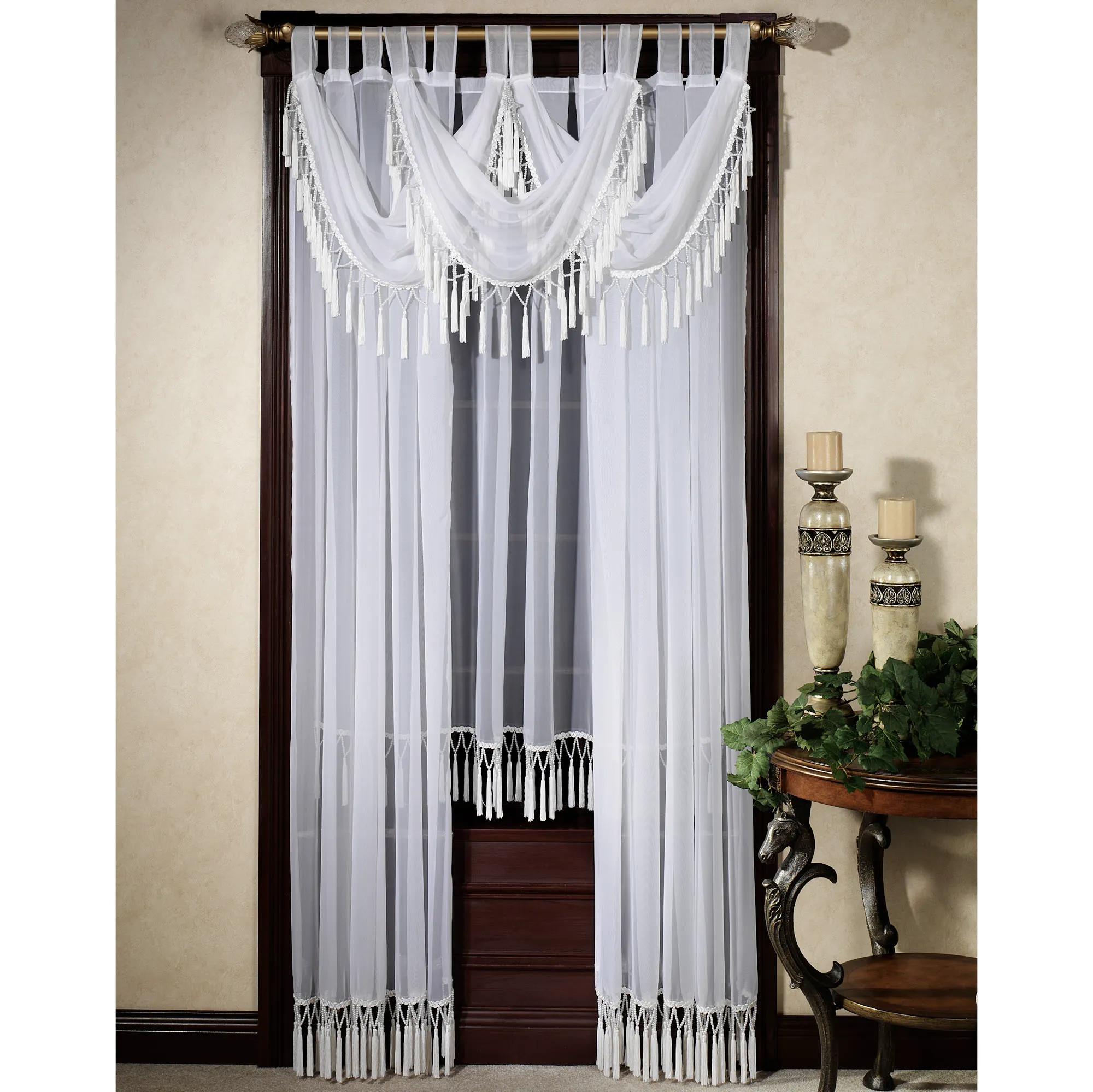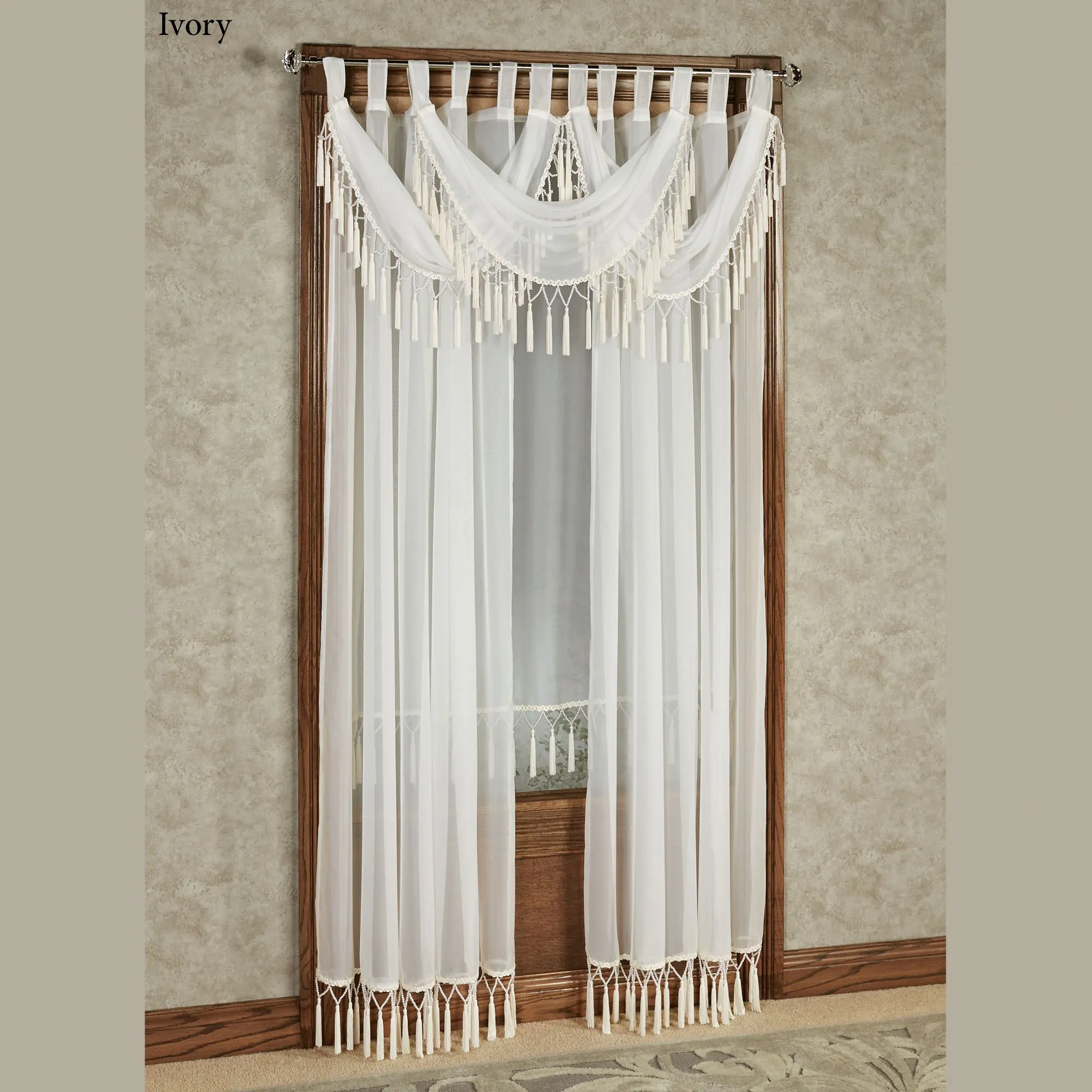 The romantic Rajah Pearl Window Treatment is soft, semi-sheer polyester voile with tassel fringe, braided gimp trim, and faux pearl beading for elegance. Hook-and-loop fasteners make styling easy. Specify Tab Curtain Panel, 60"W; or Tab Swag Valance, approx. 32"Wx29"L. Dry clean. Imported.