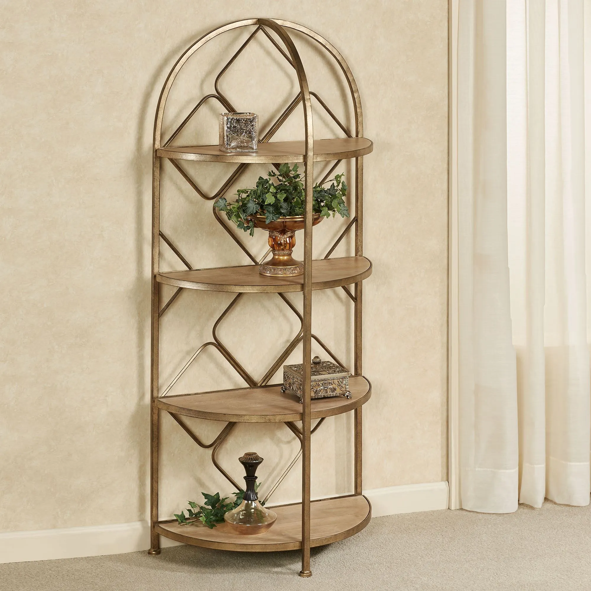 The Raleigh Floor Display Shelf is a perfect blend of modern and traditional style. Made of metal, this aged gold floor shelf features openwork diamond designs. The space between the wooden shelves is 13". Overall, measures 26"Wx14"Dx59.5"H; weighs 29 lbs.
