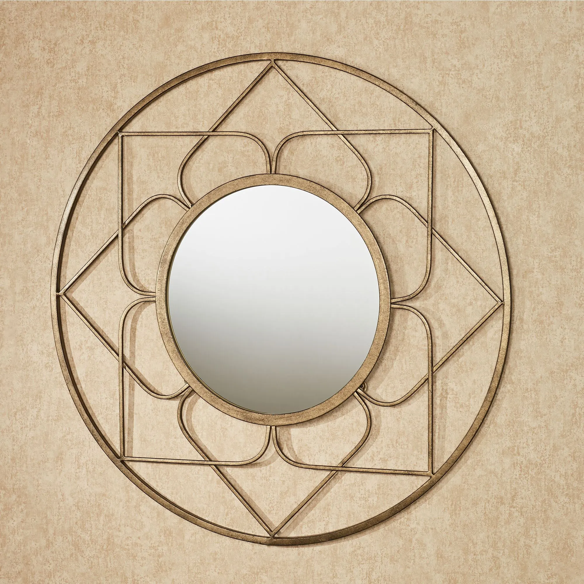 The Raleigh Wall Mirror is the perfect blend of modern and traditional styles. Made of metal, this aged gold wall mirror has a glass mirror inset and an openwork diamond design. Measures 32"dia.x2"D.