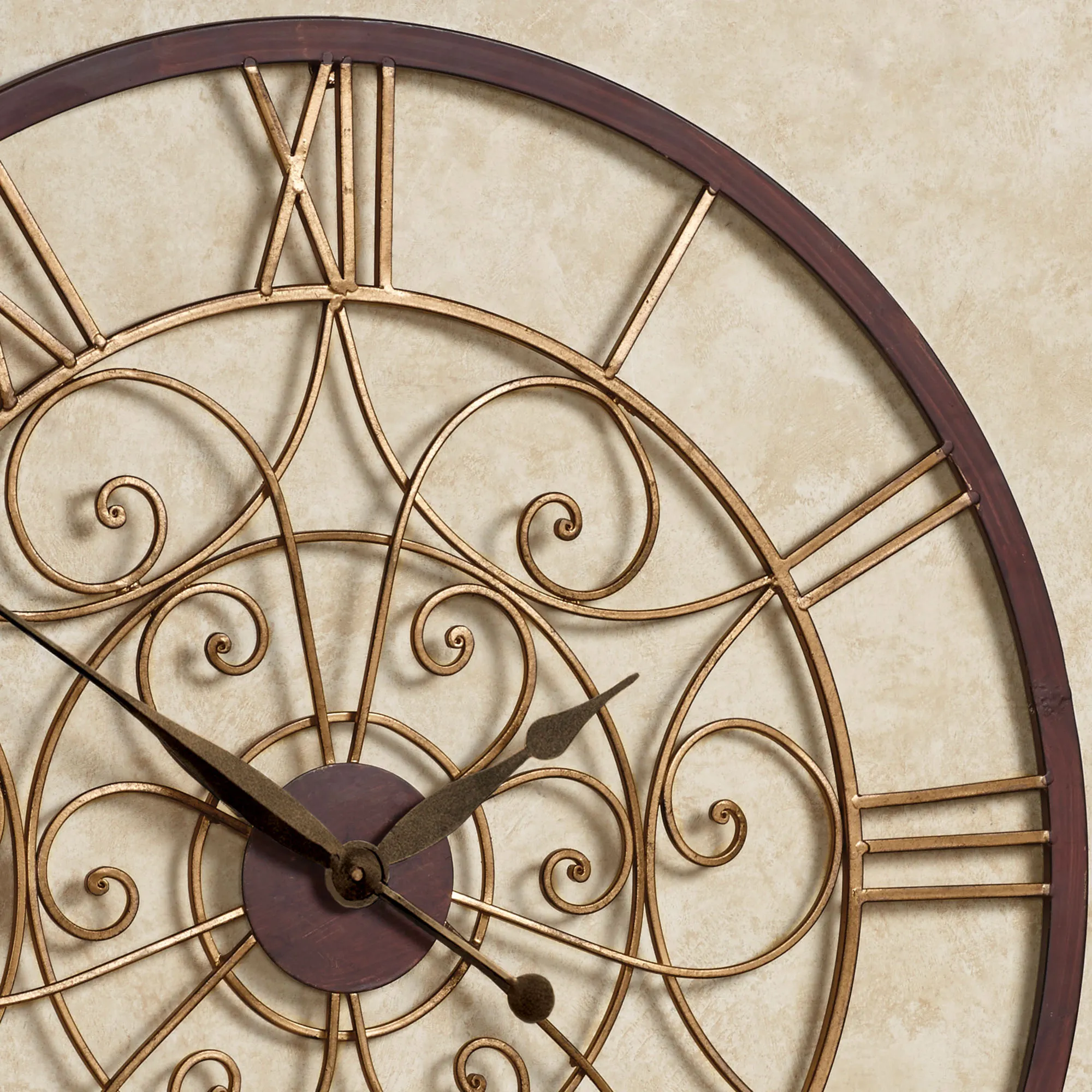 The Ralston Round Metal Wall Clock is a sophisticated way to display the time. Openwork, metal wall clock has Roman numerals and scrolls that are finished in antique gold. Hands and outer frame are finished in bronze. Quartz movement uses your AA battery. Wall accent measures 30" dia.