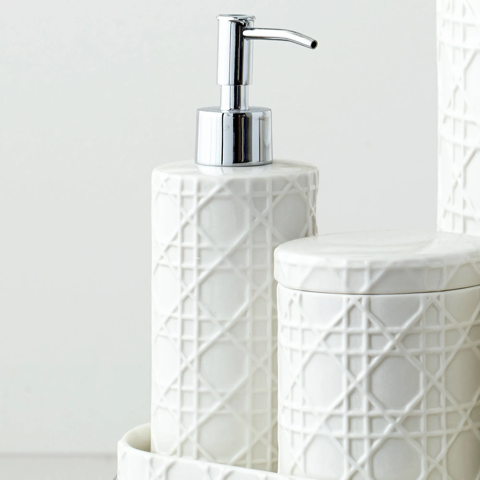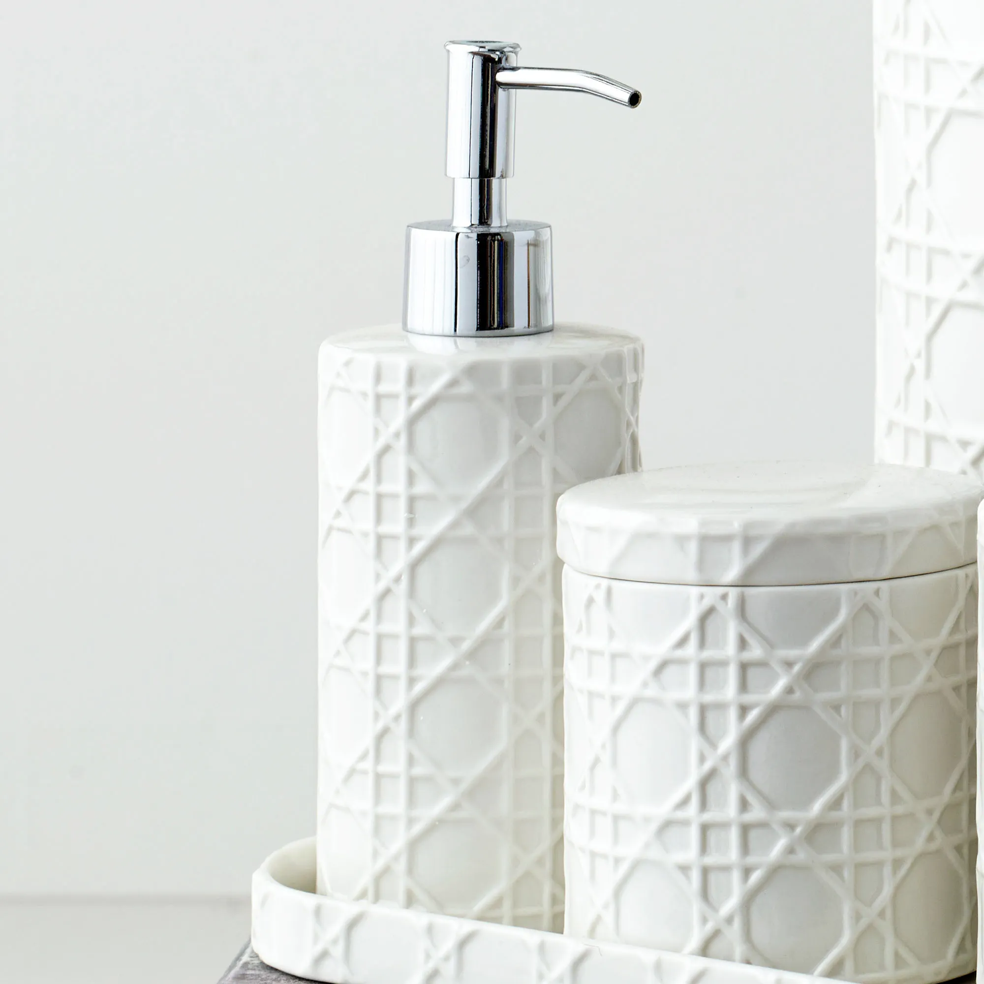Resembling the look of woven Rattan, these charming bath accessories have embossed details. Porcelain bathroom accents are solid ivory. Accessories are sold individually. Choose Vanity Tray, Lotion/Soap Dispenser, Covered Jar, Tumbler, Wastebasket, Toothbrush Holder, Soap Dish, or Tissue Cover. Hand wash.