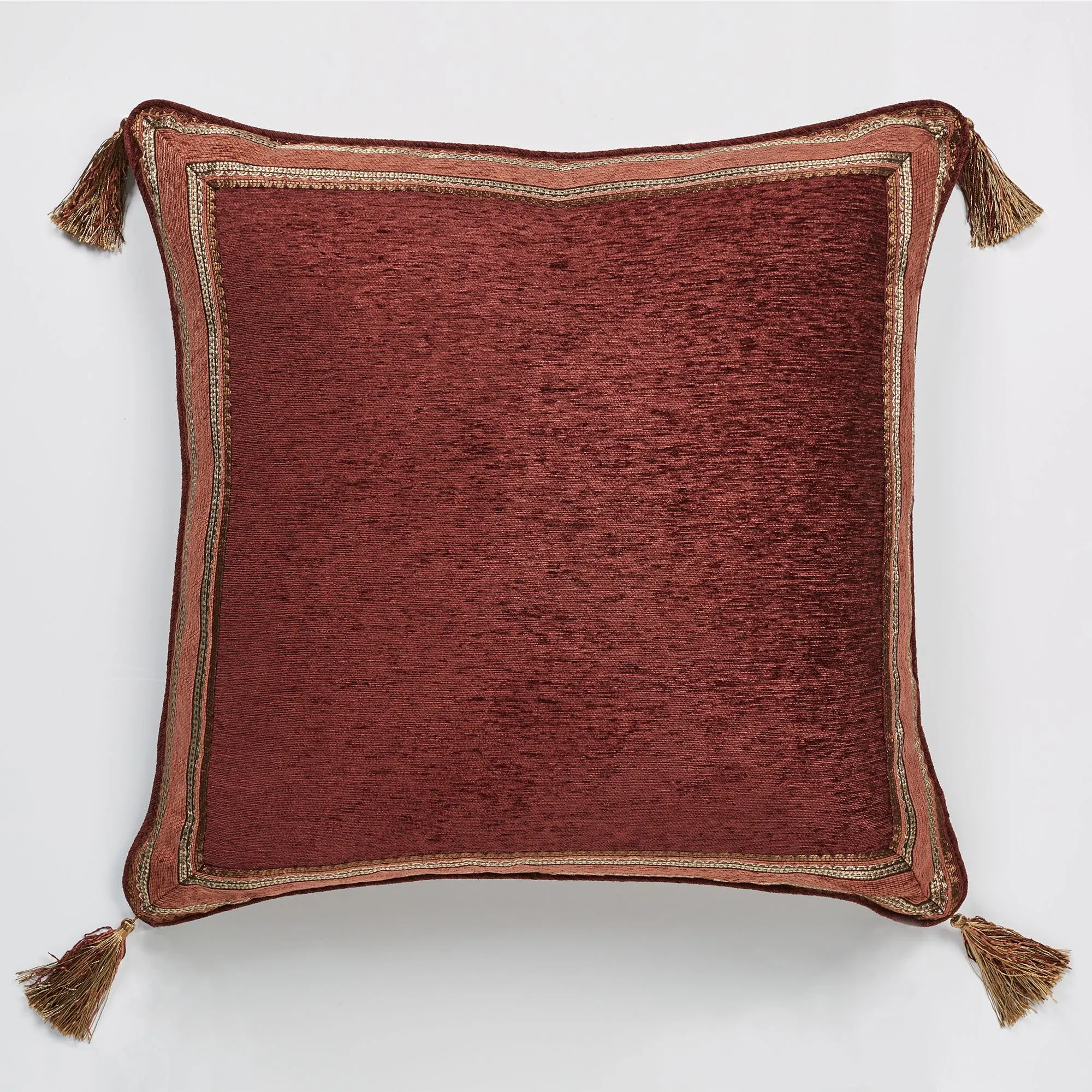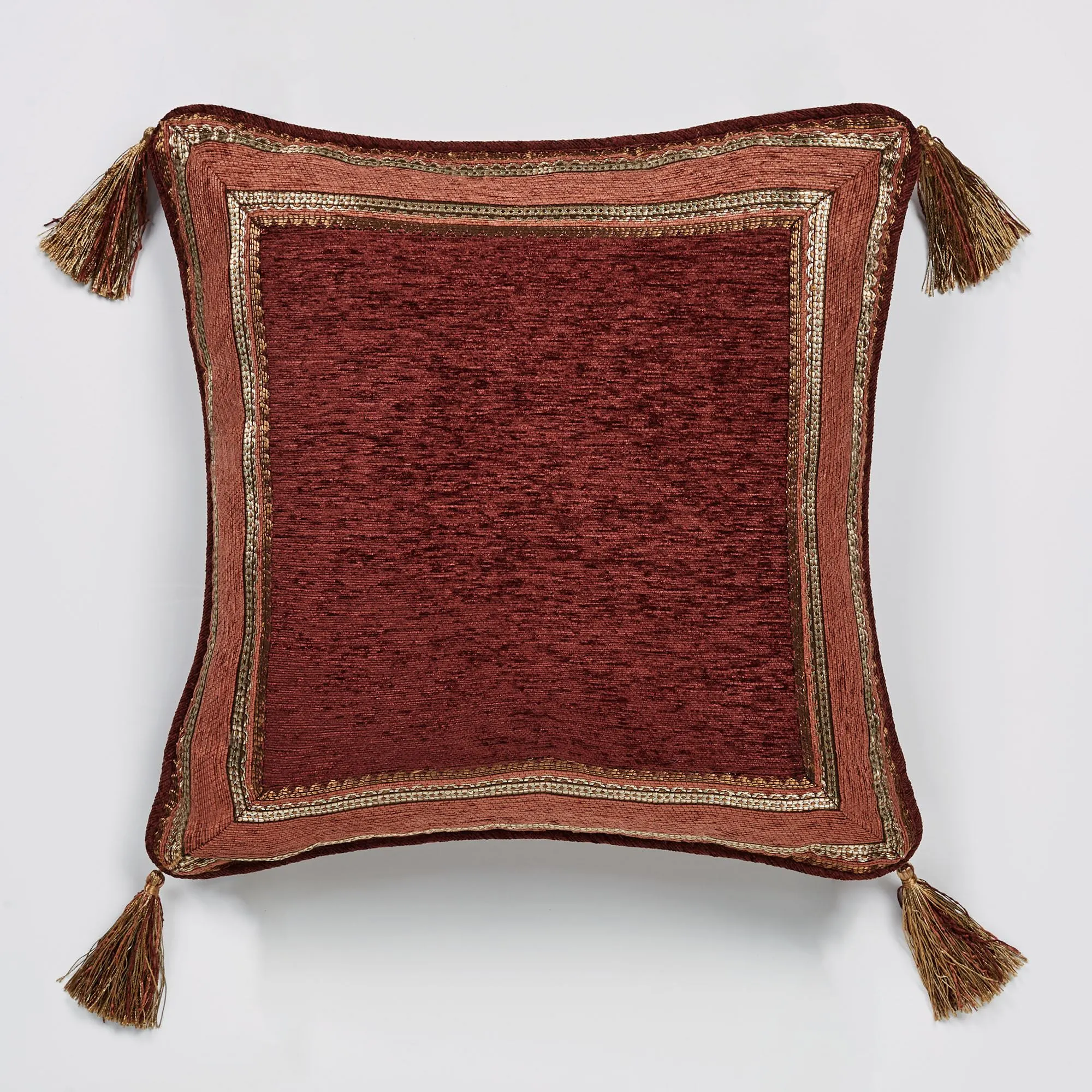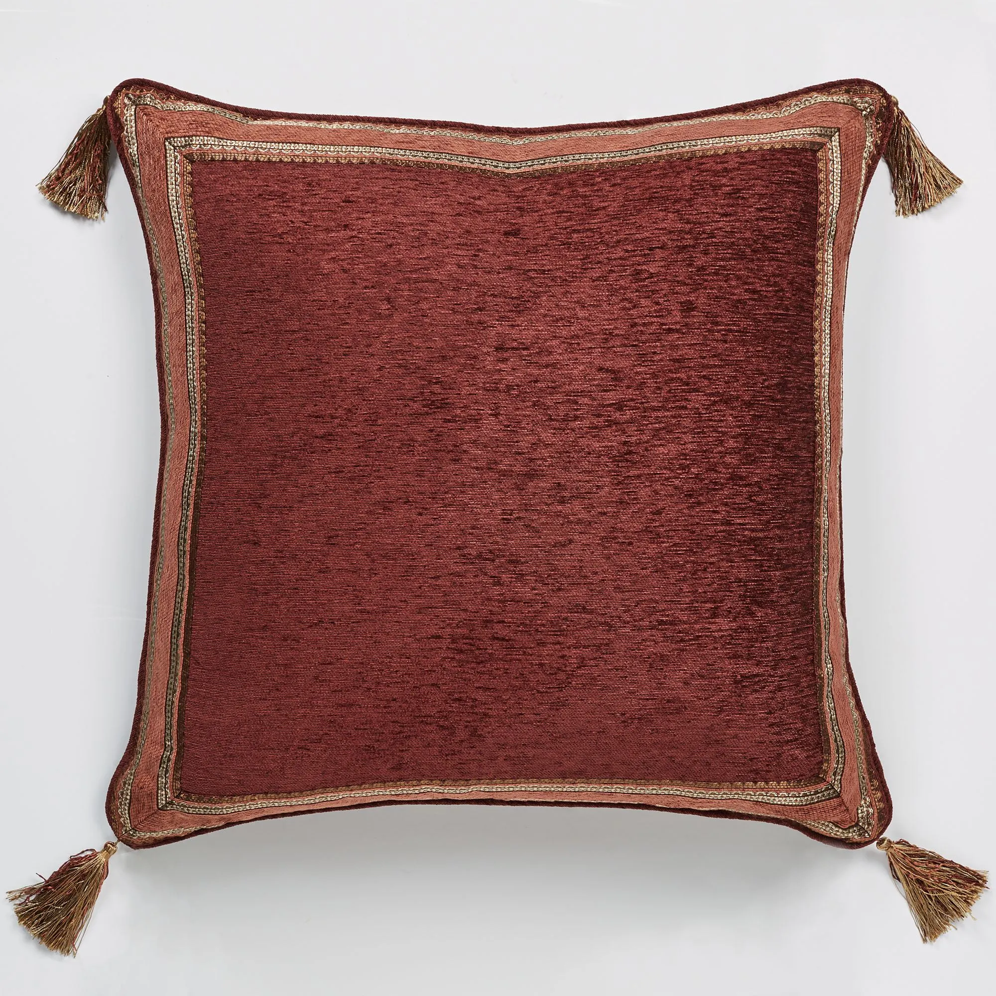 The piped European Sham has a port chenille center pieced with a mitred stripe frame, 4" corner tassels, and a zipper closure. European sham may be monogrammed for an extra charge. Monogramming is shown in the Gold thread color.