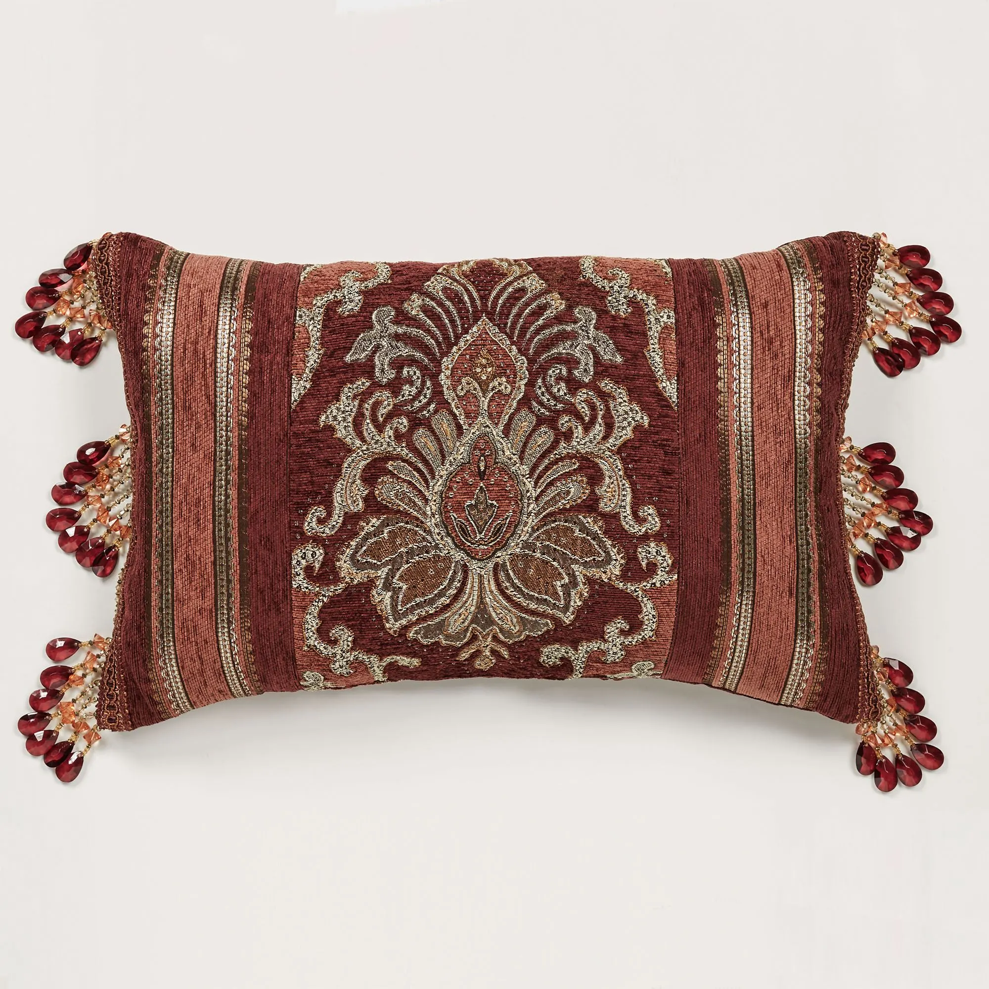 Pillows: Spot clean. The piped Round is solid port chenille with damask embroidery and a 2" side gusset. The pieced Rectangle has damask designs, stripes, and beaded trim on the length ends. The tailored Square has a port chenille center pieced with a mitred stripe frame, 4" corner tassels, and a zipper closure. Square pillow may be monogrammed for an extra charge. Monogramming is shown in the Gold thread color.