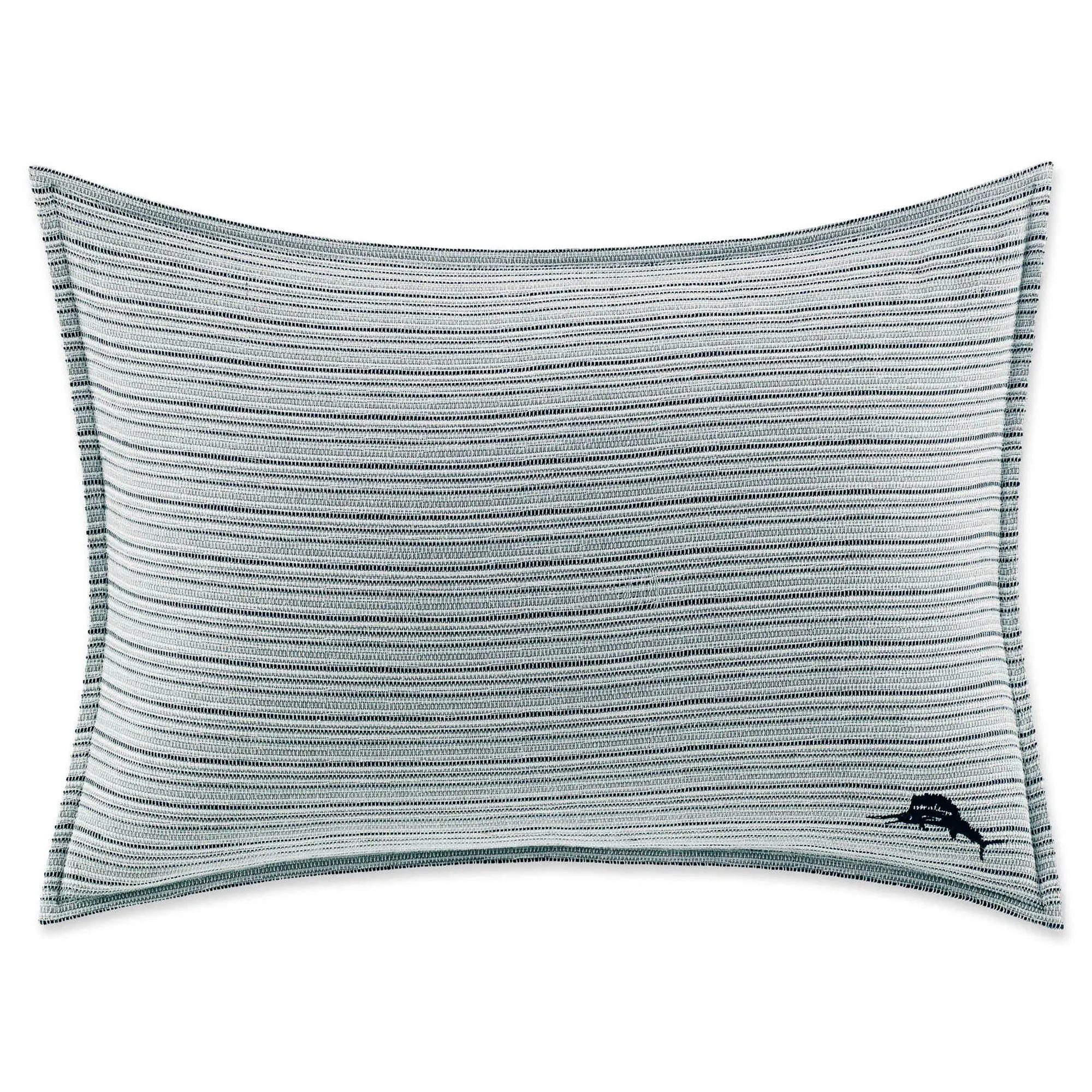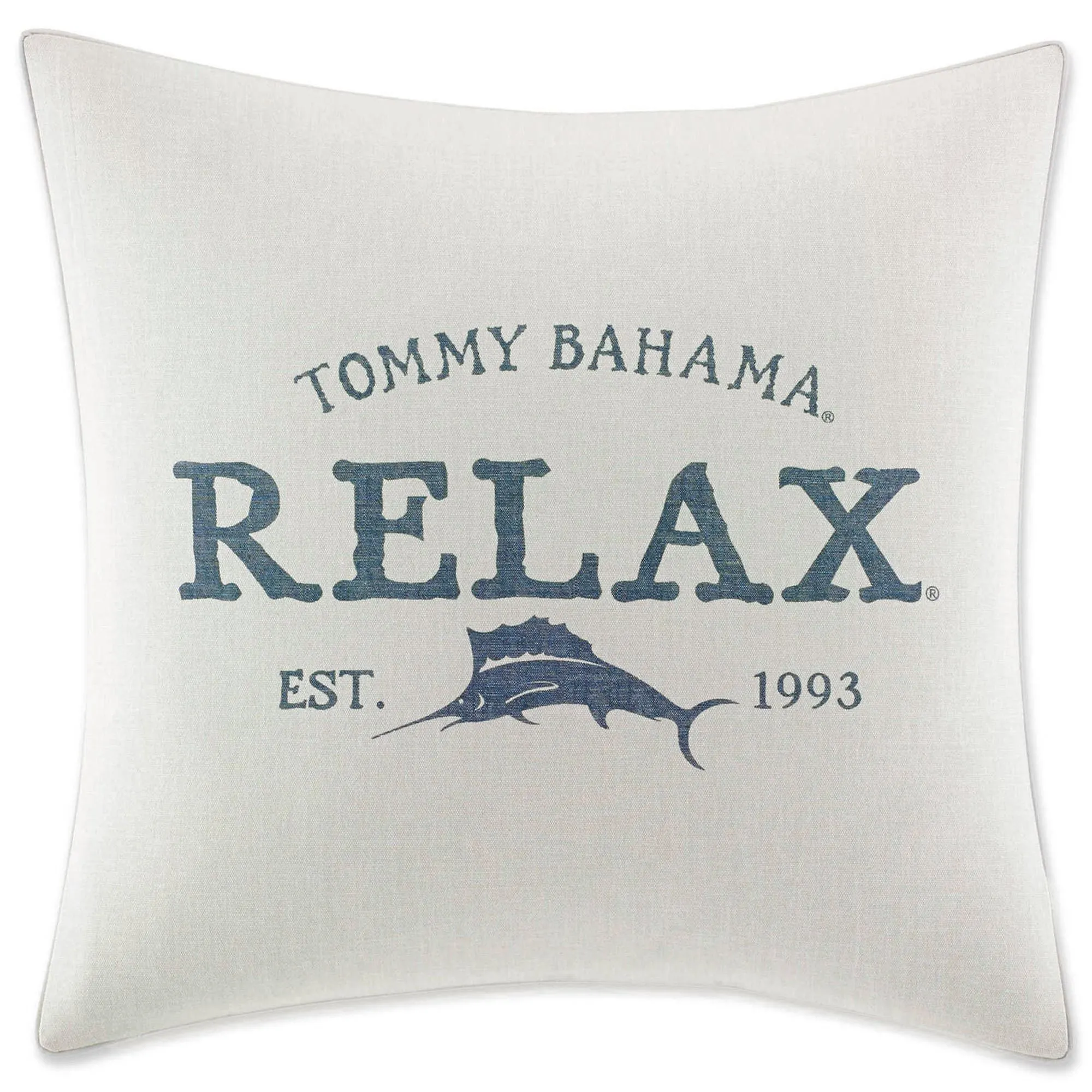 Pillows are cotton with French back closures. Insert is polyester; spot clean insert. Imported/USA. Rectangle contains woven stripes, an indigo embroidered Tommy Bahama(R) swordfish logo in the bottom corner, and mini-flanged edges. Piped 20" Square is off-white with the steel blue printed words "Tommy Bahama Relax" along a swordfish logo and "EST. 1993." Hand wash casing. Piped 22" Square features a steel blue pineapple with embroidered "Tommy Bahama" in the bottom corner. Hand wash casing.