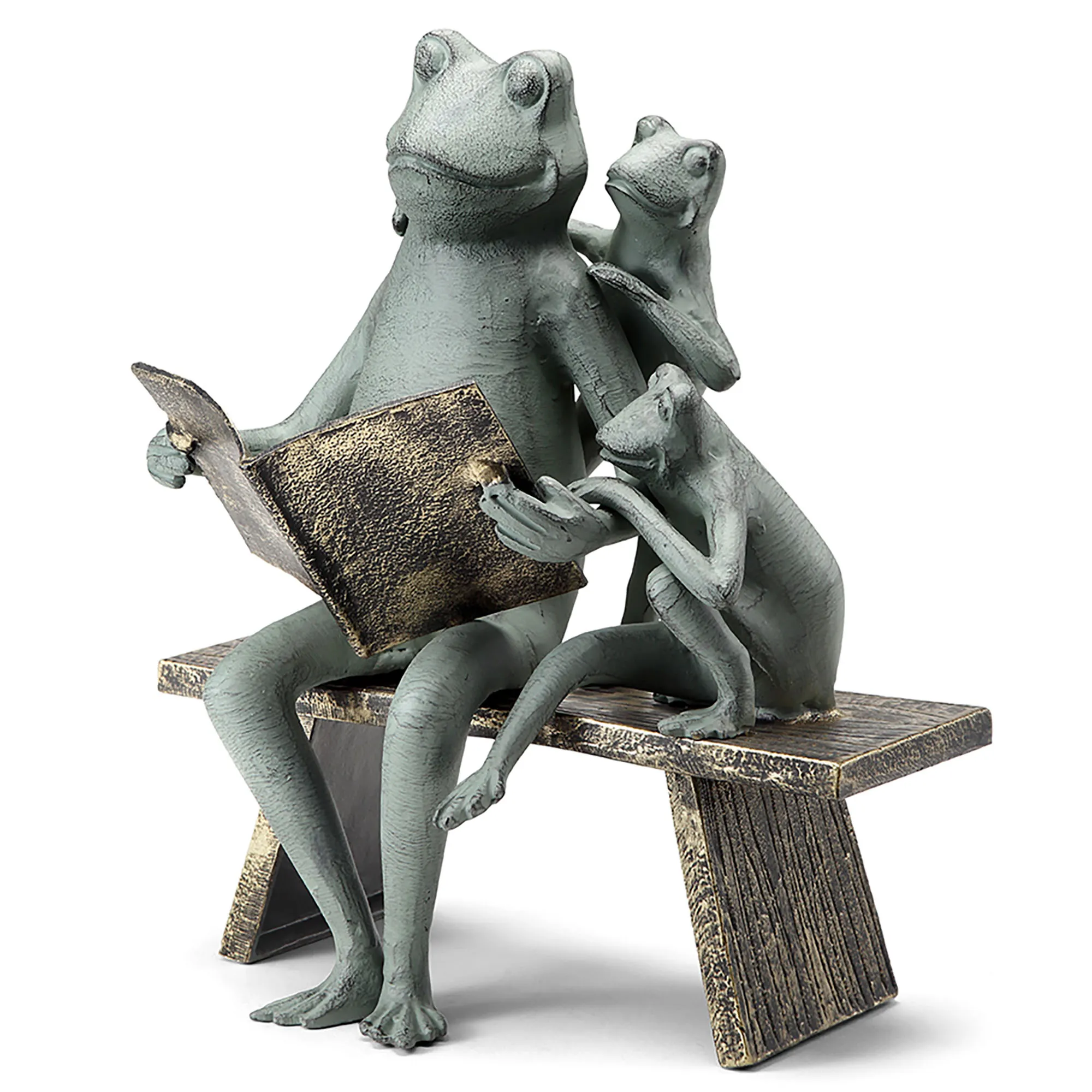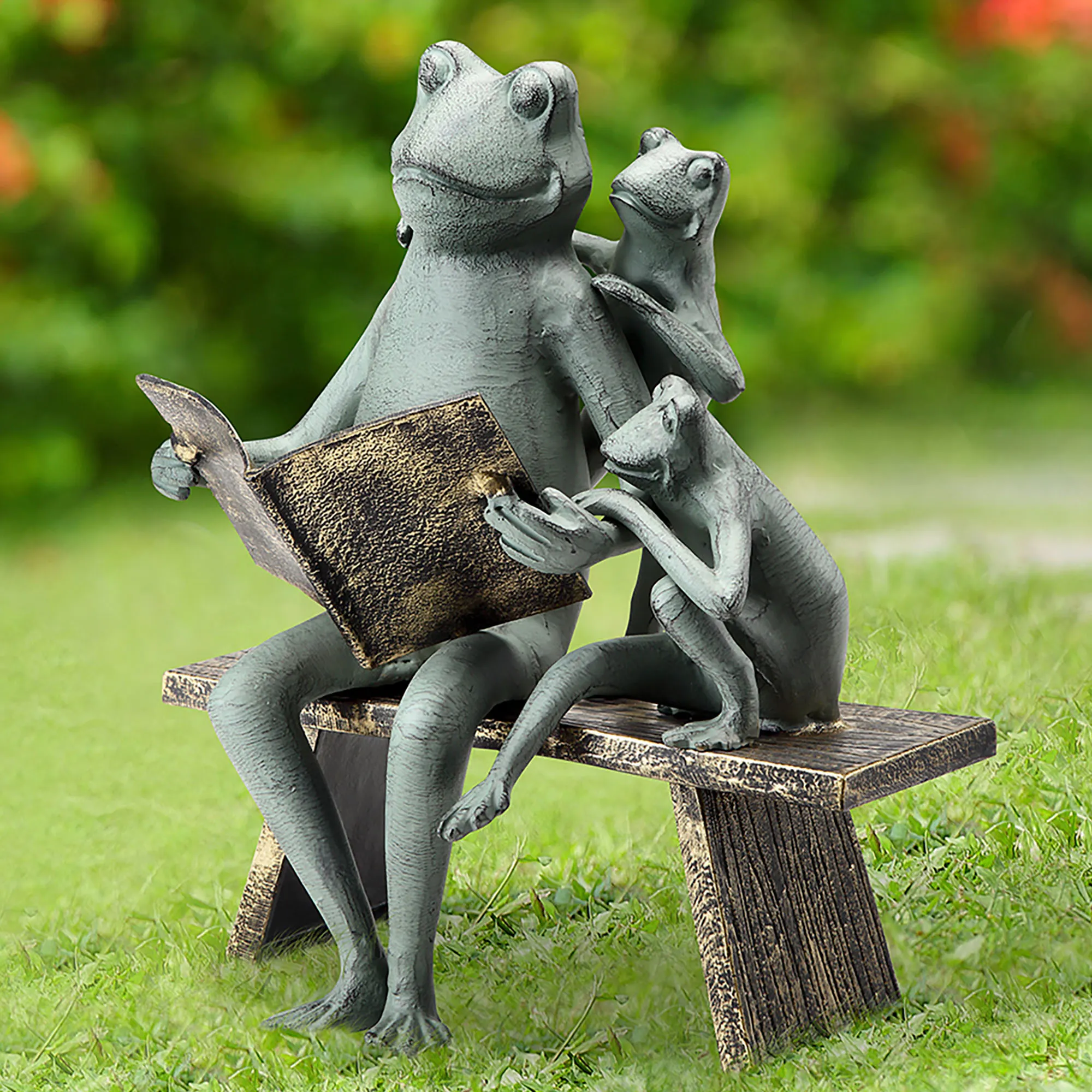 The Reading Frog Family Garden Sculpture promotes togetherness. This hand-cast aluminum frog garden sculpture has hand-rubbed verdi green and bronze finishes and features a whimsical scene. Indoor or outdoor year-round use. Measures 13"Wx9.5"Dx15.5"H.