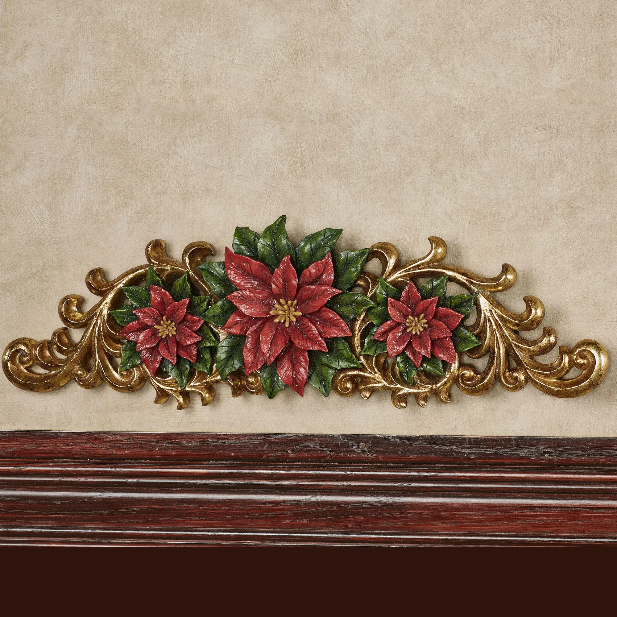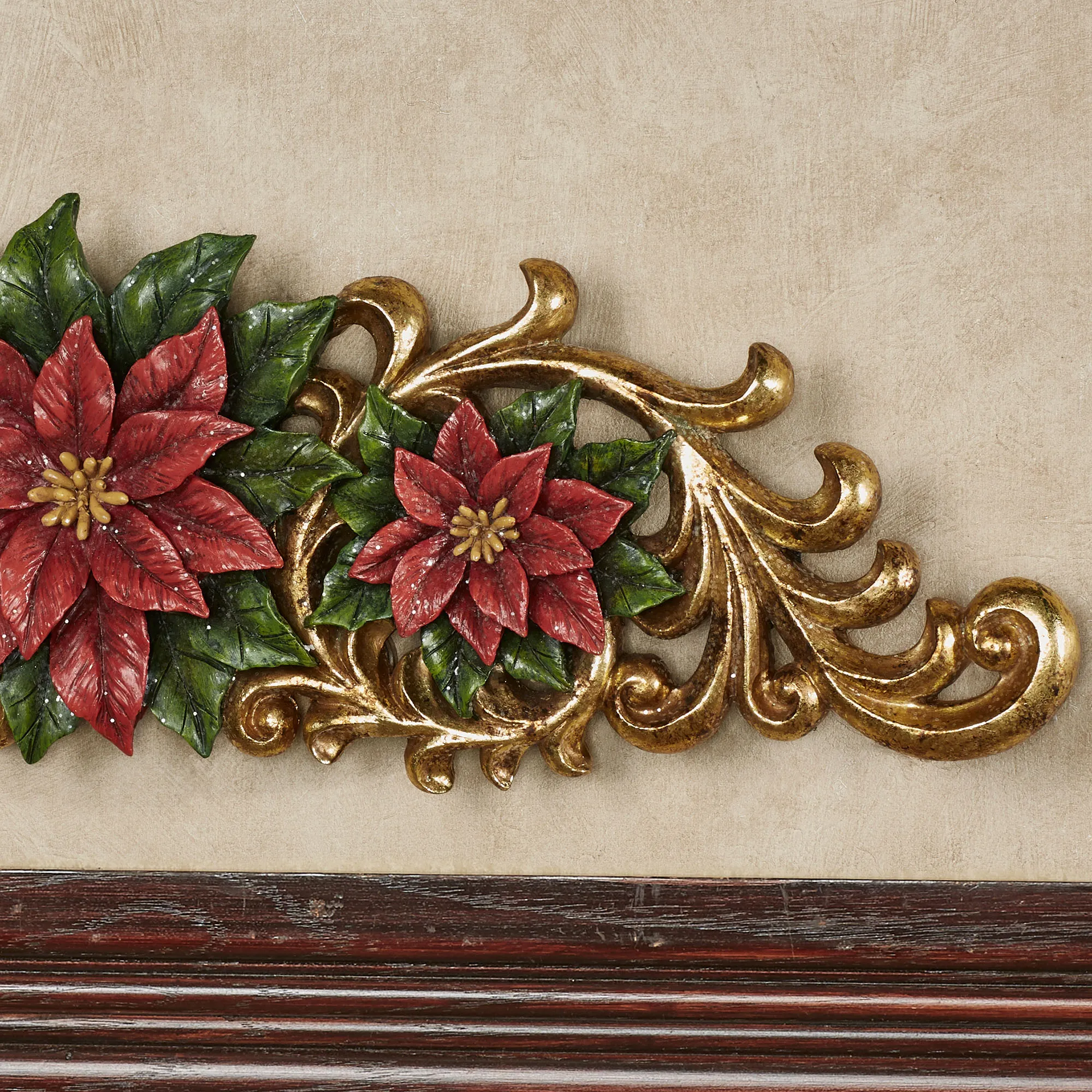 Red Poinsettias, green leaves, and leafy swirls mingle together to create a beautiful seasonal display. Made of resin, this holiday door topper has a gold finish along with gold leaf, antiquing, and glitter accents. Poinsettia door topper measures 26"Wx2"Dx7.5"H.