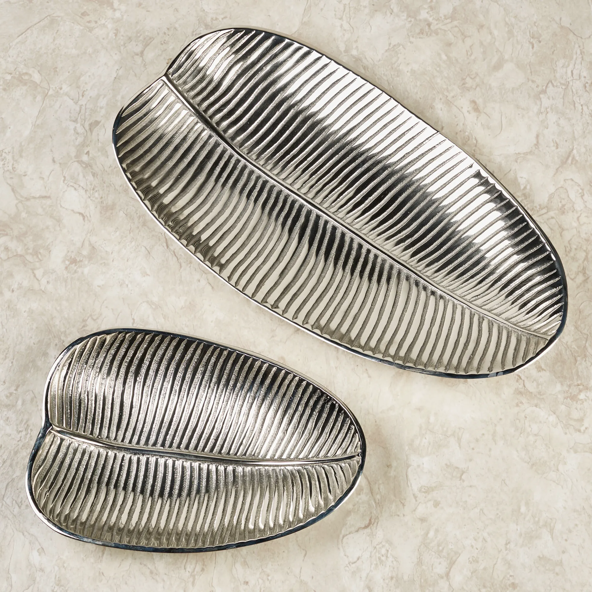 Just as large green fronds hold rainwater in the jungle, the Redmond Decorative Dish will display your items in true tropical splendor. Crafted from nickel, the metal dish features ribbed vein accents in a realistic leaf shape. Decorative use only. Sold separately. Large is 20"Wx11"Dx2.5"H. Small measures 12"Wx8.5"Dx2"H.